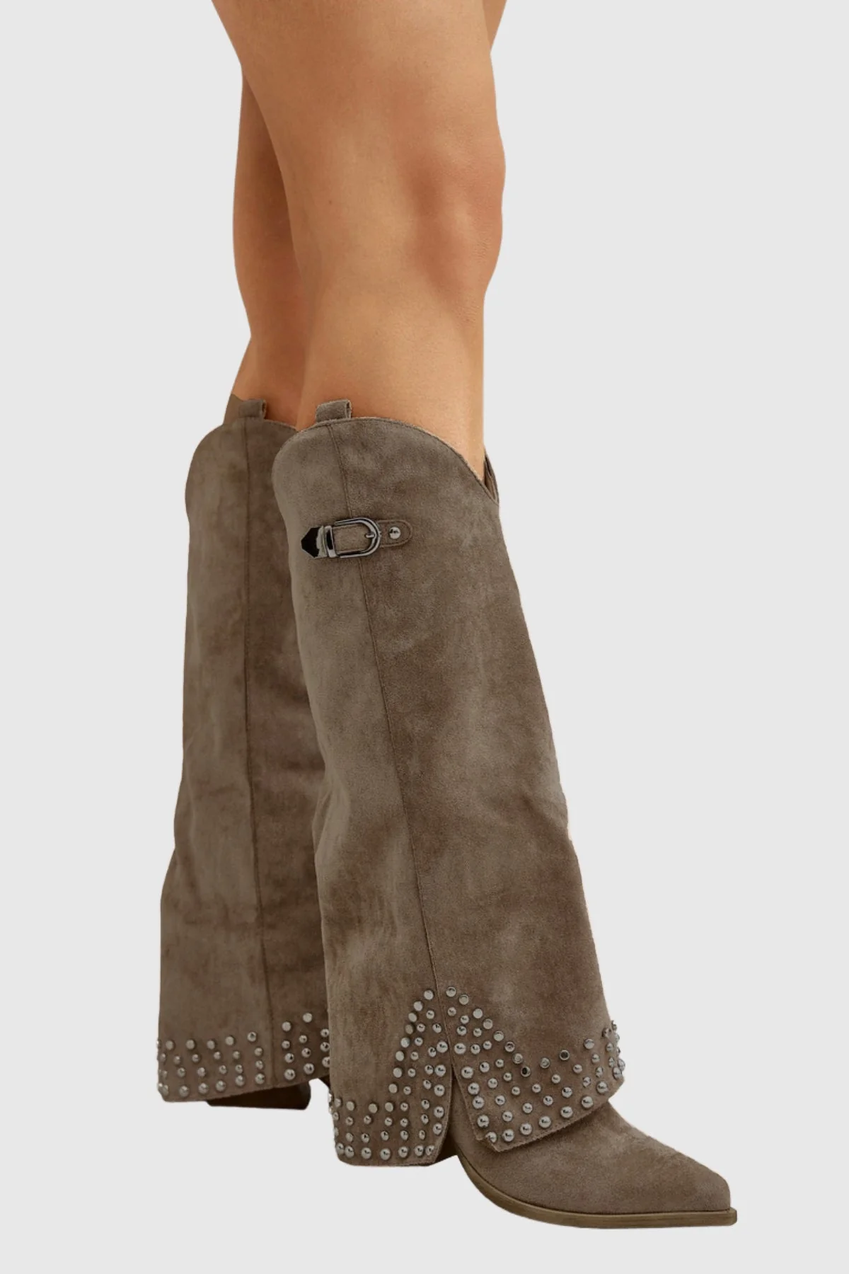 Discover the must-have Studded Brown Suede Boots . Crafted with high-quality suede and intricate detailing, these durable boots offer both style and comfort. Their timeless design with an 8 cm heel is perfect for any occasion, elevating any outfit effortlessly.
