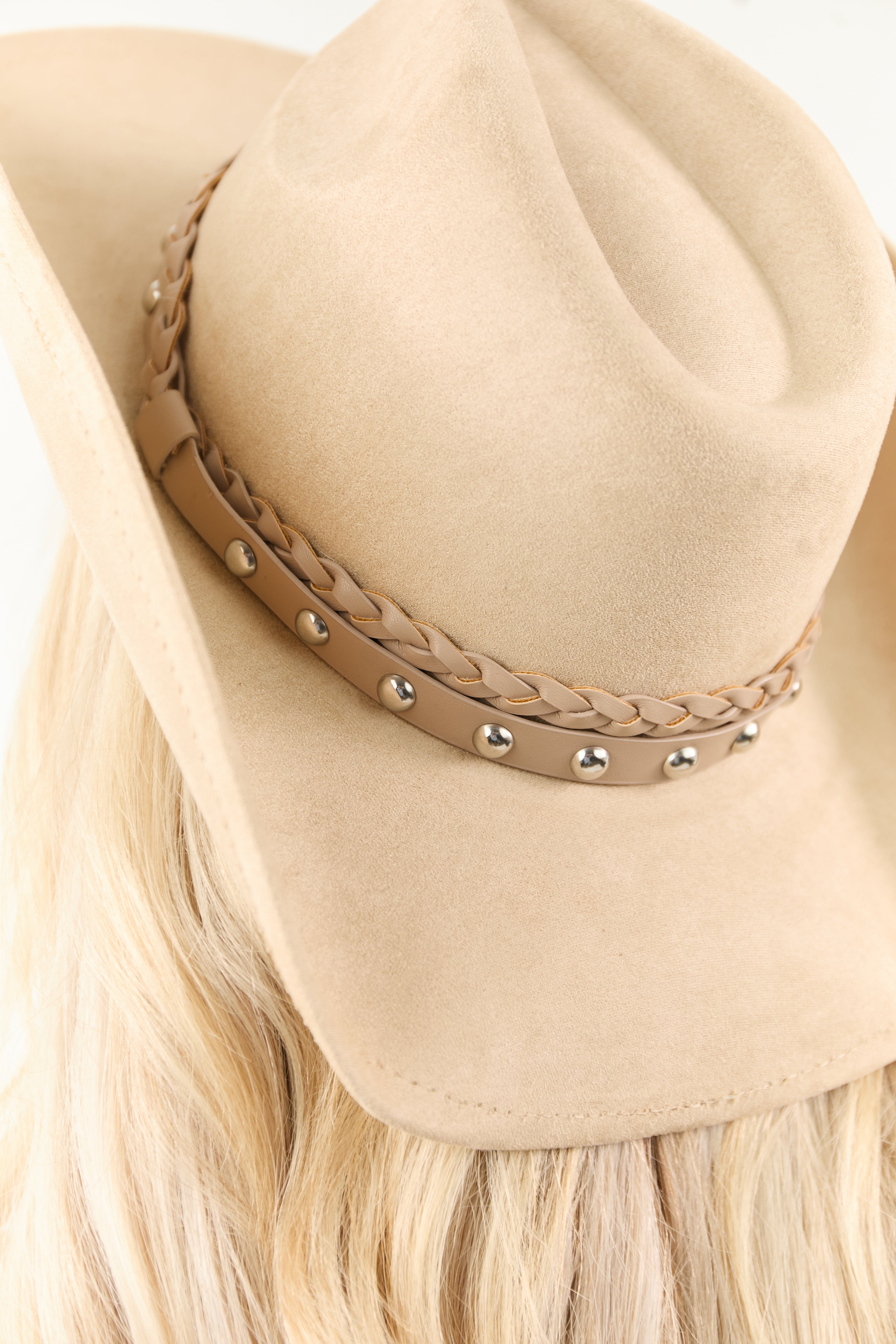 Upgrade your accessory collection with this stunning faux suede cowboy hat in sand color. Adorned with braided details and silver studs, this hat features a curved brim, dented crown, and One Size Fits Most design. Made of high-quality 90% Polyester and 10% Alloy, this trendy hat is a must-have for any fashion enthusiast. Elevate your look with this fashionable and versatile piece.