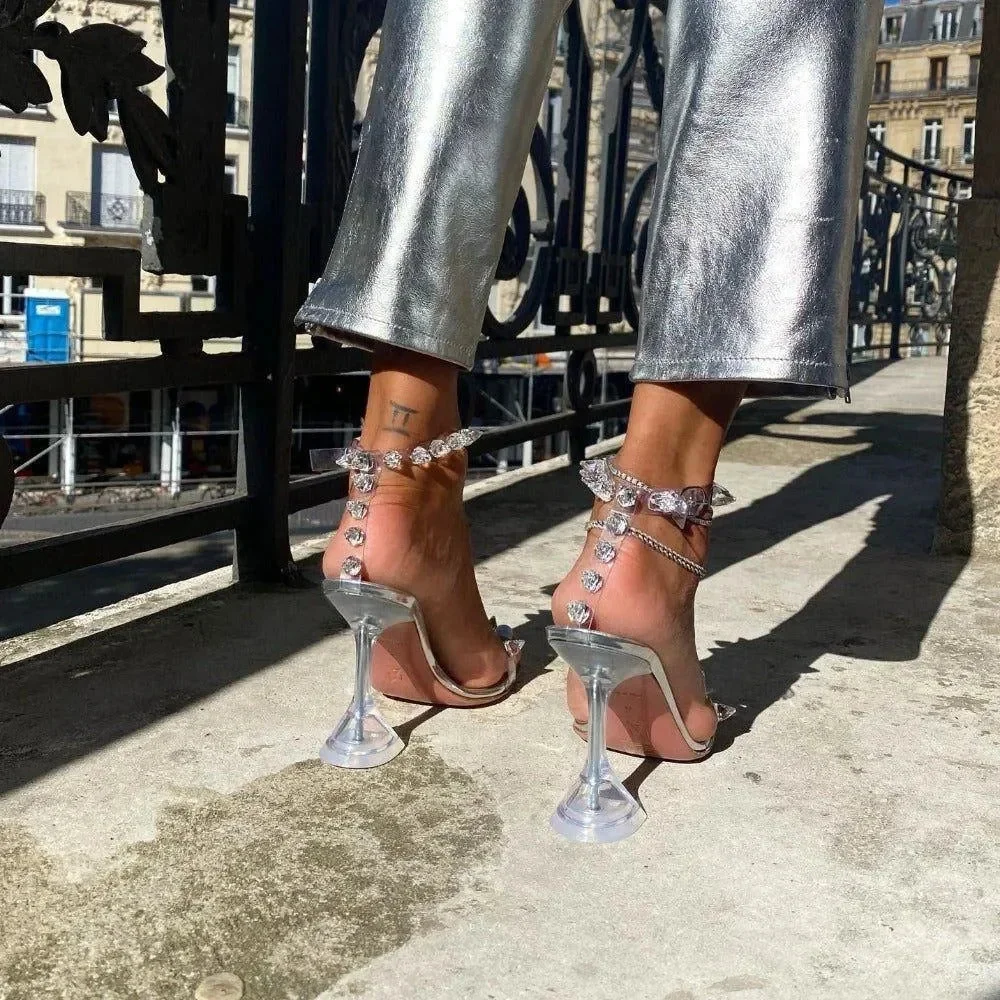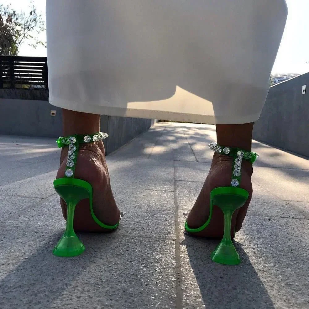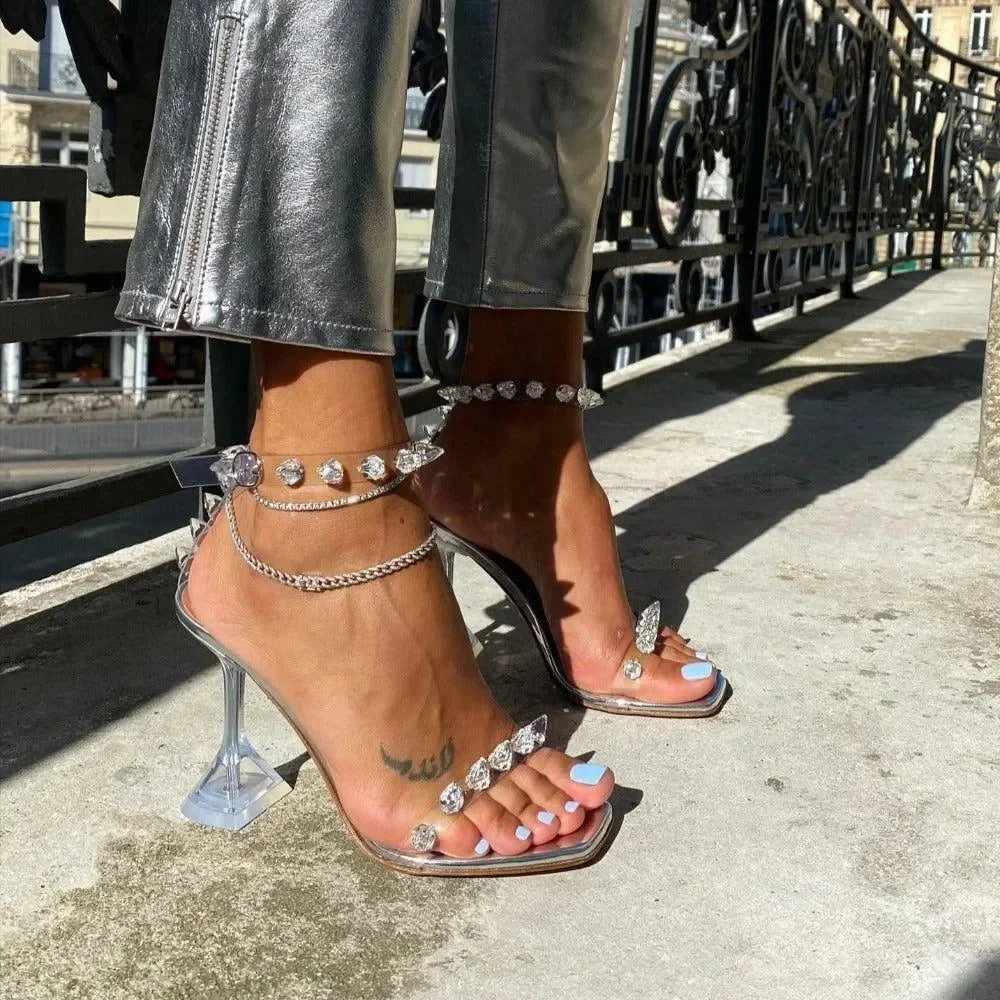 Elevate your style with our Studded Pyramid Heel Fashion Sandals. Made from premium materials, these sandals feature eye-catching pyramid studs for a bold and glamorous look. The sturdy heels offer great support, perfect for a night out or adding edge to your daily outfits. These versatile sandals with adjustable straps ensure a secure fit. Stand out with the unique studded design that pairs well with chic jumpsuits or stylish dresses. Follow our fashion updates on Instagram @mermaid_way. Enjoy a complimentary exchange for size adjustments. Available in various striking colors including Pink, Green, and Clear to match your unique style.