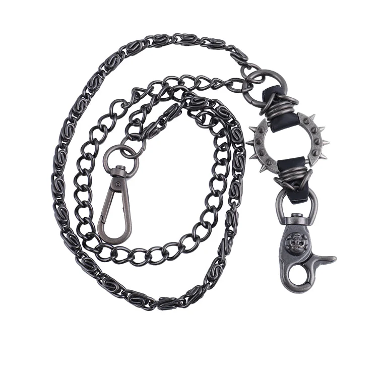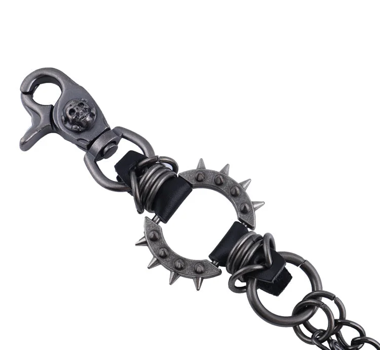 Discover the edgy Studded Skull Cogs Chain Wallet Chain, a killer double layer chain belt featuring ring clasps, skull embellishments, and cool studded cog design links. This unique accessory measures a length of 26 inches (66cm) and is crafted from high-quality stainless steel and alloy materials. Elevate your style with this statement piece that adds a touch of rebellious flair to any outfit.