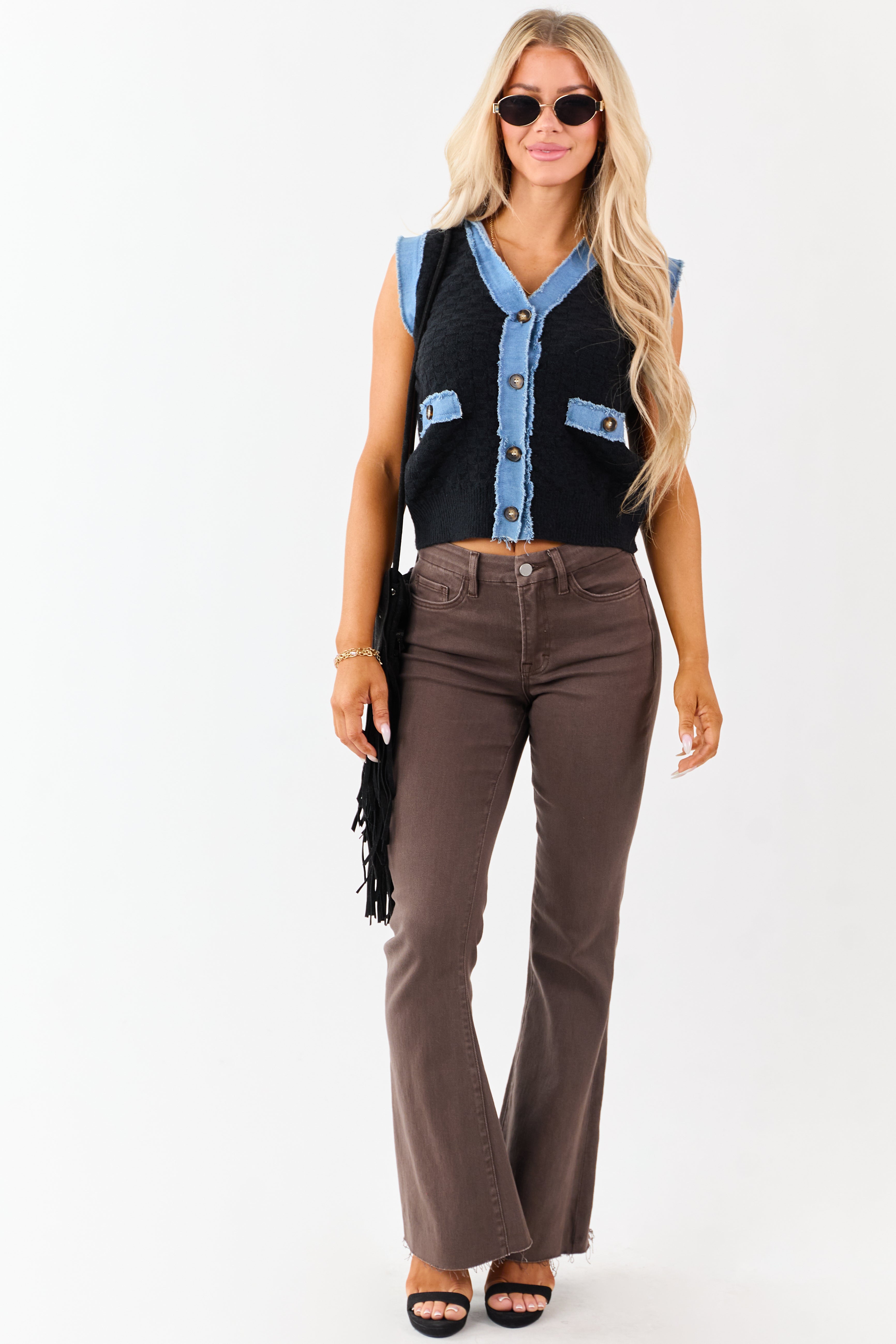Stylish Black Knit Vest with Denim Trim – Sleeveless Button-Down
