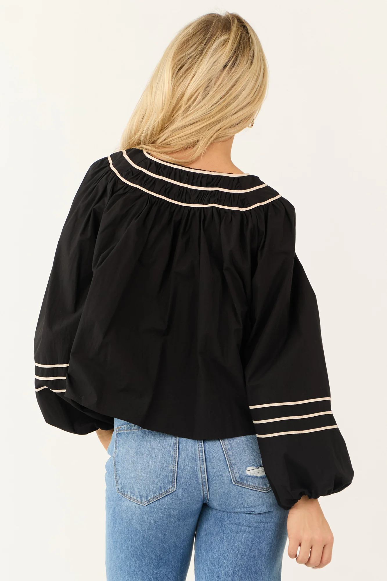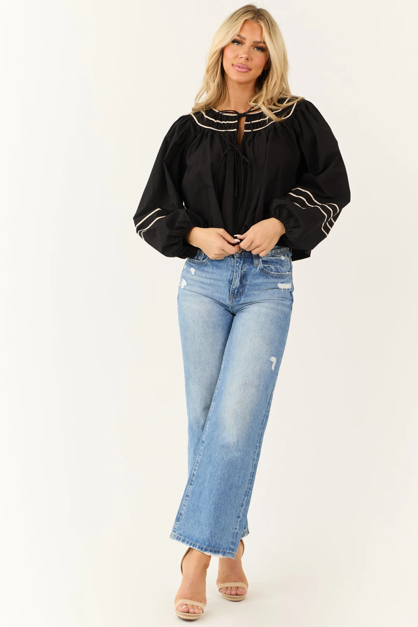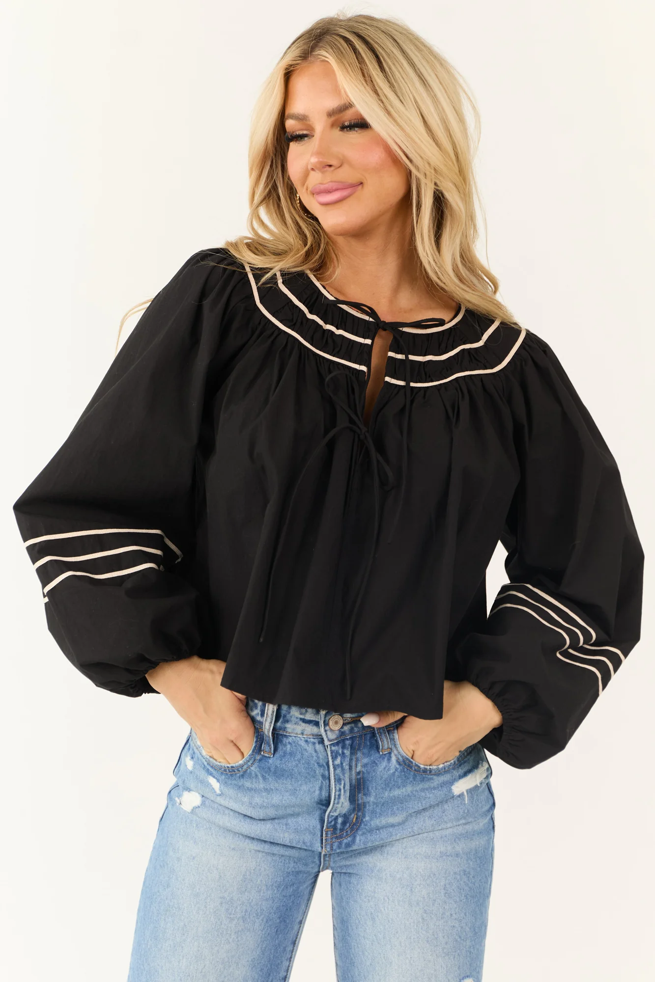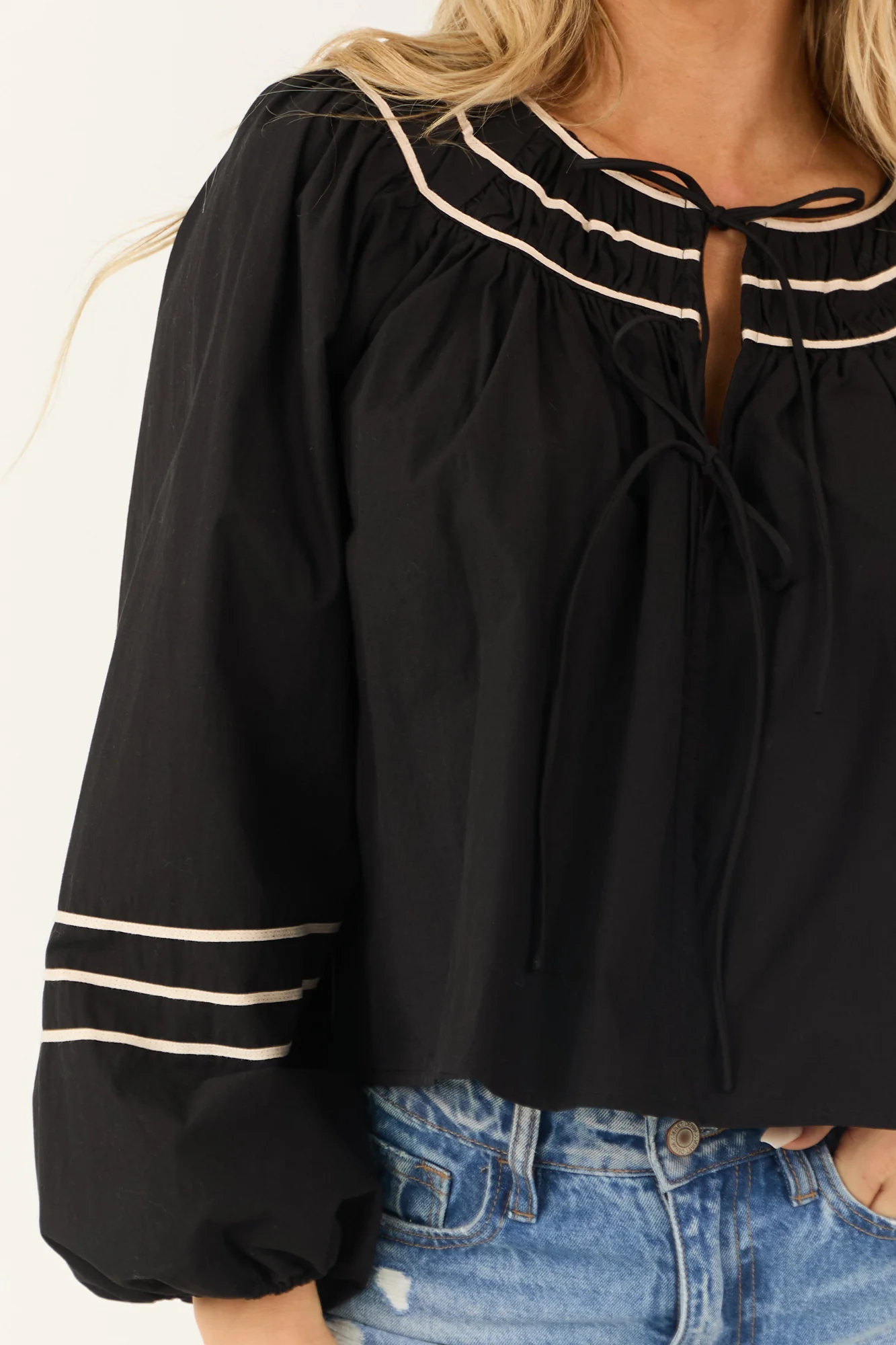 Elevate your wardrobe with our chic Black Tie Front Long Sleeve Top. Crafted from non-stretchy woven cotton for a sophisticated look. This piece features elegant puff sleeves with elastic cuffs, a flattering V-neckline with vanilla contrast trim, and a stylish tie front detail. Perfect for daytime outings or date nights, this top adds a touch of charm to any ensemble. Available in sizes S, M, and L. Hand wash cold, line dry, low iron if needed. Model is wearing a size Small.
