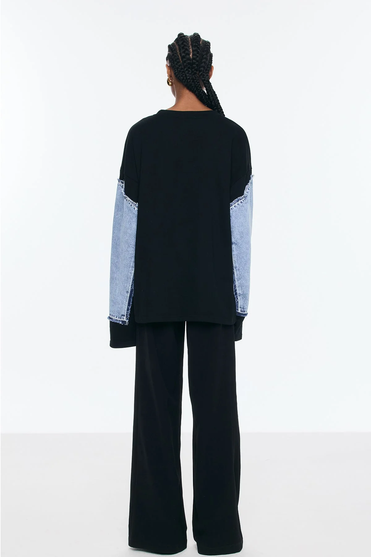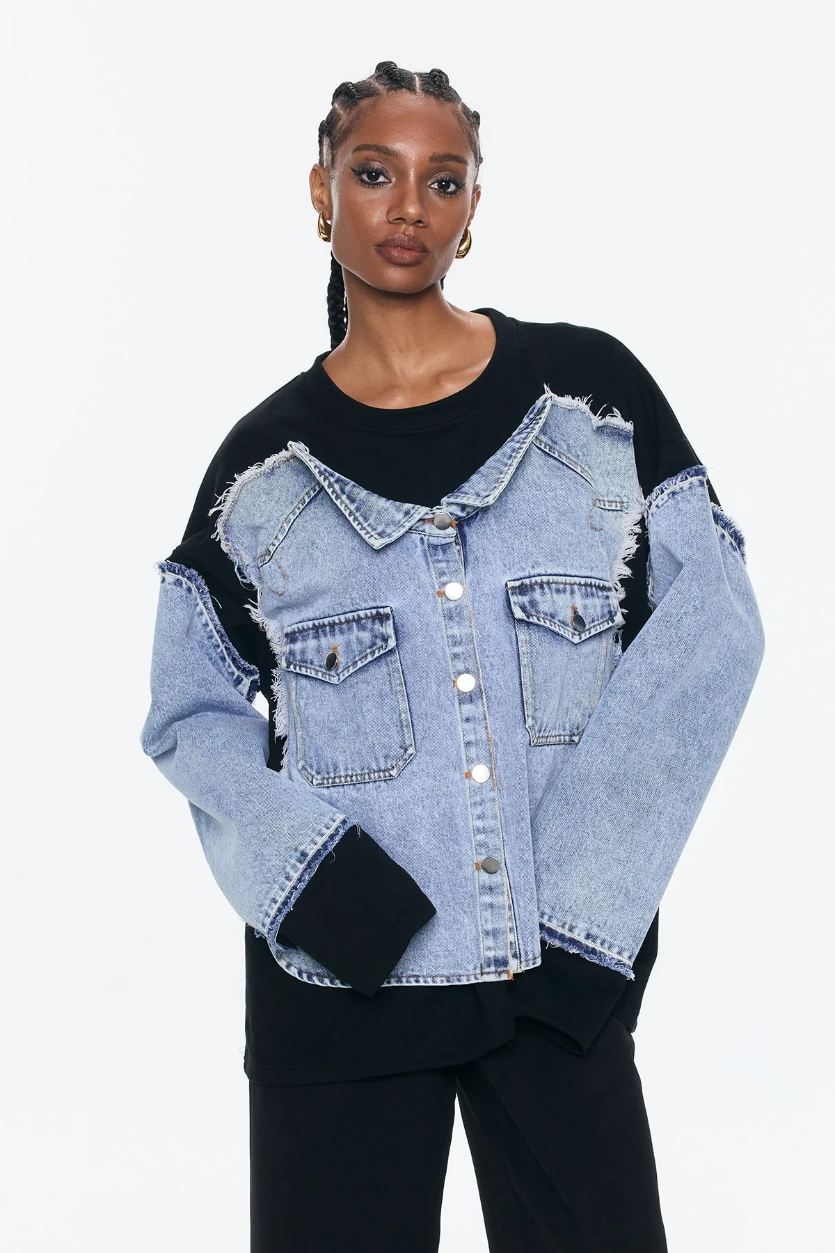 Elevate your wardrobe with the modern Stylish Deconstructed Denim Top in Black featuring the trendy Benitez design. Expertly crafted from high-quality 50% Polyester and 50% Cotton materials, this top offers a contemporary twist on the classic denim look. The deconstructed style adds a hint of edginess, while its versatility allows for easy dressing up or down, making it perfect for any occasion. Embrace your inner fashionista with this must-have top. The material is non-stretch and requires a gentle machine wash. Please note that color may vary due to lighting in images, but the overall beauty remains. Add this standout piece to your collection today!
