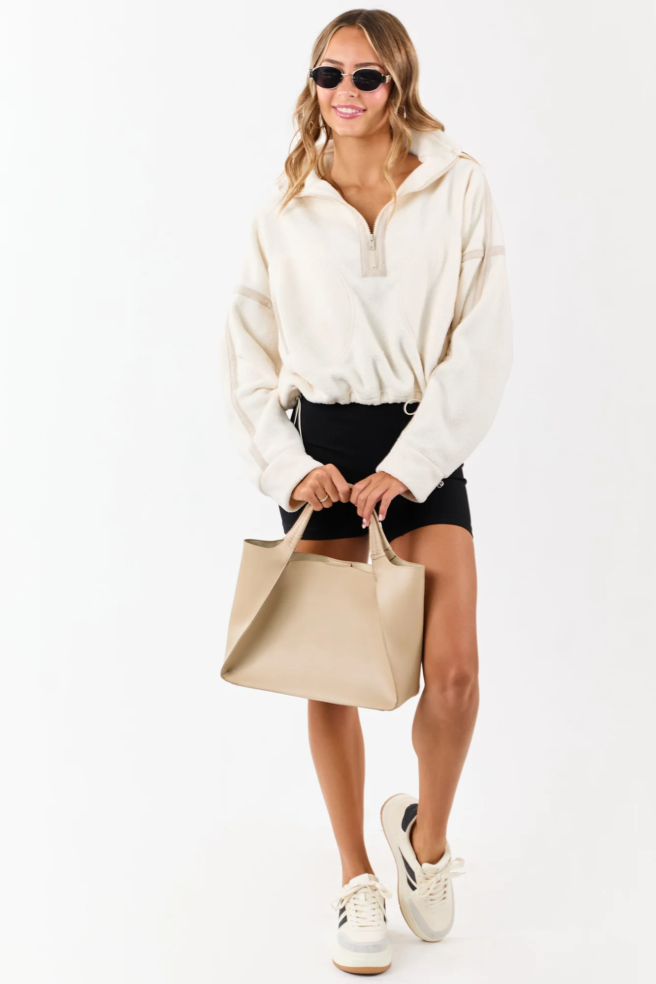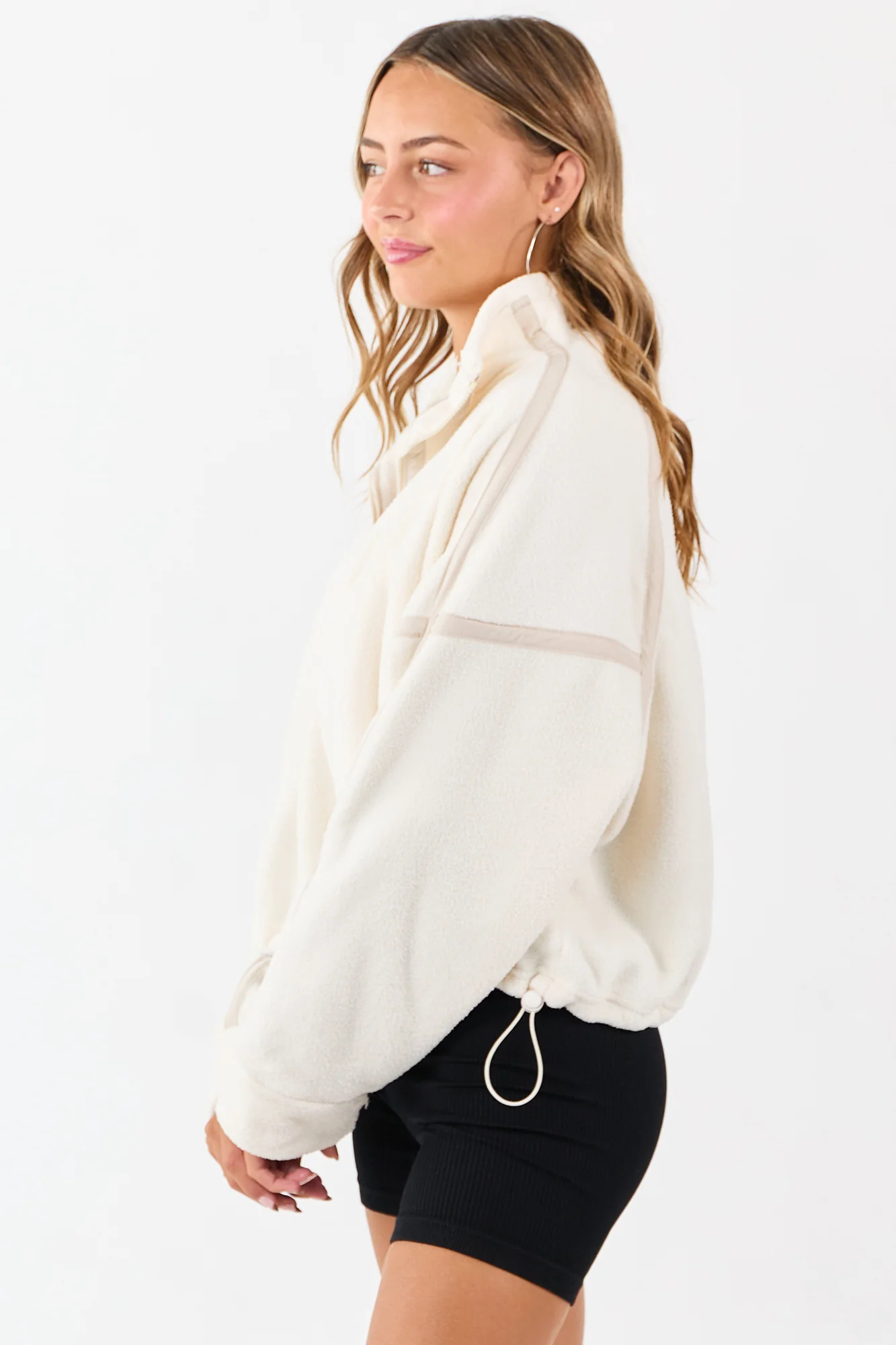 Stay warm and fashionable with this sporty ivory fleece jacket featuring a stylish contrast trim in oatmeal. Perfect for morning walks or hiking, this oversized jacket offers a non-stretchy fit with front pockets, drop shoulders, and a drawstring hem. Made of 100% polyester for comfort and durability. Available in sizes S, M, and L. Model is wearing size Small. Add this trendy jacket to your outerwear collection today!