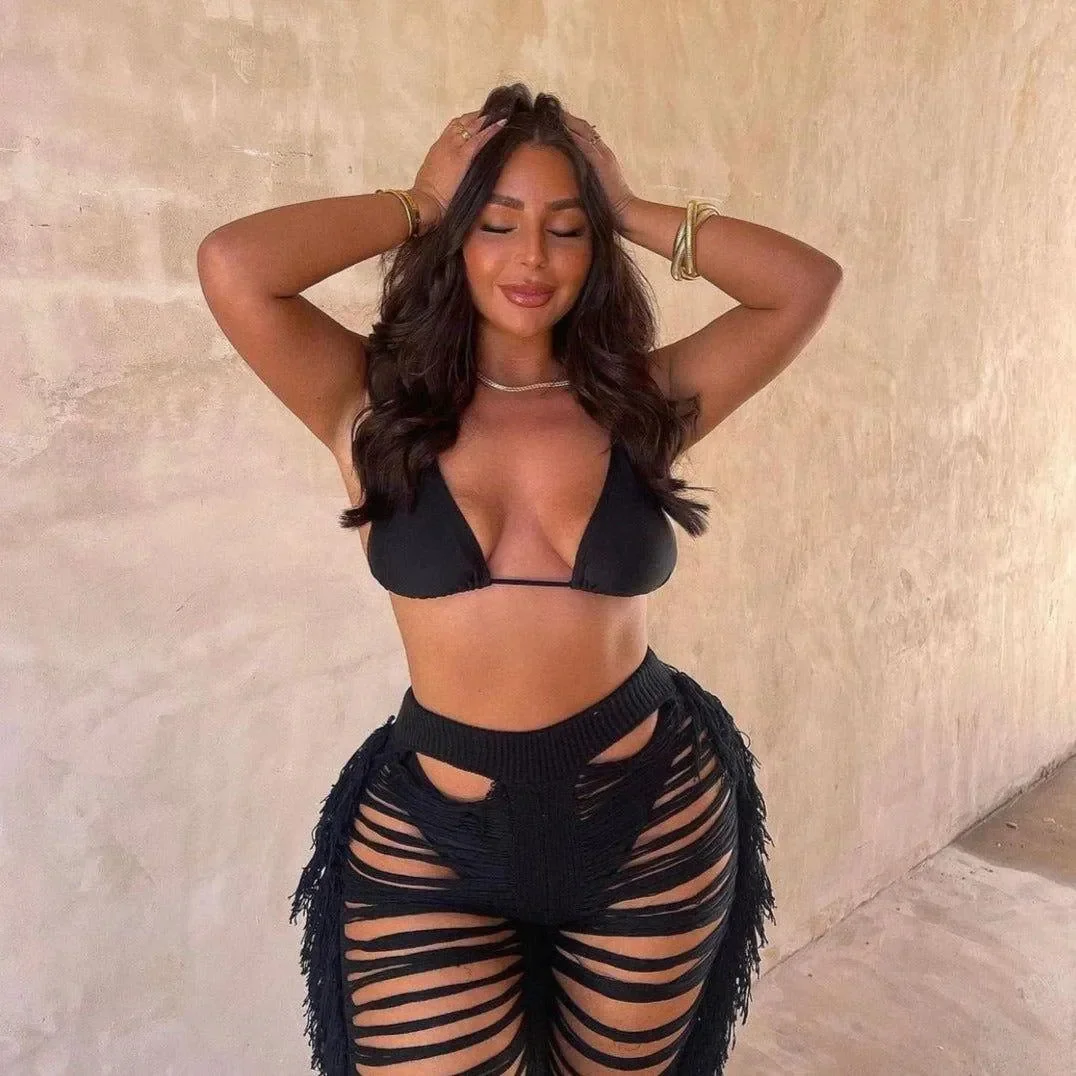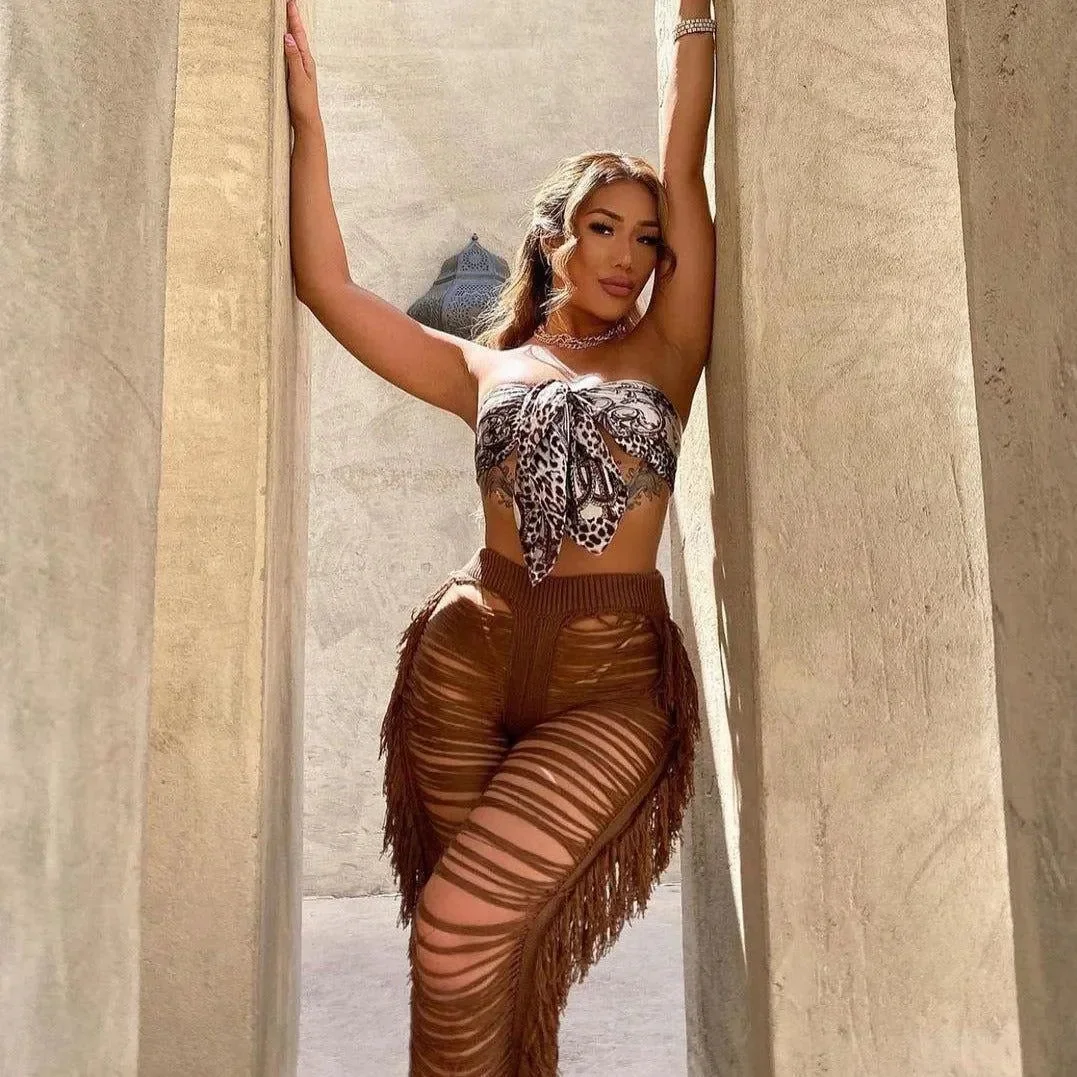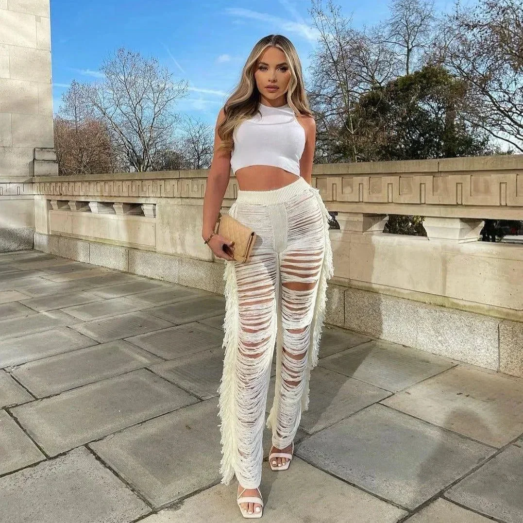 Elevate your wardrobe with these fashionable straight-leg pants, showcasing a unique ripped design and trendy side tassels. Ideal for casual occasions, these pants add a contemporary touch to any outfit. Crafted from premium cotton, polyester, and spandex blend, these trousers combine durability with a flattering silhouette. Enjoy the perfect fusion of style and comfort, making them a must-have in your closet. The intricate details ensure you make a confident statement. Refresh your style with these chic pants and embrace effortless fashion. Team them with a matching top for a sophisticated ensemble that radiates elegance and charm.