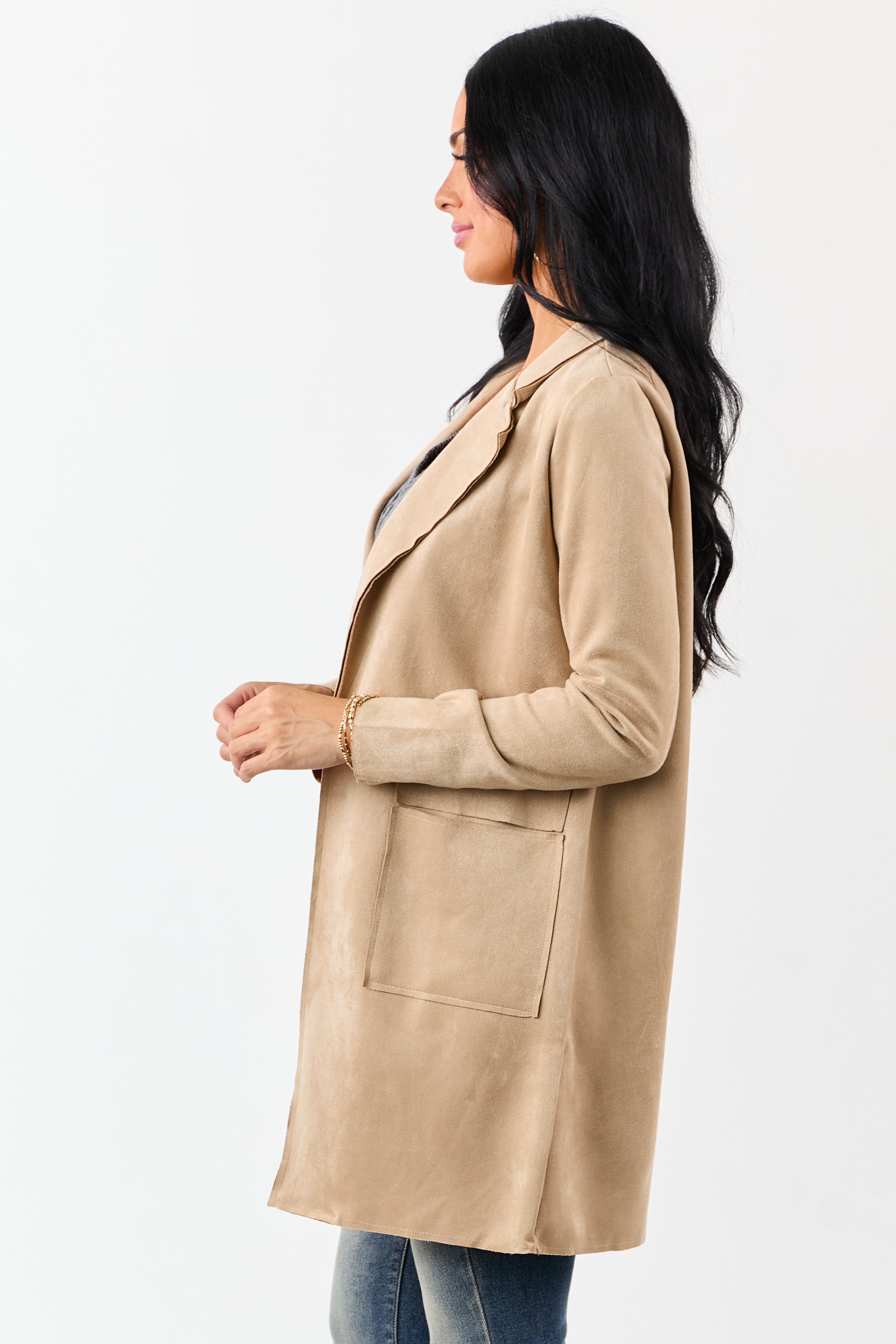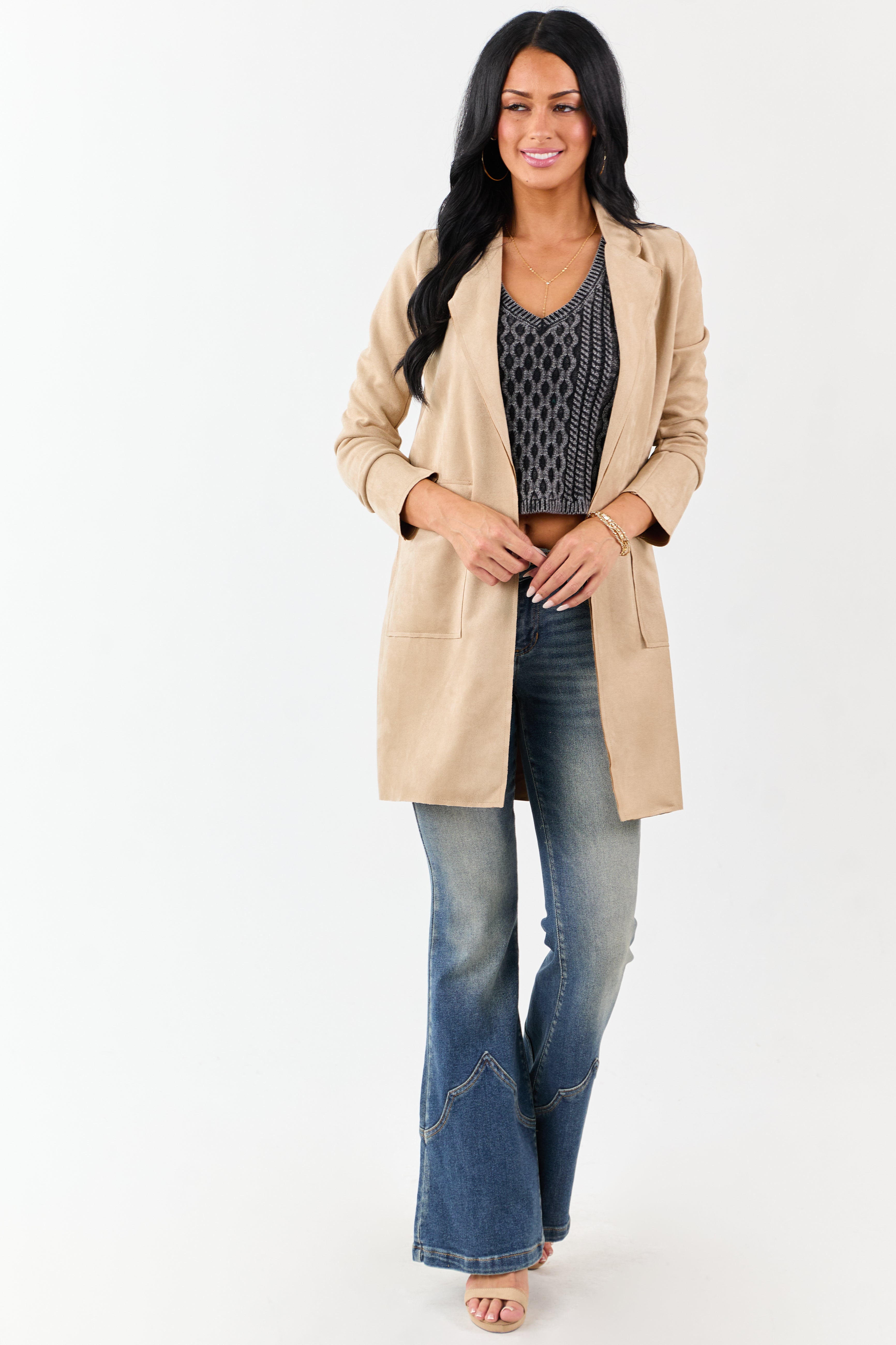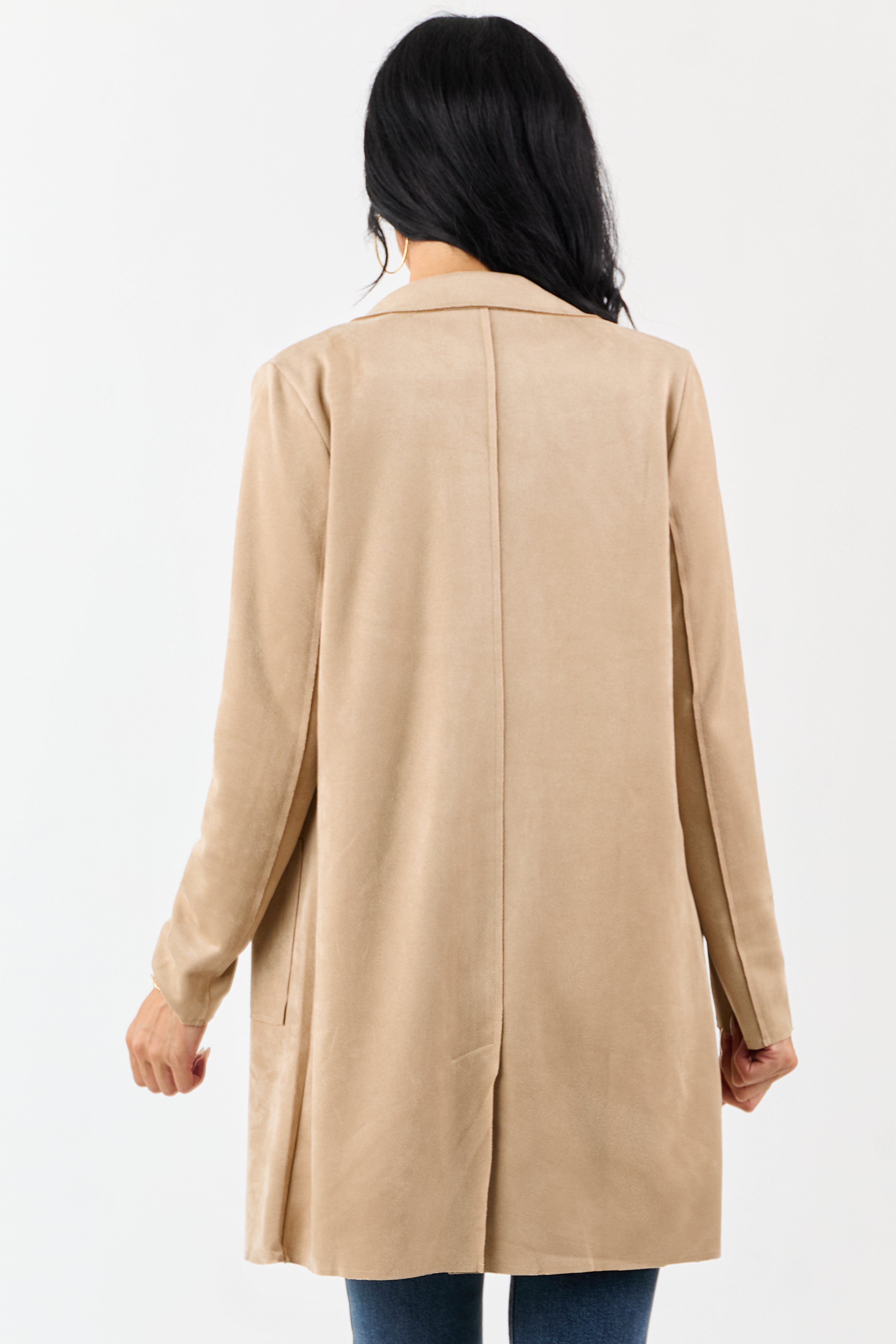 Elevate your style with this soft faux suede white jacket. Offering a polished, layered look with lapel collar and front pockets. Made of 95% Polyester and 5% Spandex for a semi-stretchy fit. Available in sizes S, M, L with varying lengths and sleeve sizes. A must-have wardrobe essential for a chic and trendy outfit. Imported.