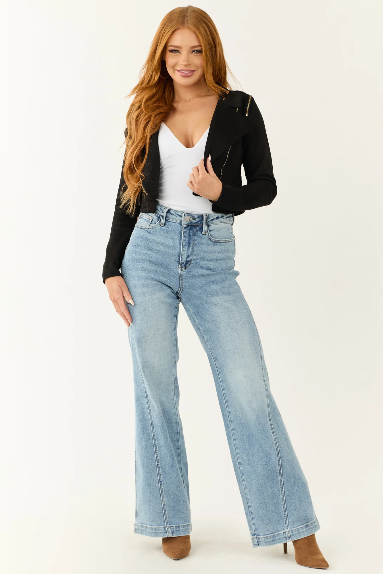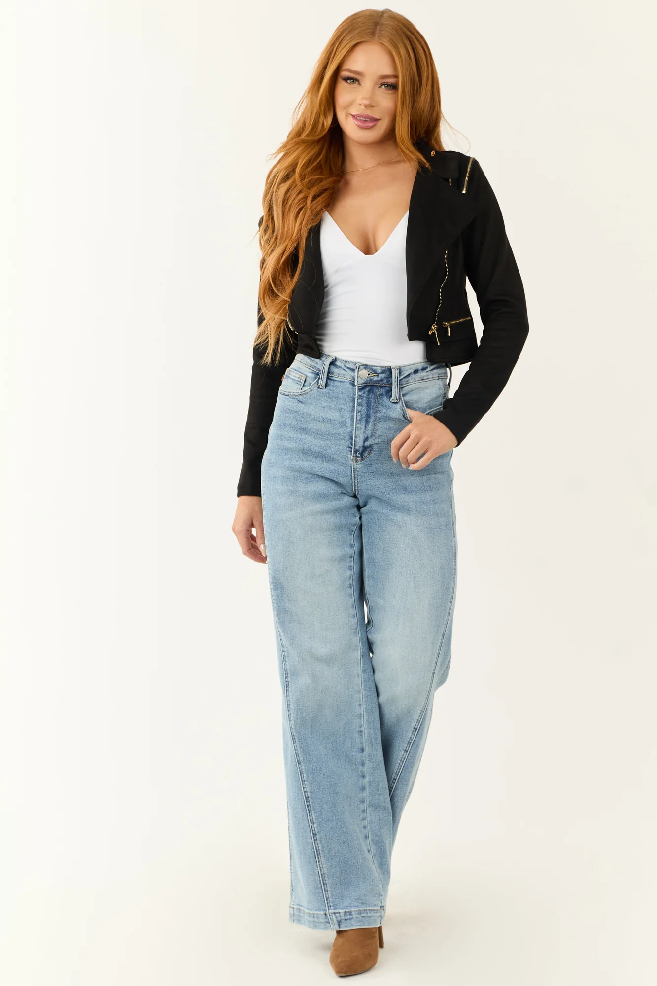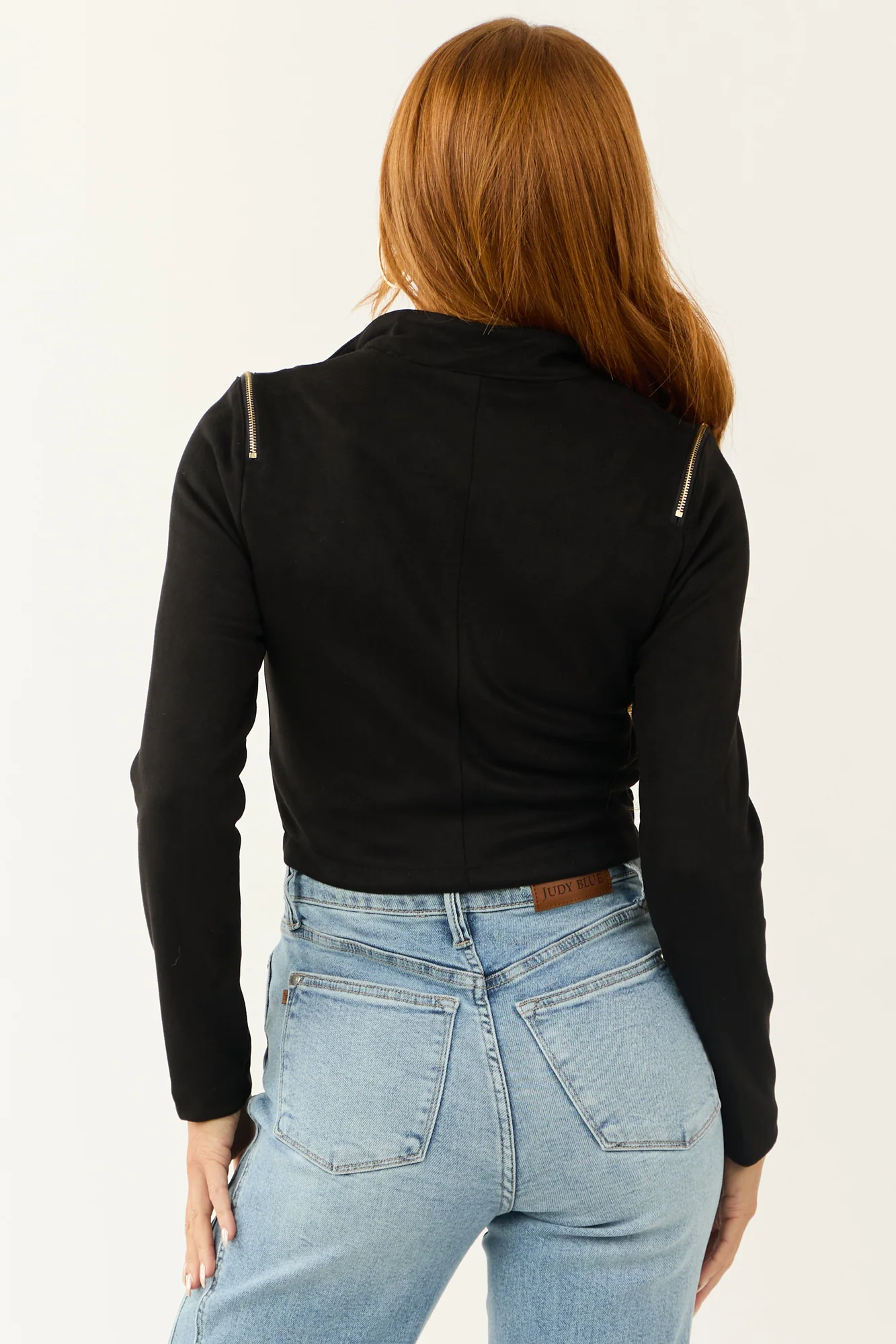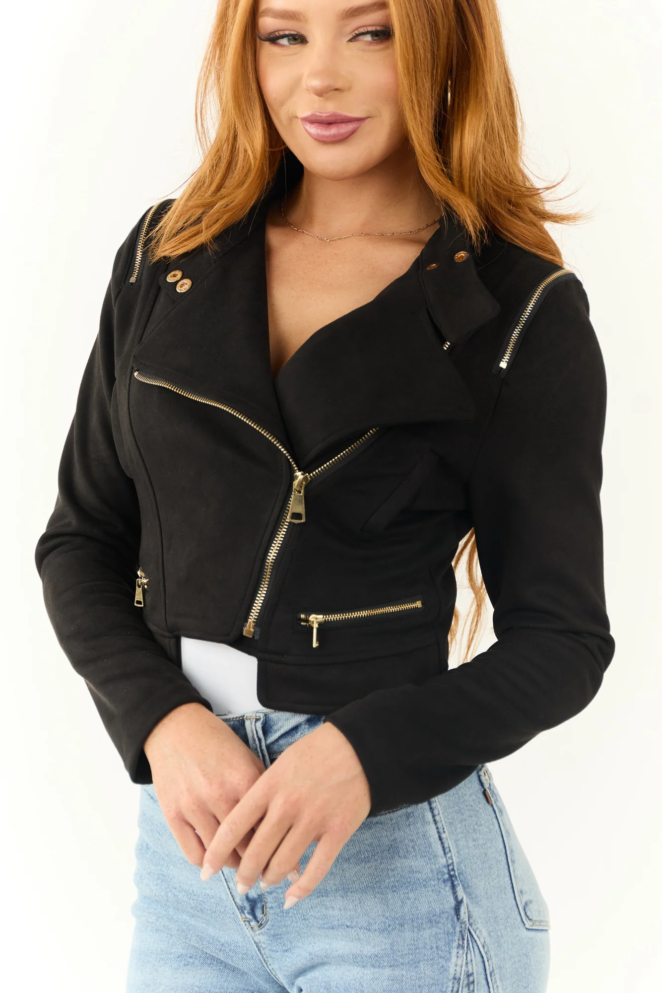 Stay stylish and edgy with this Black Faux Suede Zipper Detail Biker Jacket. Crafted from non-stretchy soft faux suede, it features a mock neckline, long sleeves, gold zipper details, faux zipper pockets, banded cuffs, and an off-center zipper for a modern look. The cropped length adds a trendy touch to your outfit. This jacket is unlined and made of 95% Polyester, 5% Spandex. Perfect for a casual day out or a night on the town. Hand wash cold, do not bleach, line dry, iron warm if necessary. Model is wearing a size Small. Model’s Profile: Size 1, Height 55″, Bust 31″, Waist 24″.