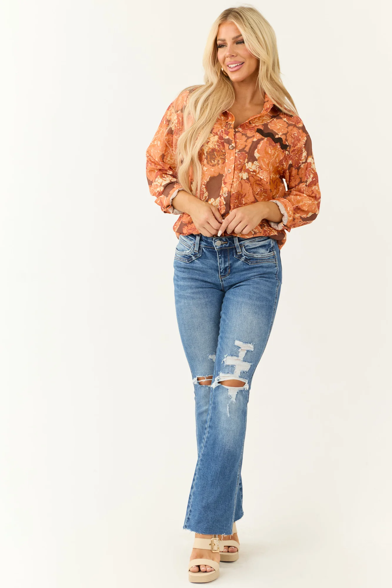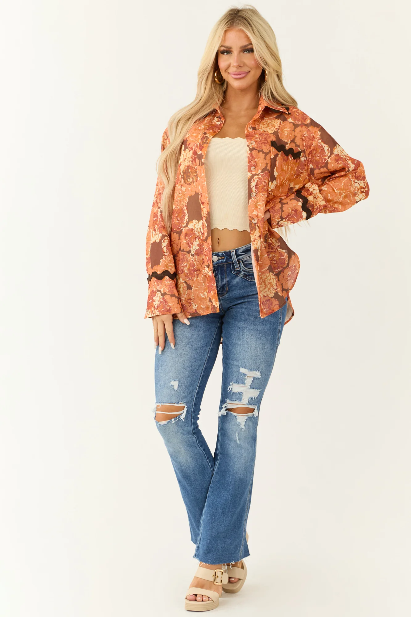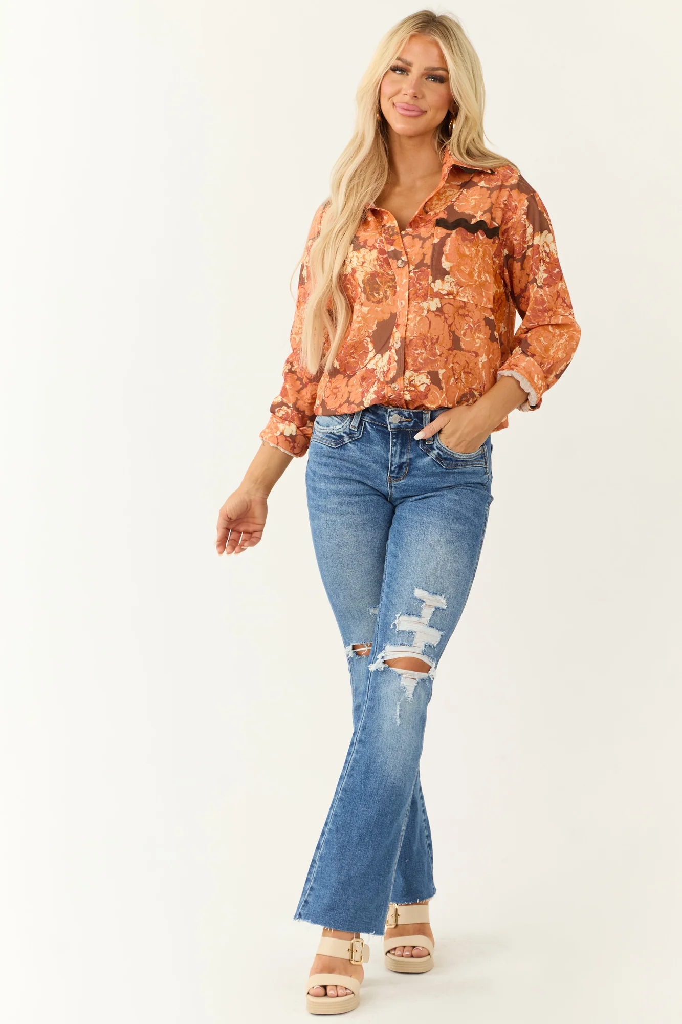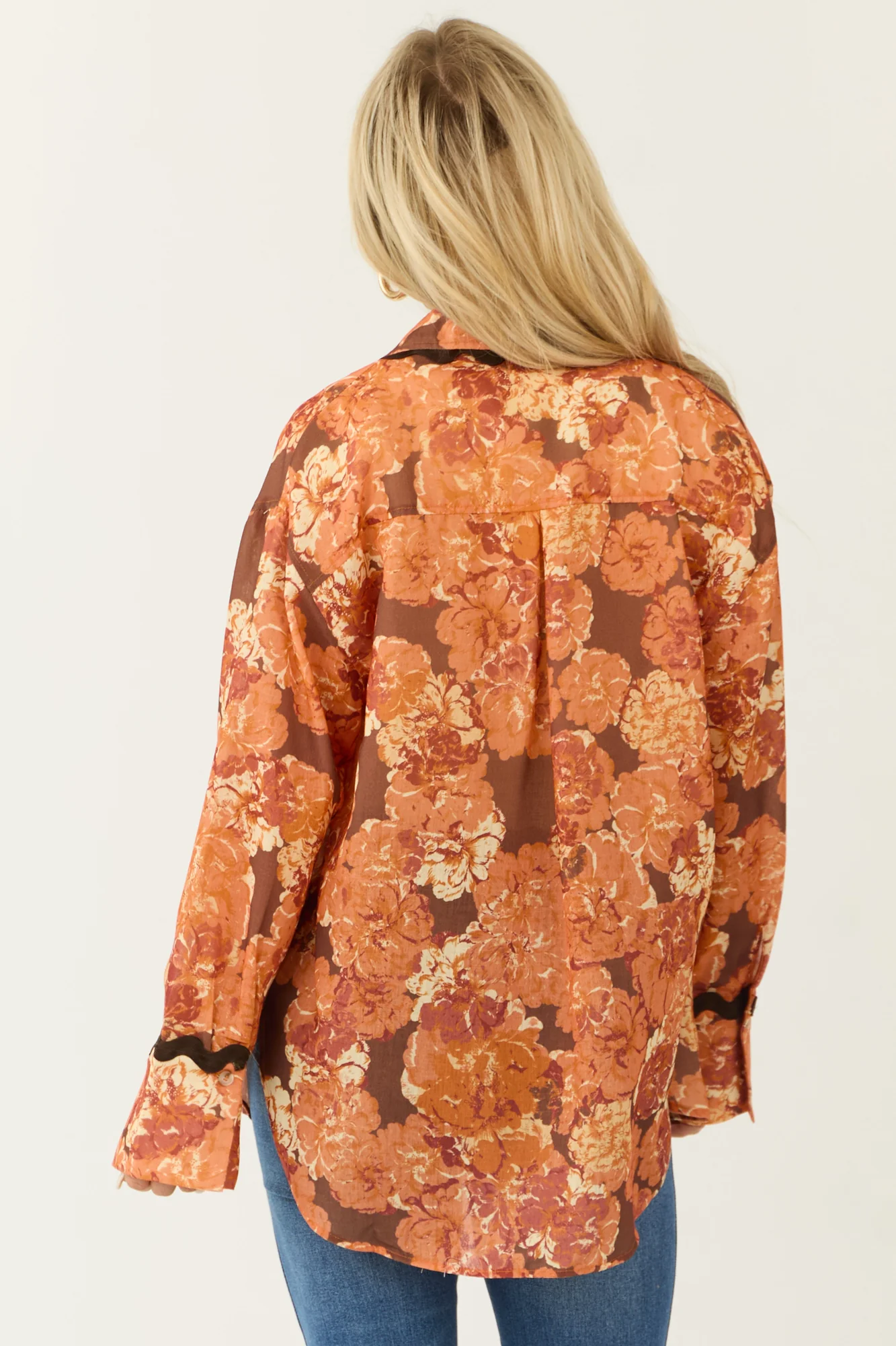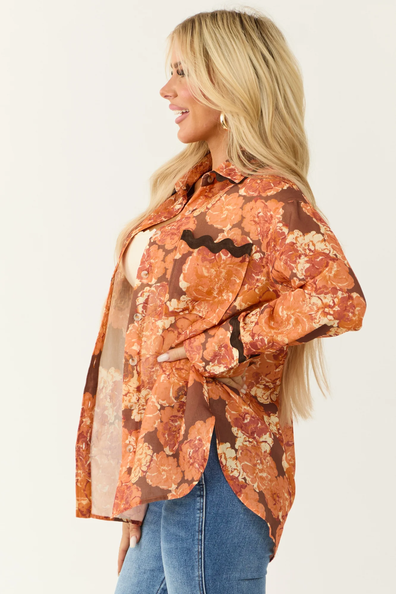 This beautiful Sunset Melon Floral Pocket Blouse comes in an oversized fit with a non-stretchy woven fabric featuring a floral pattern in shades of Sunset, Melon, Buttercream, Coffee, and Marsala. It is detailed with scalloped embroidery trim in Cocoa, Ivory, and Cocoa button accents. The collared blouse has long sleeves with button cuffs, a high low hemline, side hem slits, and is made of 100% Polyester. Care instructions: Hand wash with cold water, line dry, iron on low heat. Variations may occur due to the print and sewing process. Model is wearing size Small.