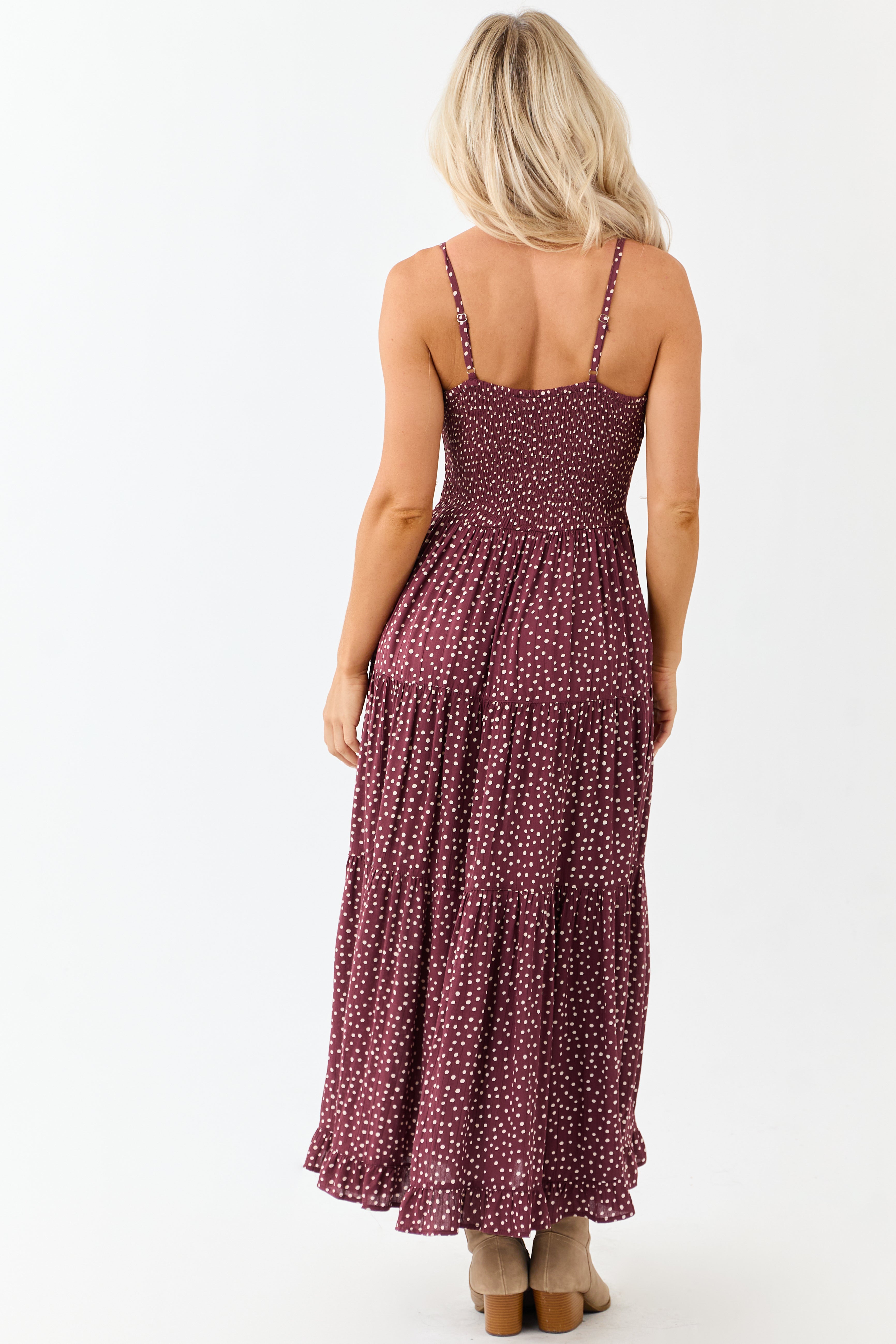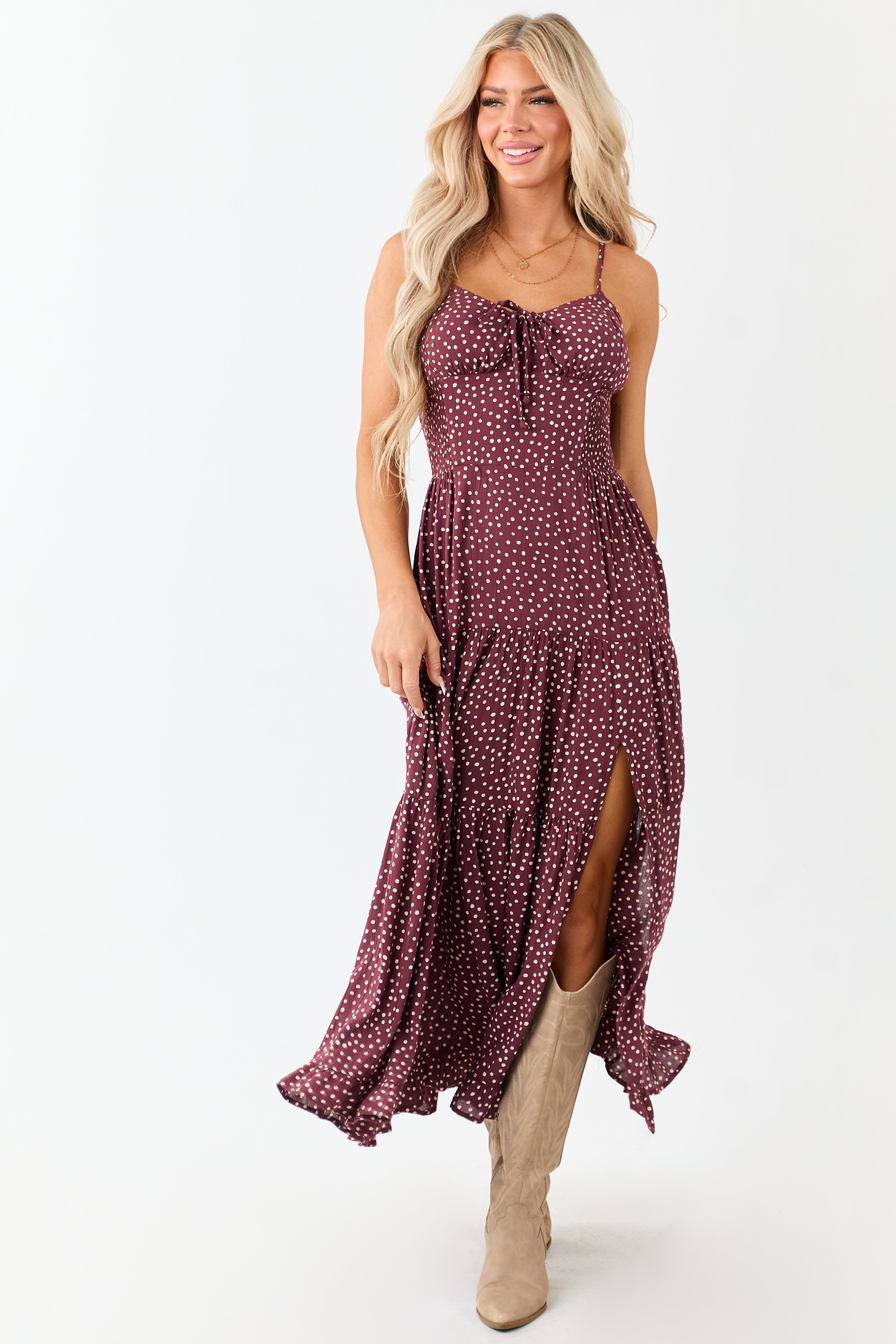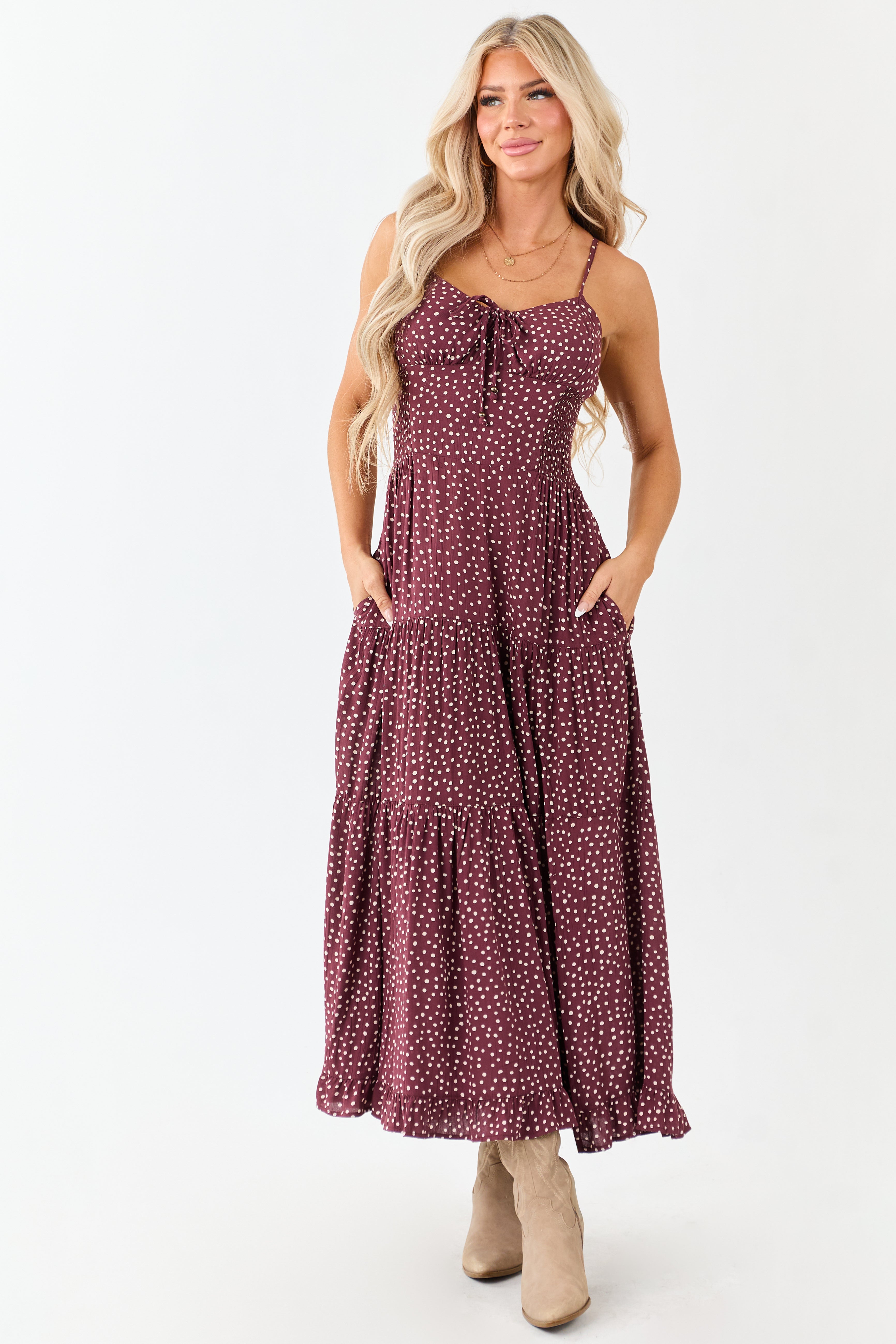 Embrace playful polka dots and flirty tiers with this flowy sweetheart neckline maxi dress. Featuring adjustable spaghetti straps, smocked sides, and a non-cinching bust tie for a perfect fit. This dress is forgiving in the bust and comes with a hem slit and side pockets. Make a statement with this elegant dress suitable for various occasions. Garment specifications: Bust: 36, Waist: 25, Length: 52. Lined with 100% Rayon. Imported. Available sizes: S, M, L.
