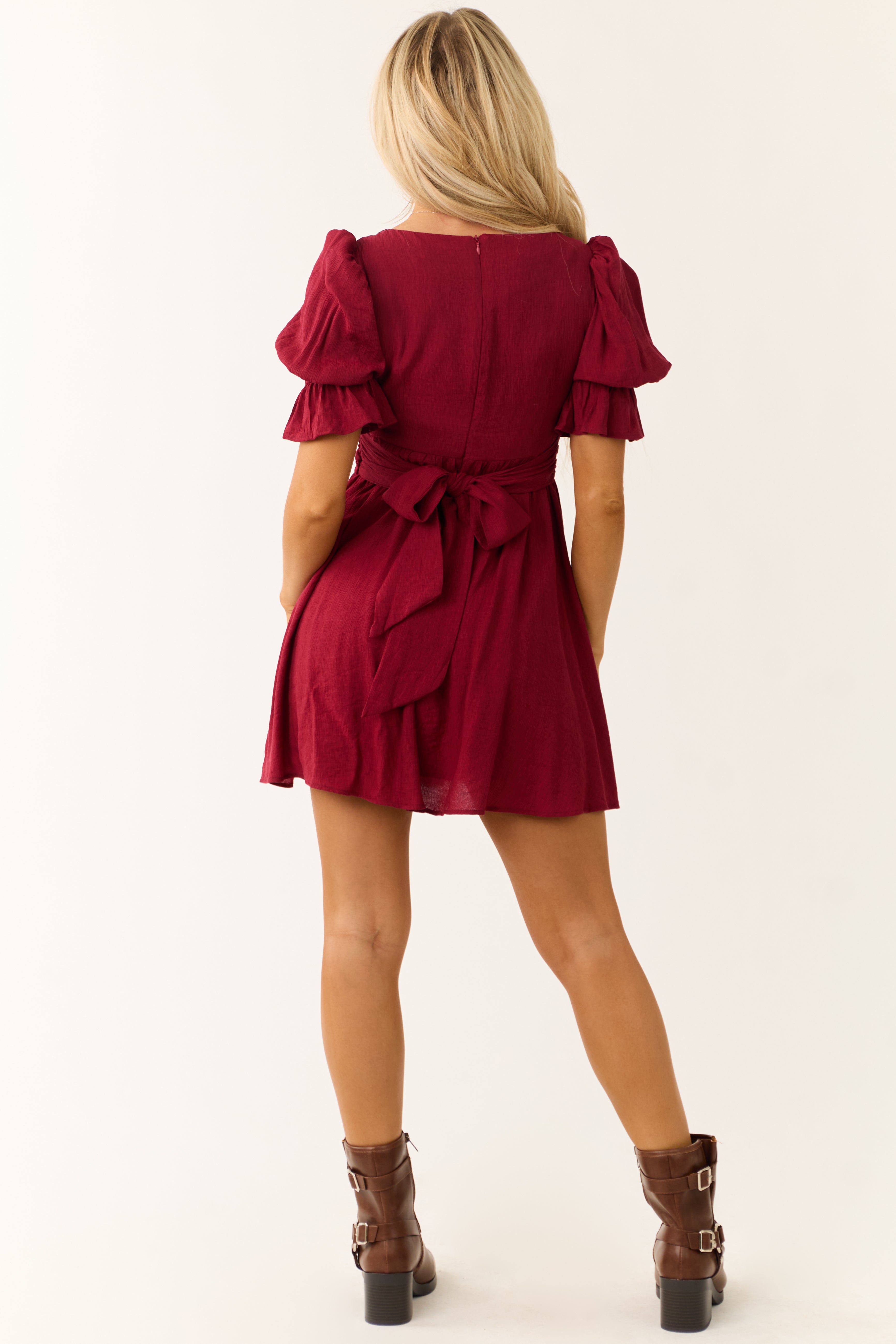 Indulge in the elegance of our Sweetheart Neckline Womens Wine Short Dress with Waist Tie, available in sizes S, M, and L. Embrace the half puff sleeves, highlighted by a front knot detail and elastic banded flare cuff. This non-stretchy woven dress features a back zipper with hook and eye closure, ensuring a perfect fit. Crafted from 80% Rayon and 20% Nylon with a 100% Polyester lining for comfort. Treat yourself to this lovely ensemble suitable for Date Nights or Daytime events. Care instructions: Hand wash cold, line dry, low iron if necessary.