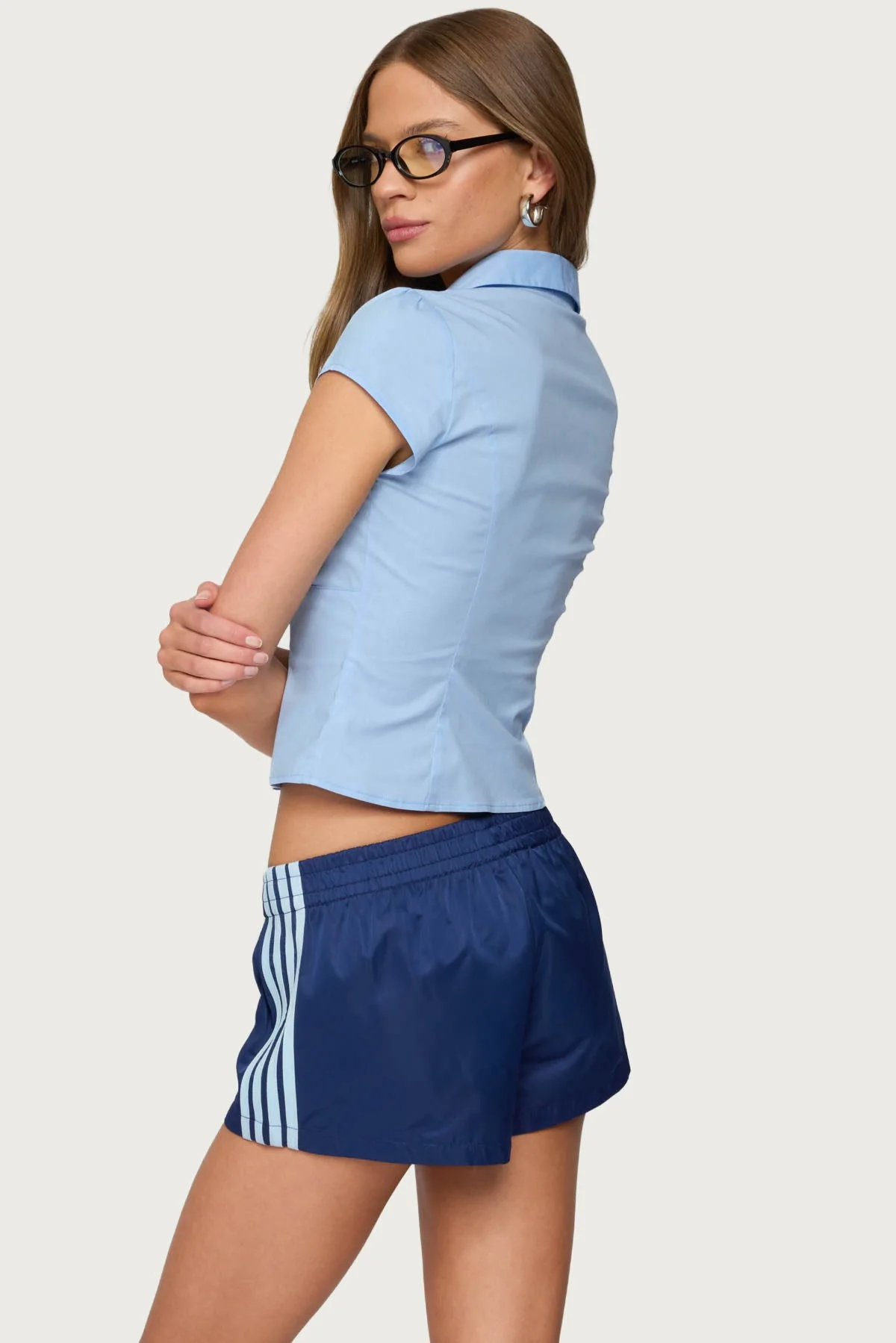 Elevate your wardrobe with our tailored button-up shirt in light blue. Crafted from a blend of cotton and spandex, this classic collar shirt features underbust ruching for a flattering touch. Perfect for any occasion, whether youre dressing up or down. Our model wears a size S with a height of 510. Care instructions: Machine wash cold, do not bleach, tumble dry low, iron at medium heat, avoid dry cleaning.