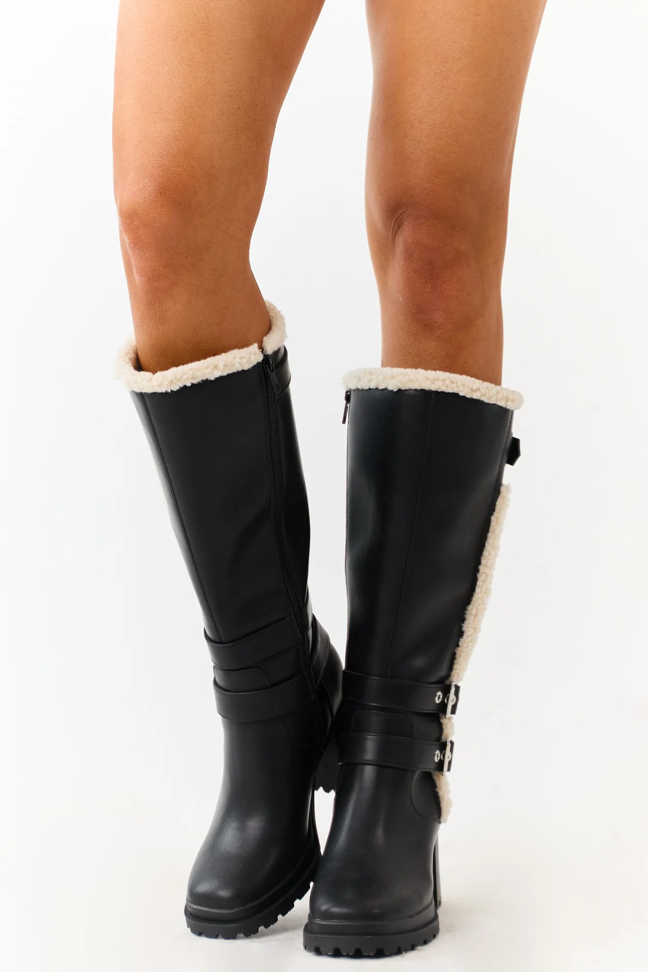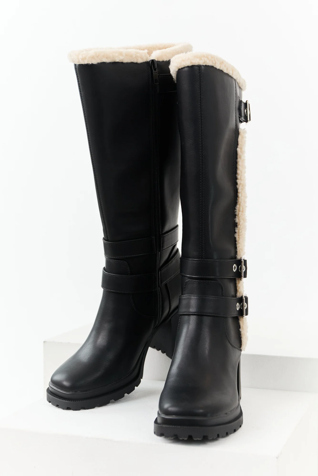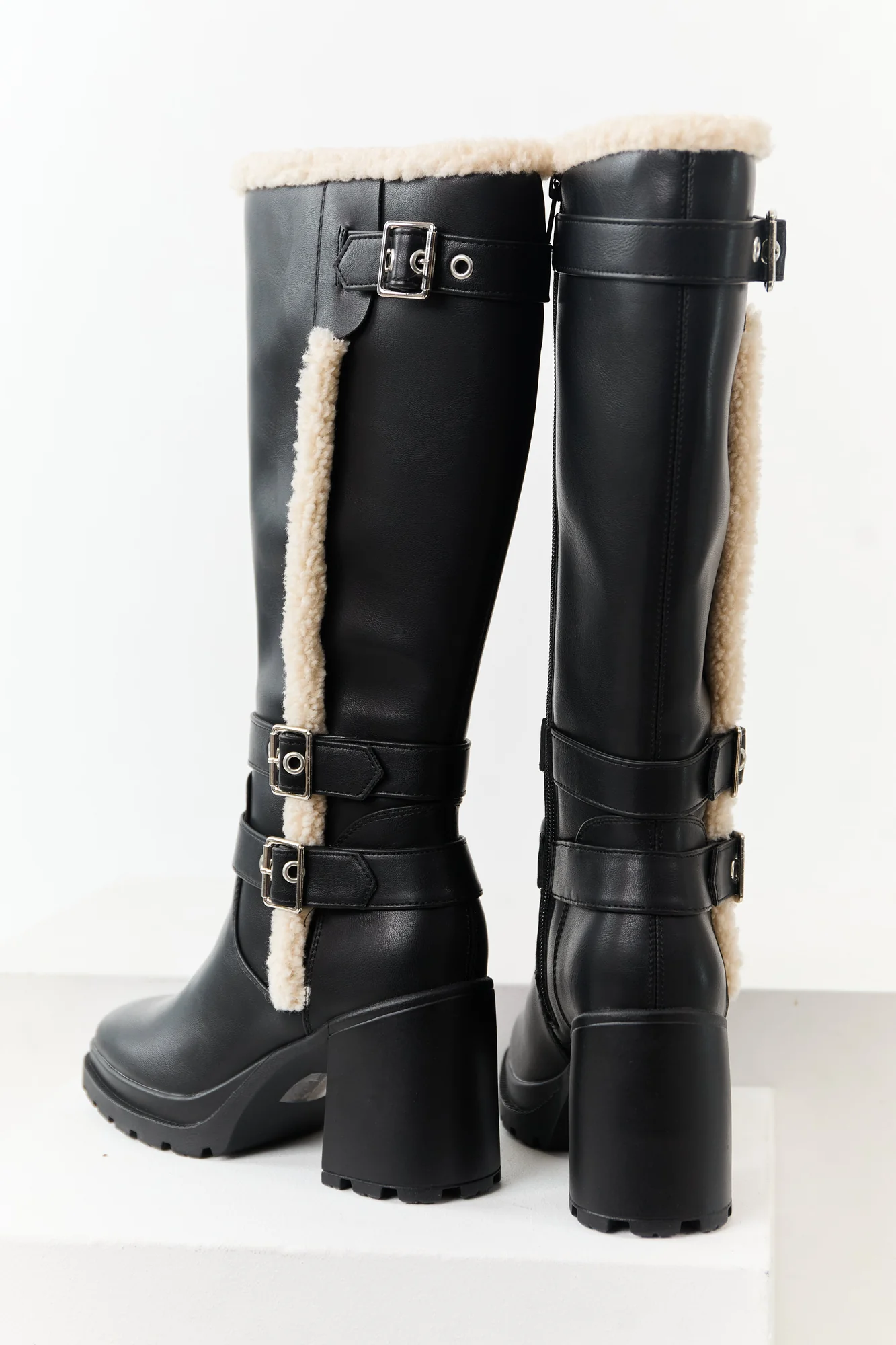 Step out in style with these tall black faux leather platform boots featuring buckle strap details, cozy sherpa lining, square toe, and block heel for all-day comfort. The side zipper allows for easy wear, while the slightly cushioned insole ensures a comfortable fit. Shaft height: 15 inches. Circumference: 17 inches. Heel height: 3.5 inches. Platform height: 1 inch. Imported.