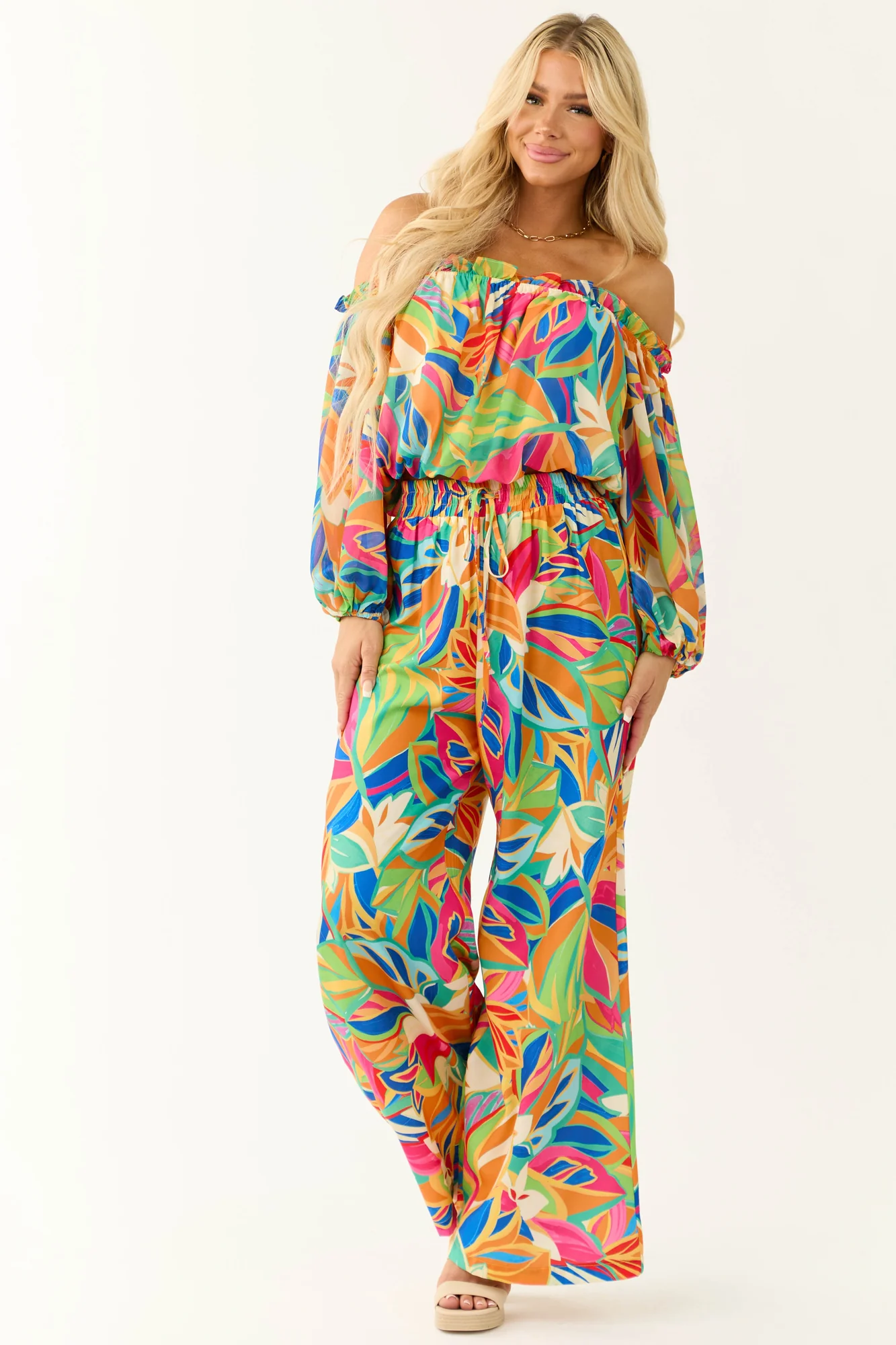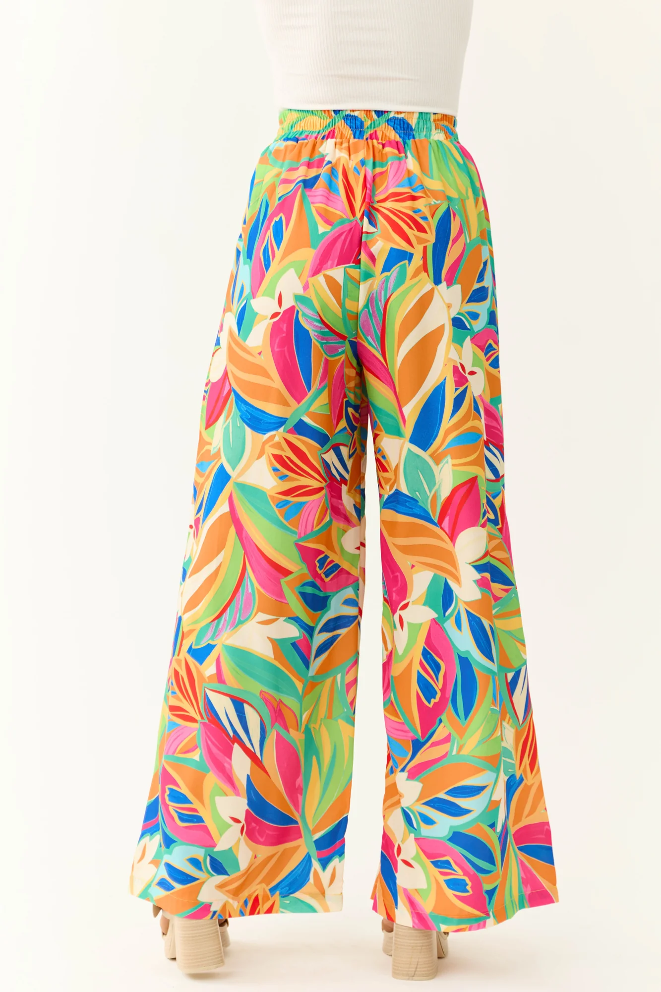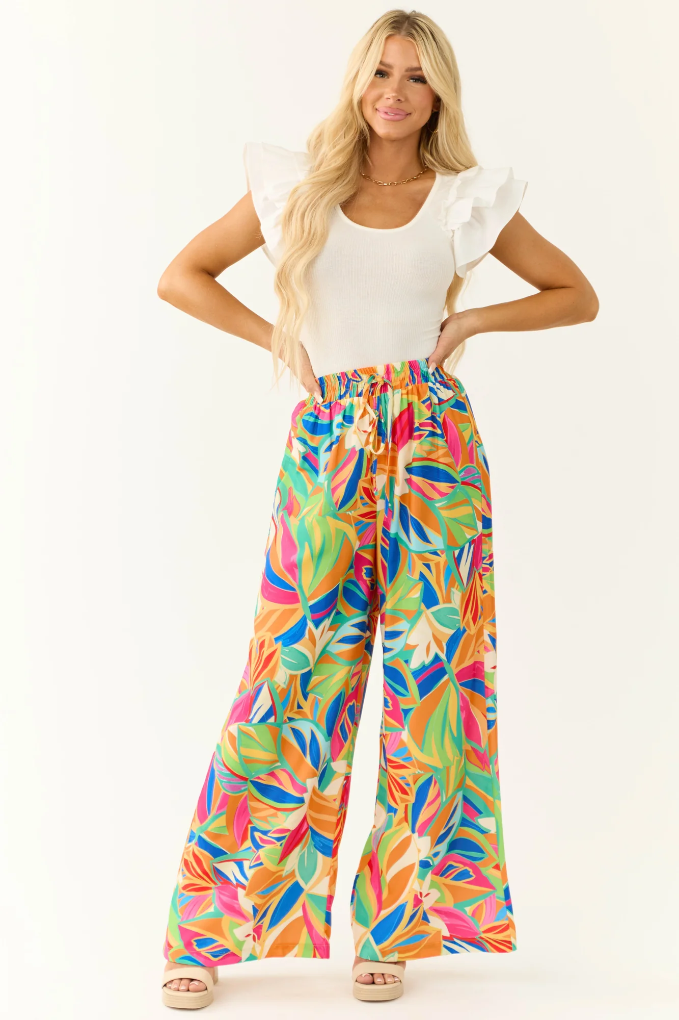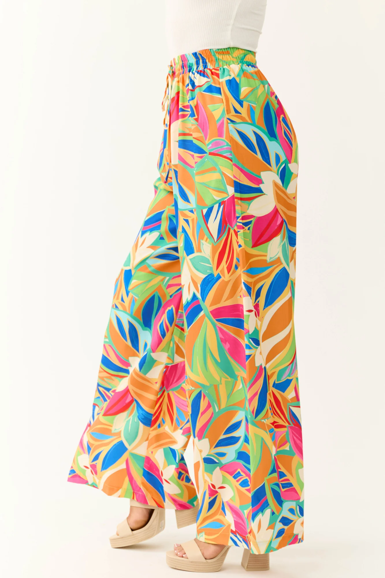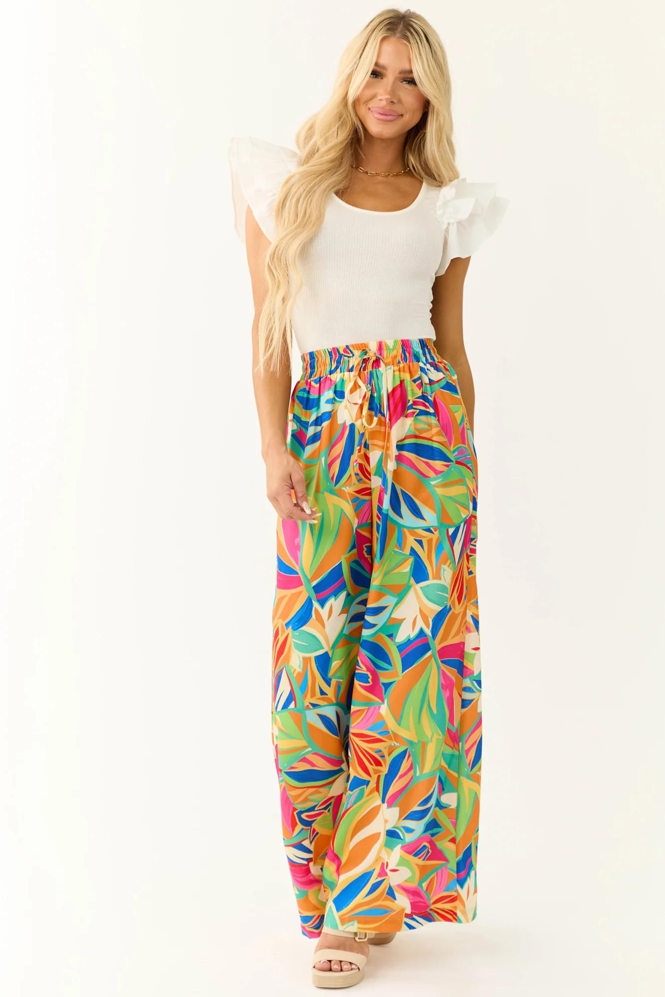 Elevate your style with these Tangerine Abstract Print High Waisted Flare Pants . Crafted from non-stretchy woven fabric featuring a smocked waistband and drawstring tie for a perfect fit. The vibrant print in shades of Tangerine, Cream, Melon, Royal Blue, Magenta, and more adds a playful touch. Ideal for day and party wear. Hand wash cold for best care. Please note each piece is unique due to the fabrics print and cutting process. Model is wearing a size Small.