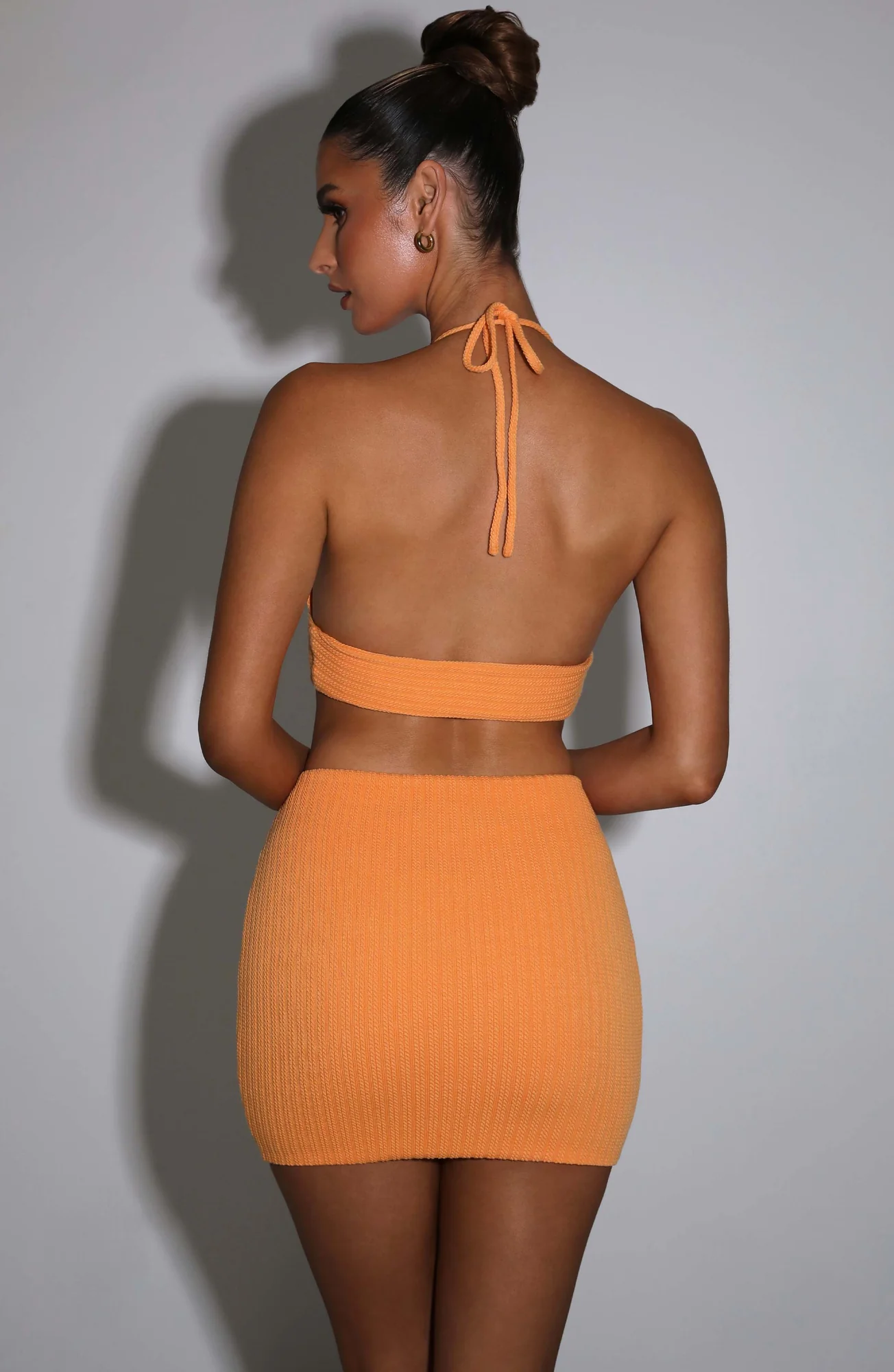 Elevate your vacation style with Irene, the new micro knit crop top featuring a chic halter neck adorned with intricate beading. Designed with a flattering plunge neckline, this top pairs perfectly with the Irene mini skirt. Crafted from super soft micro cable knit, the top molds beautifully to the body, creating a trendy cropped look that exudes summer vibes.