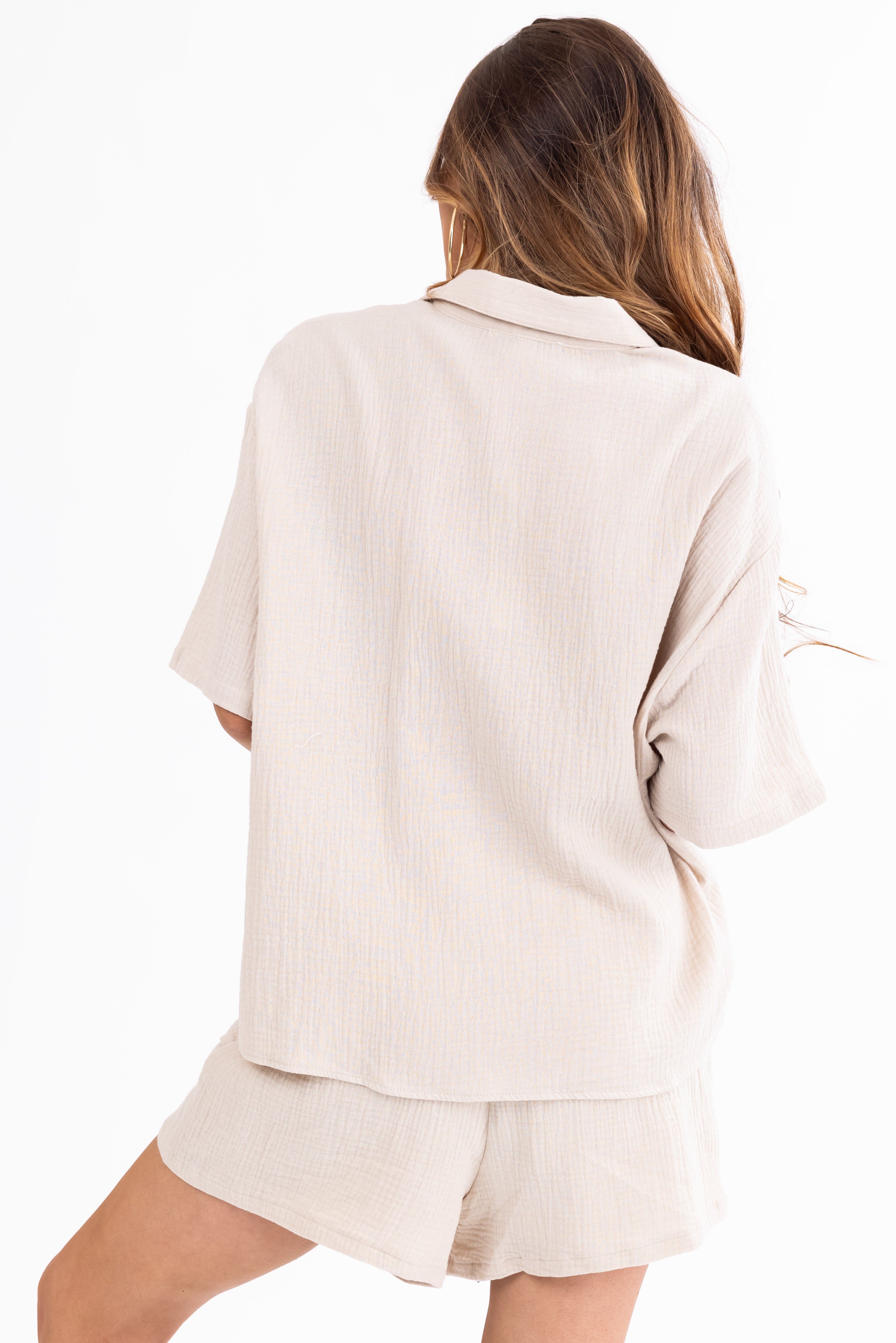 This Taupe Button-Down Half Sleeve Cotton Shirt + Sky is a versatile piece that effortlessly combines style and comfort. Featuring a loose fit and non-stretchy woven fabric with a gauze texture, this shirt offers a wide silhouette and a trendy collared design. The drop shoulder adds a contemporary touch, making it perfect for casual or daytime wear. The shirt pairs beautifully with She + Sky Natural Elastic Waist Gauze Woven Shorts, creating a chic ensemble that fits true to size. Hand wash cold and separately to maintain the color and texture. Avoid bleaching and tumble drying. For a polished look, warm iron if needed. Ideal for individuals looking for a fashionable and relaxed wardrobe staple. Model is wearing size Small, detailed sizing: Size 2, Height 58″, Bust 32″, Waist 25″.