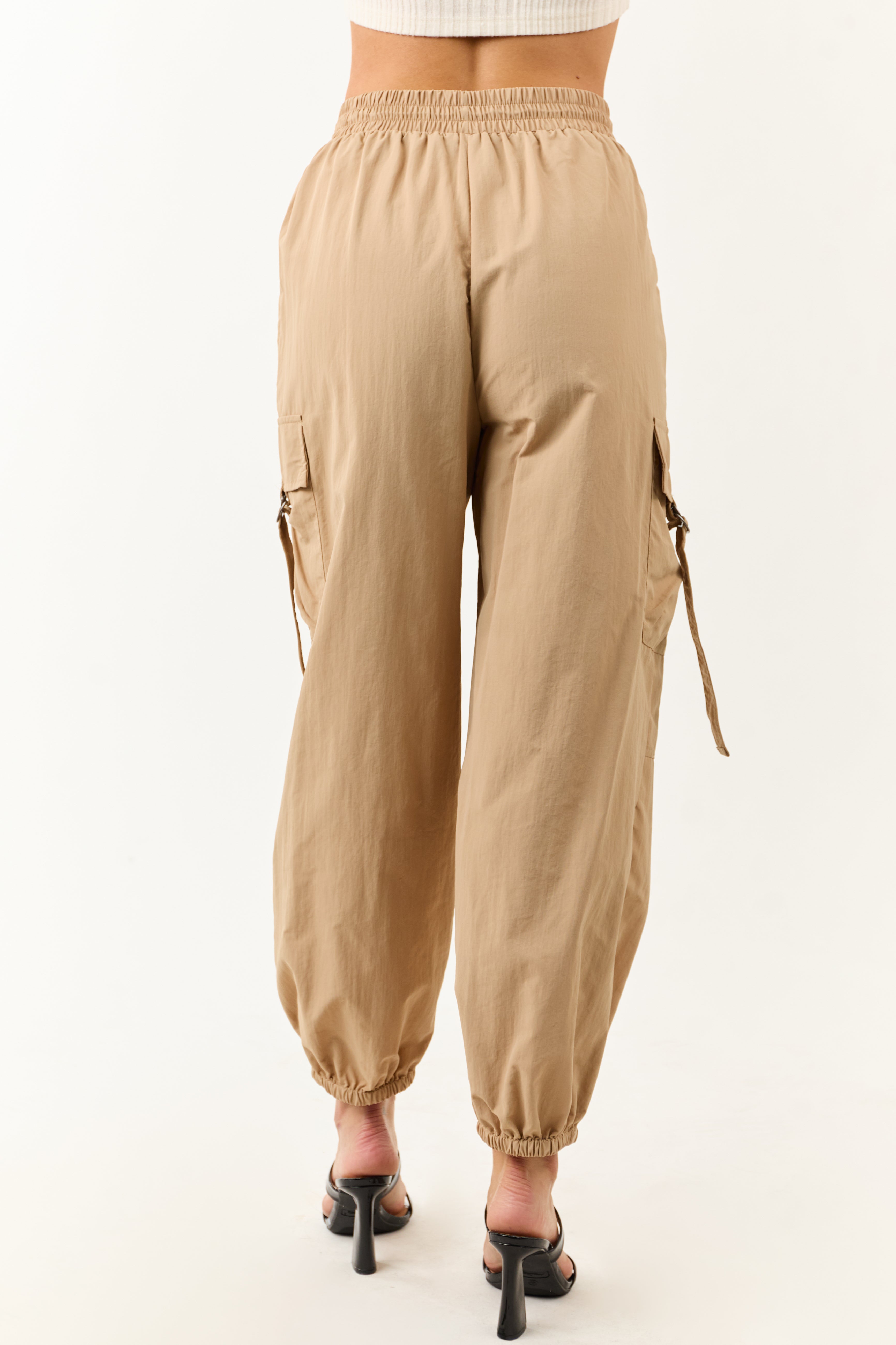 Experience ultimate comfort and style with our taupe cargo utility jogger pants featuring a high-waisted design, smocked waistband, bungy chord drawstring, utility strap, and multiple pockets. These pants are made of 100% nylon for a perfect fit. Ideal for everyday wear or outdoor adventures. Available in sizes XS to XL. Find your perfect fit using our size chart. Stay on-trend and versatile with these must-have bottoms.
