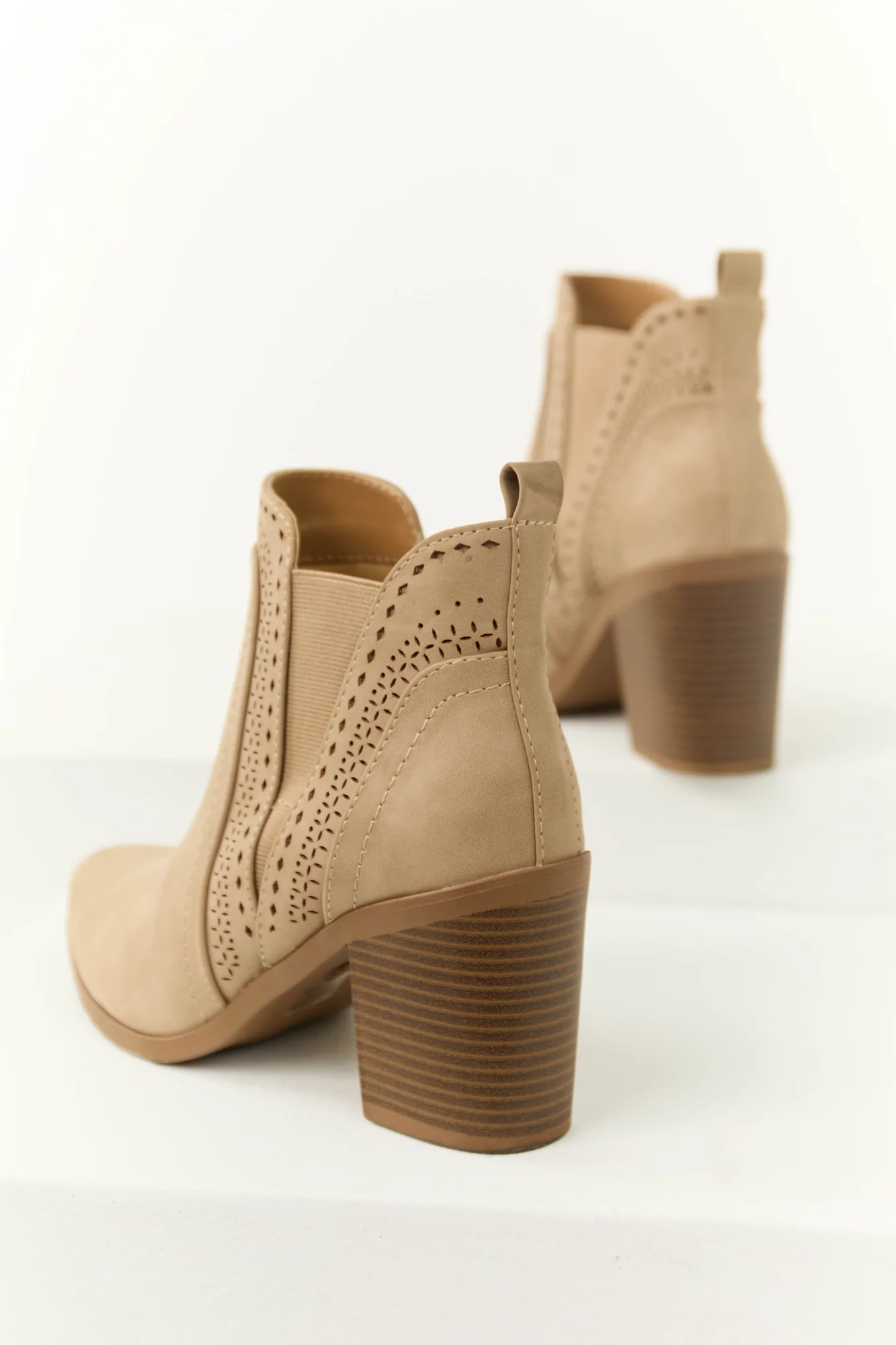 Step up your footwear game with these taupe ankle booties. Crafted from faux suede, they feature a stylish cut-out pattern, a comfortable lightly cushioned insole, and a trendy block heel design. The pointed toe and closed toe silhouette add a chic touch. The shaft measures 5.5 inches with an 11-inch circumference and a 3.5-inch heel height. Imported and available in multiple sizes.