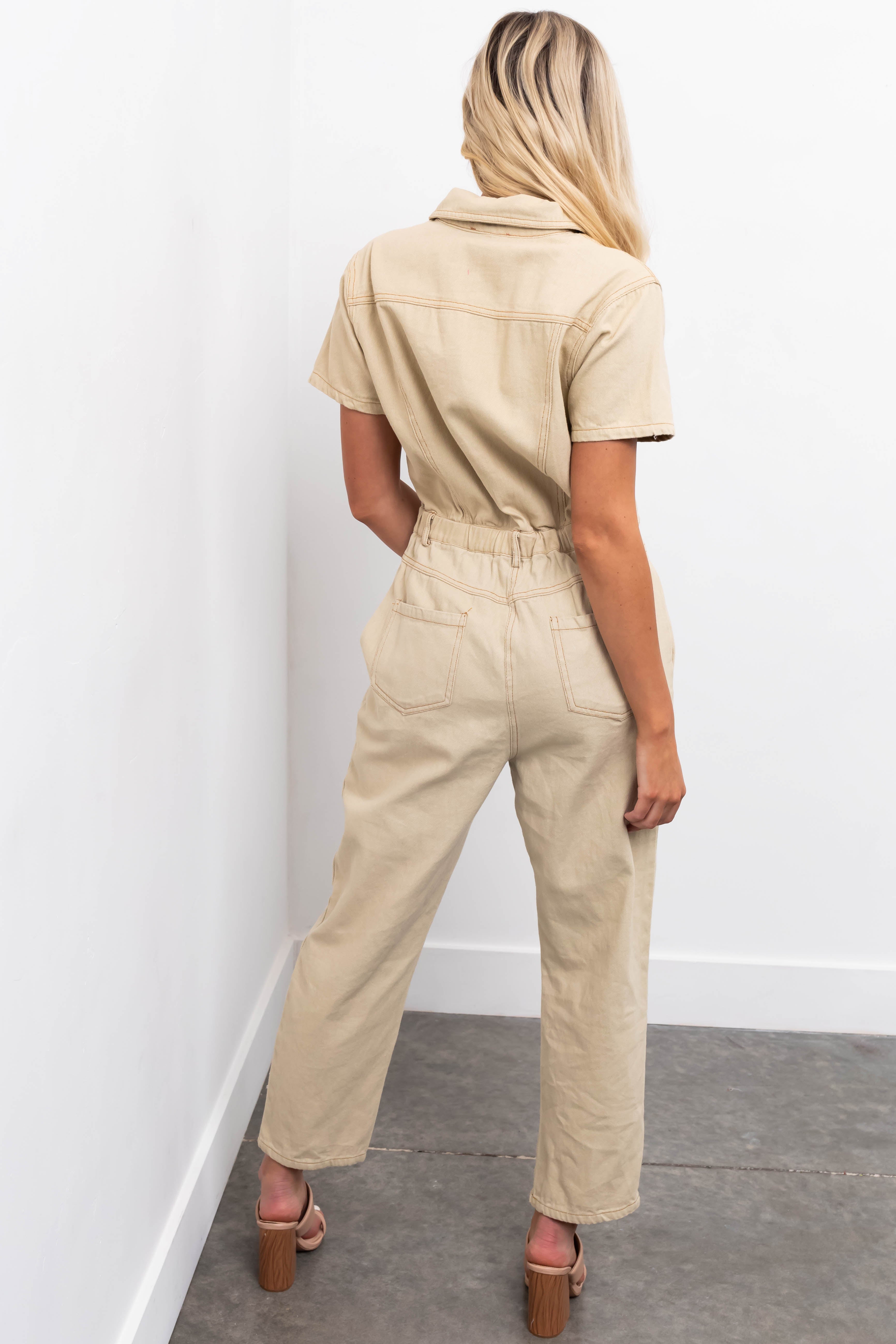 Stay stylish with this taupe denim collared jumpsuit featuring a straight leg, 6 pockets, and a cropped length. Made of non-stretchy denim, it offers all-day comfort and chic flair. This jumpsuit includes belt loops for a personalized fit and is unlined for a breezy feel. Perfect for daytime wear in spring or summer. Care instructions: Hand wash cold separately, do not bleach, flat dry, warm iron if needed. Size Small fits model height 57″, bust 33.5″, and waist 25″. Available in sizes S, M, and L.