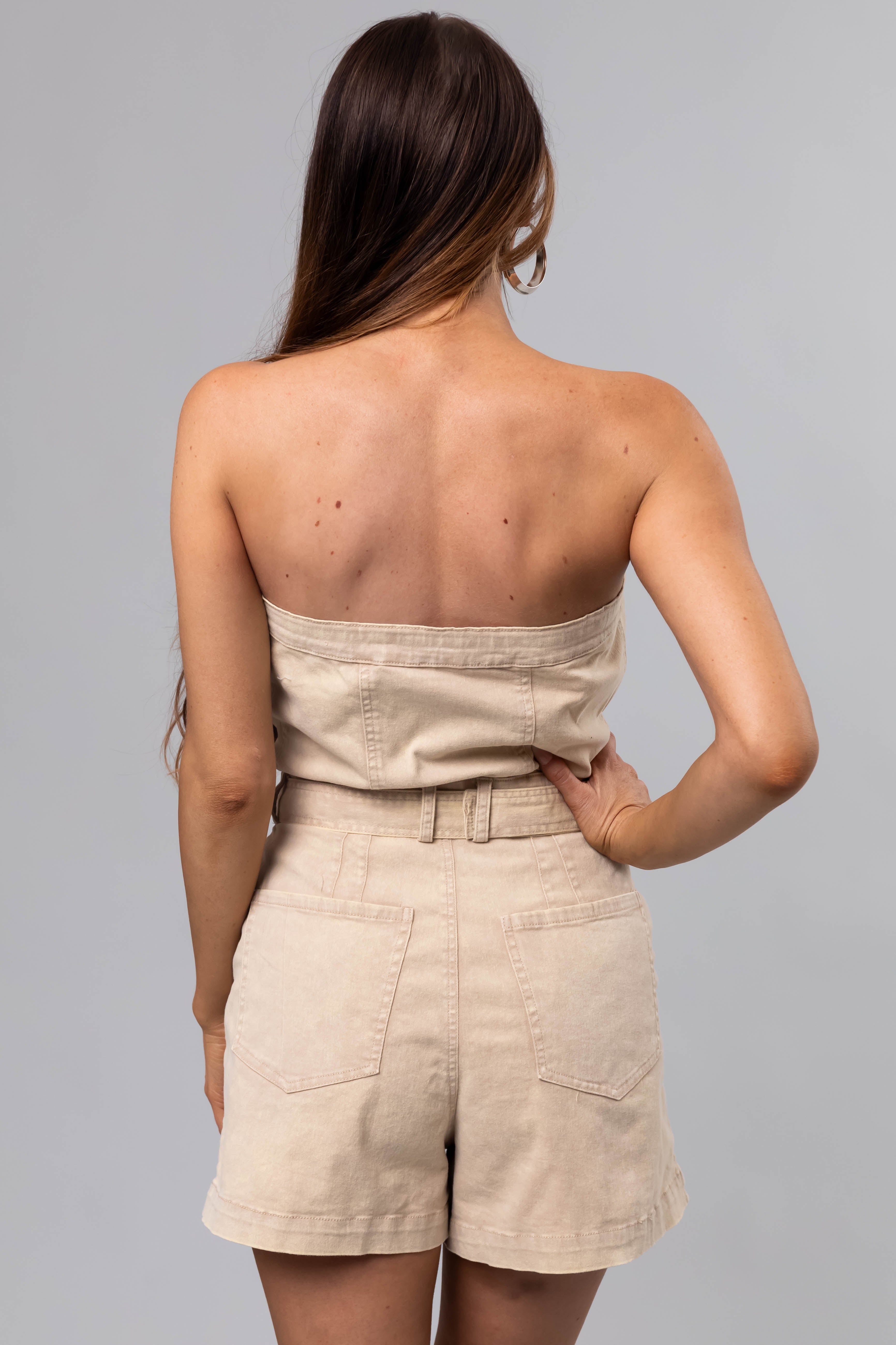 This taupe denim strapless romper dress comes in sizes S, M, and L. With a bust range of 32″ to 34″ and a waist range of 28″ to 30″, it features a torso length of 24″ to 25″ and an inseam of 3″. Designed with a stretchy denim fabric, zip up front with button closure, 4 pockets, belt loops, and a removable belt, this dress is unlined and made of 97% Cotton with 3% Spandex for comfort. Hand wash cold, dry flat, iron on low. Each piece is unique due to the dying and washing process. Model size: Small – Height 58″.
