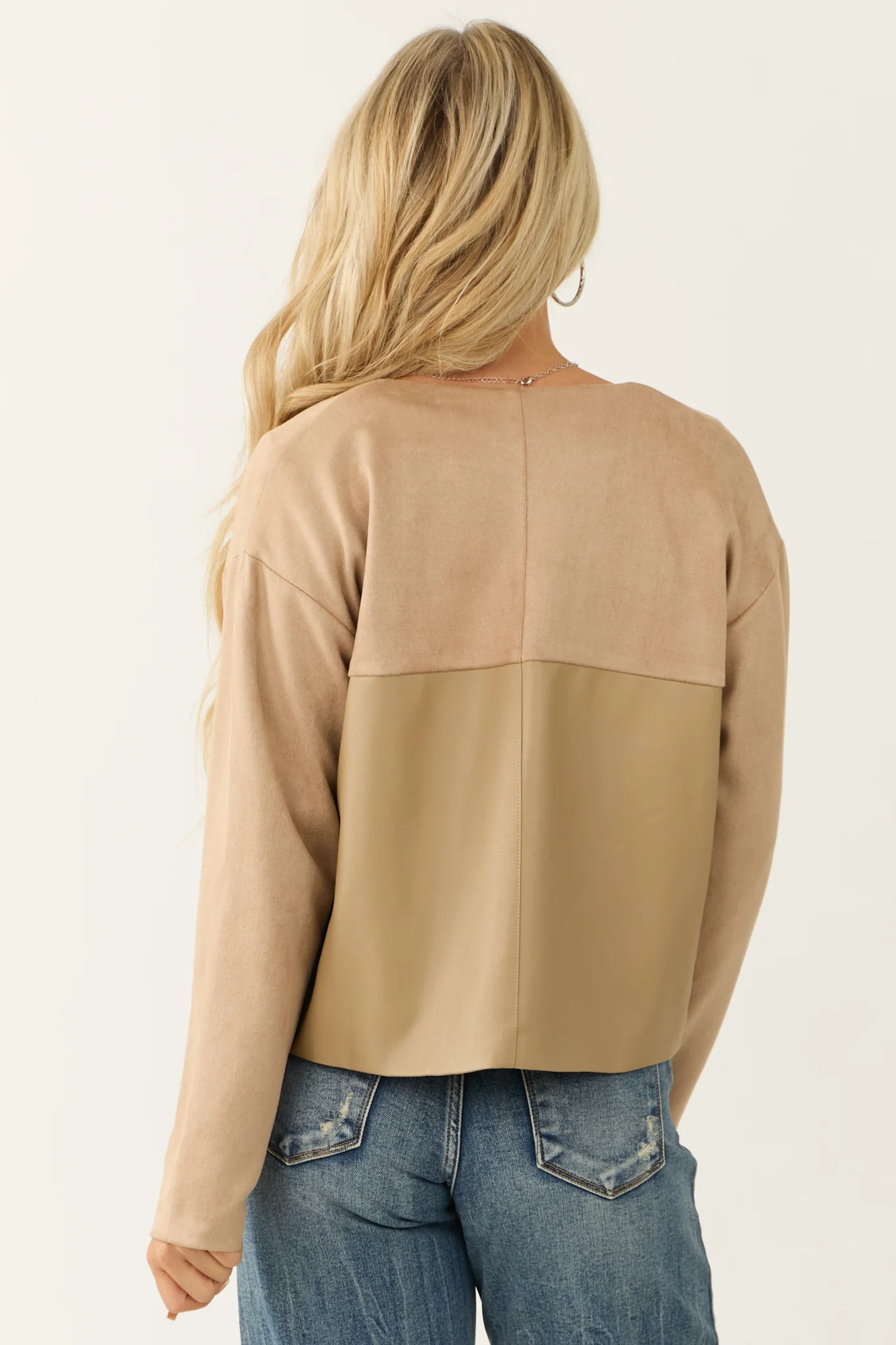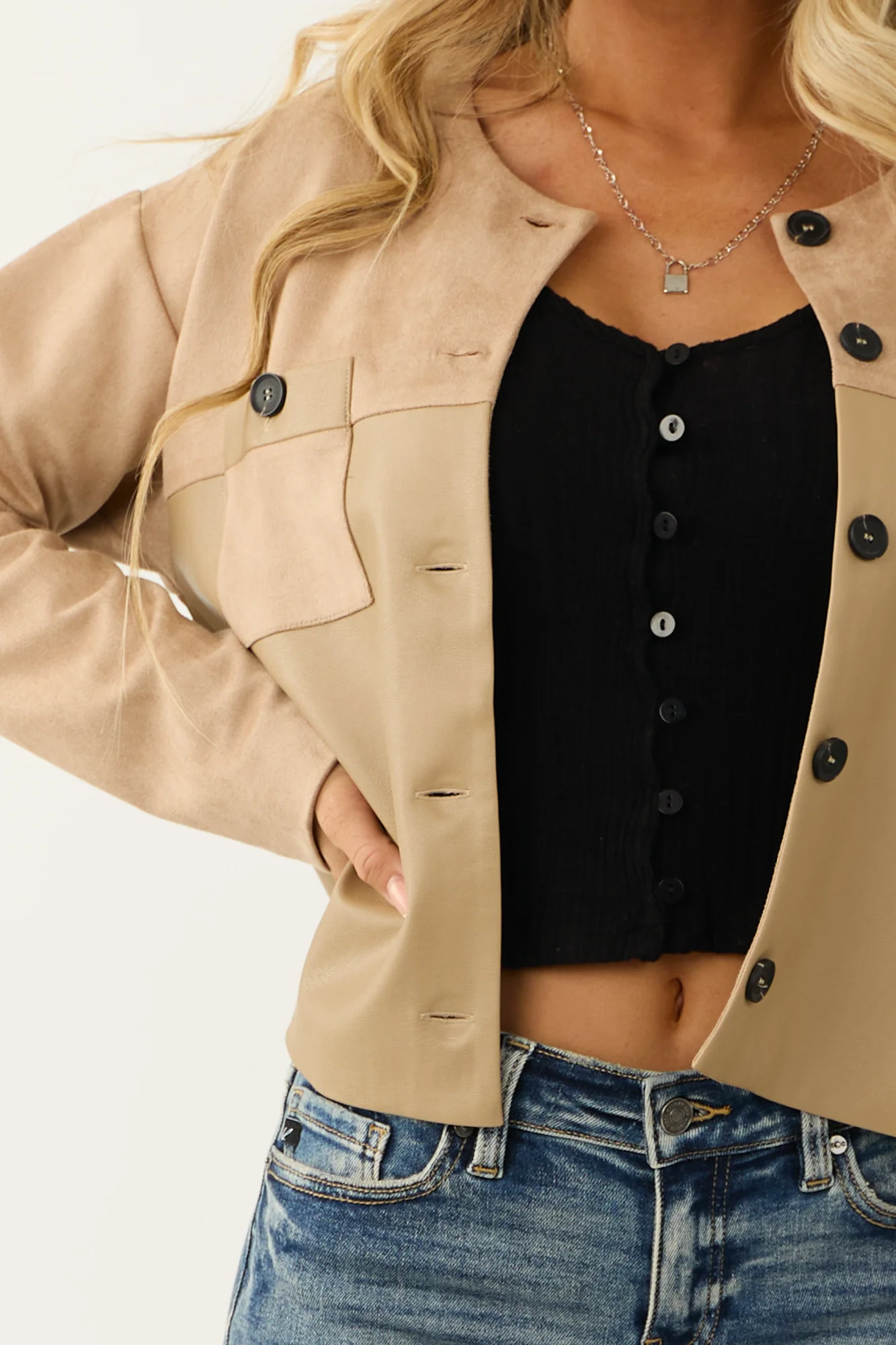 Stay stylish and warm with our versatile Taupe Faux Suede and PU Jacket, featuring non-stretchy faux suede, button-down front, chest pockets, round neckline, and long sleeves. Lined with 100% Rayon, this jacket is perfect for cool evenings. Hand wash cold for best care.