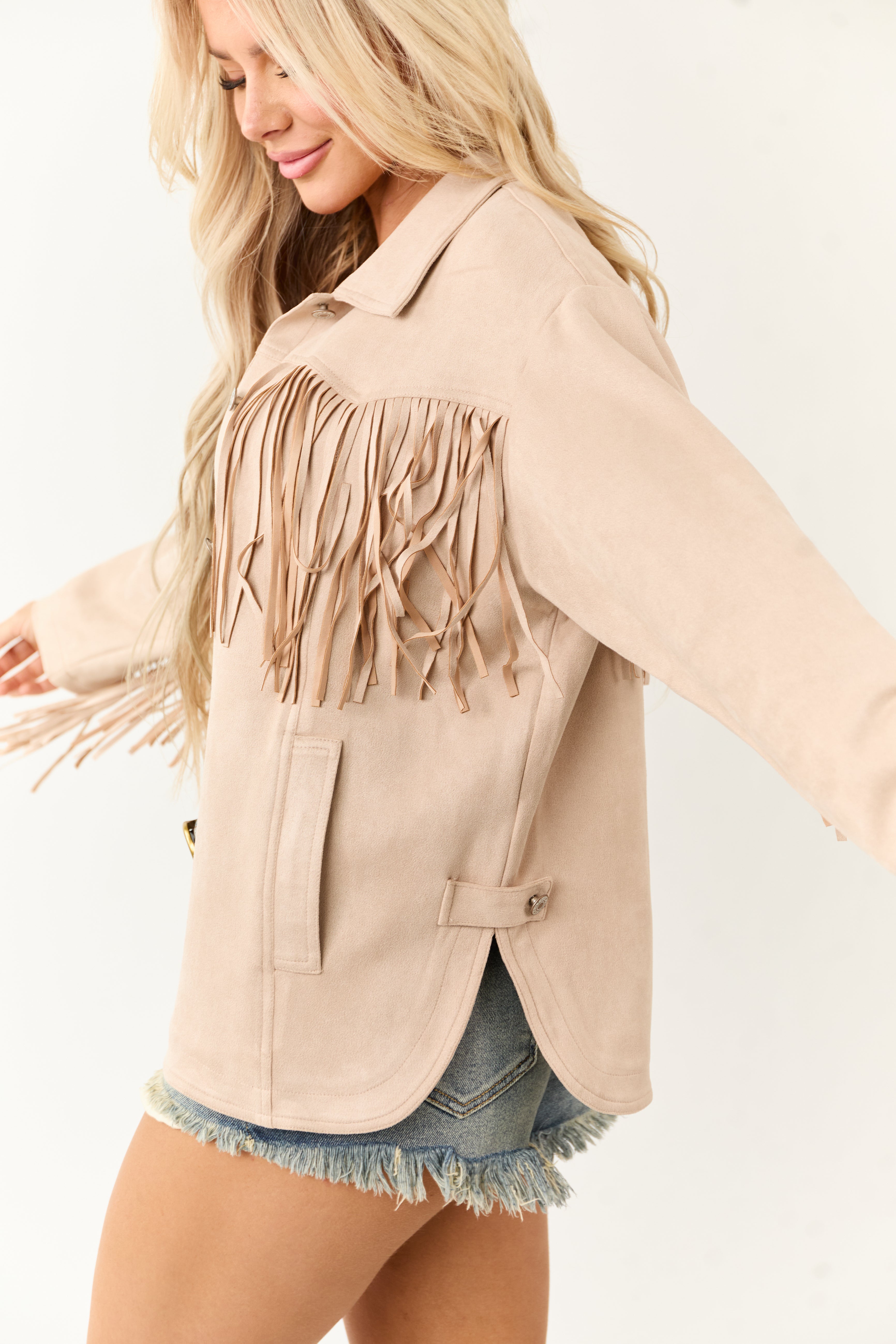 Step into western vibes with this taupe faux suede fringe jacket featuring a classic collar and button-down style for effortless cool. Crafted from stretchy faux suede, this jacket boasts a collared neckline, button-up closure, side pockets, side button straps, and is made of 90% Polyester and 10% Spandex. Imported. Model is wearing a size Small. Model’s Profile: Size 3, Height 57″, Bust 35″, Waist 26″. Embrace the essence of the west with a modern twist.