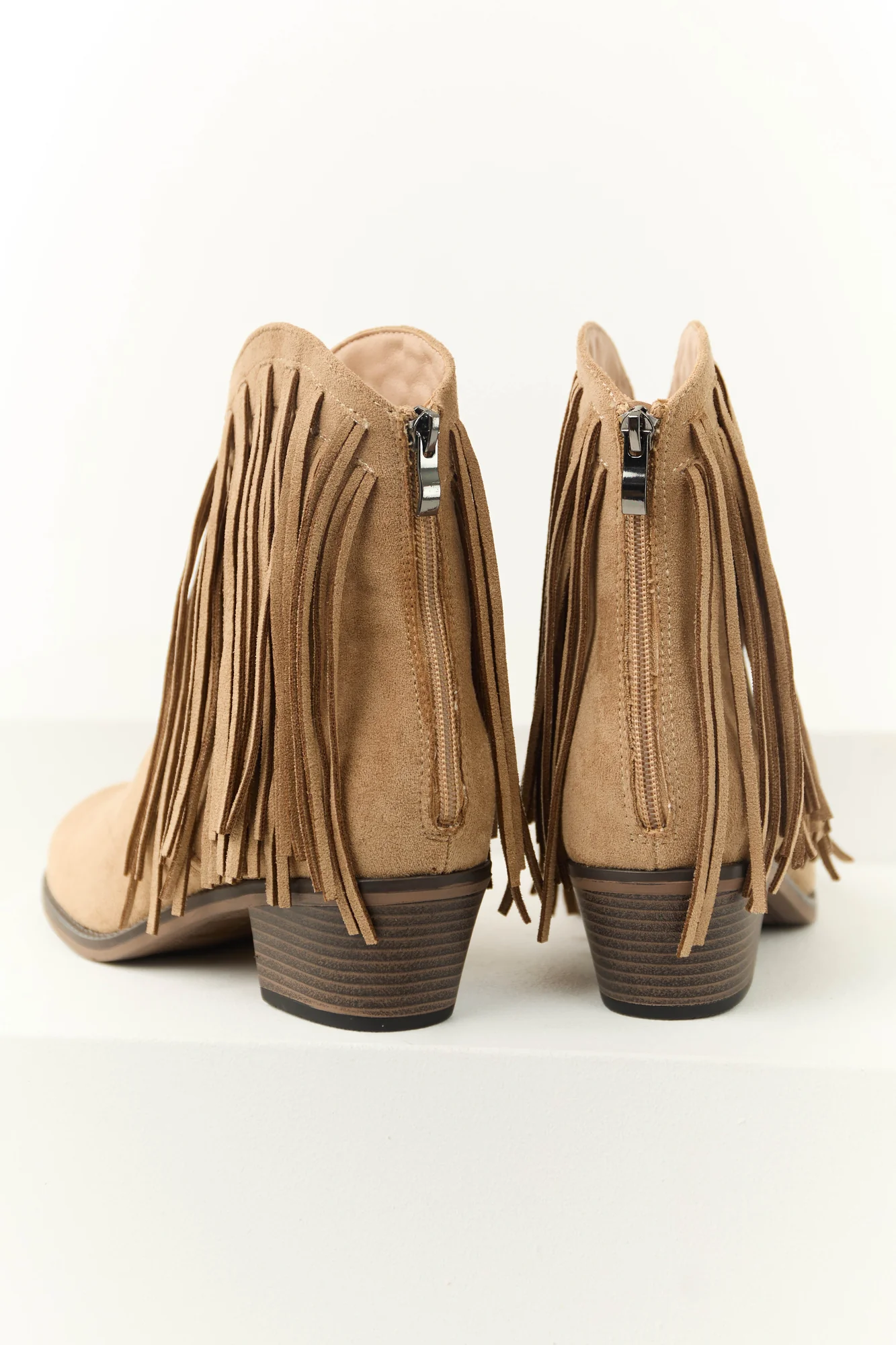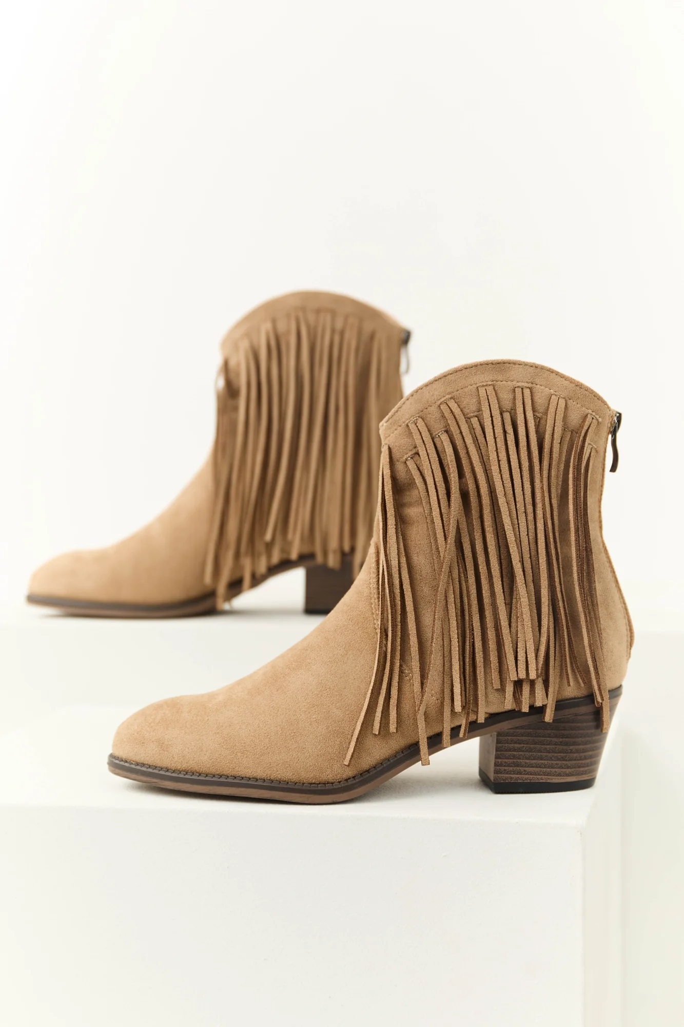 Step out in style with our Taupe Fringe Stacked Heel Suede Booties for a chic and trendy look. Crafted from faux suede, these booties feature a pointed toe and a comfortable 2-inch stacked heel. The back zipper provides easy wear, while the 10-inch circumference and 7.5-inch platform add flair to your outfit. Imported and measured on size 8, these booties are perfect for both daytime and date night looks.