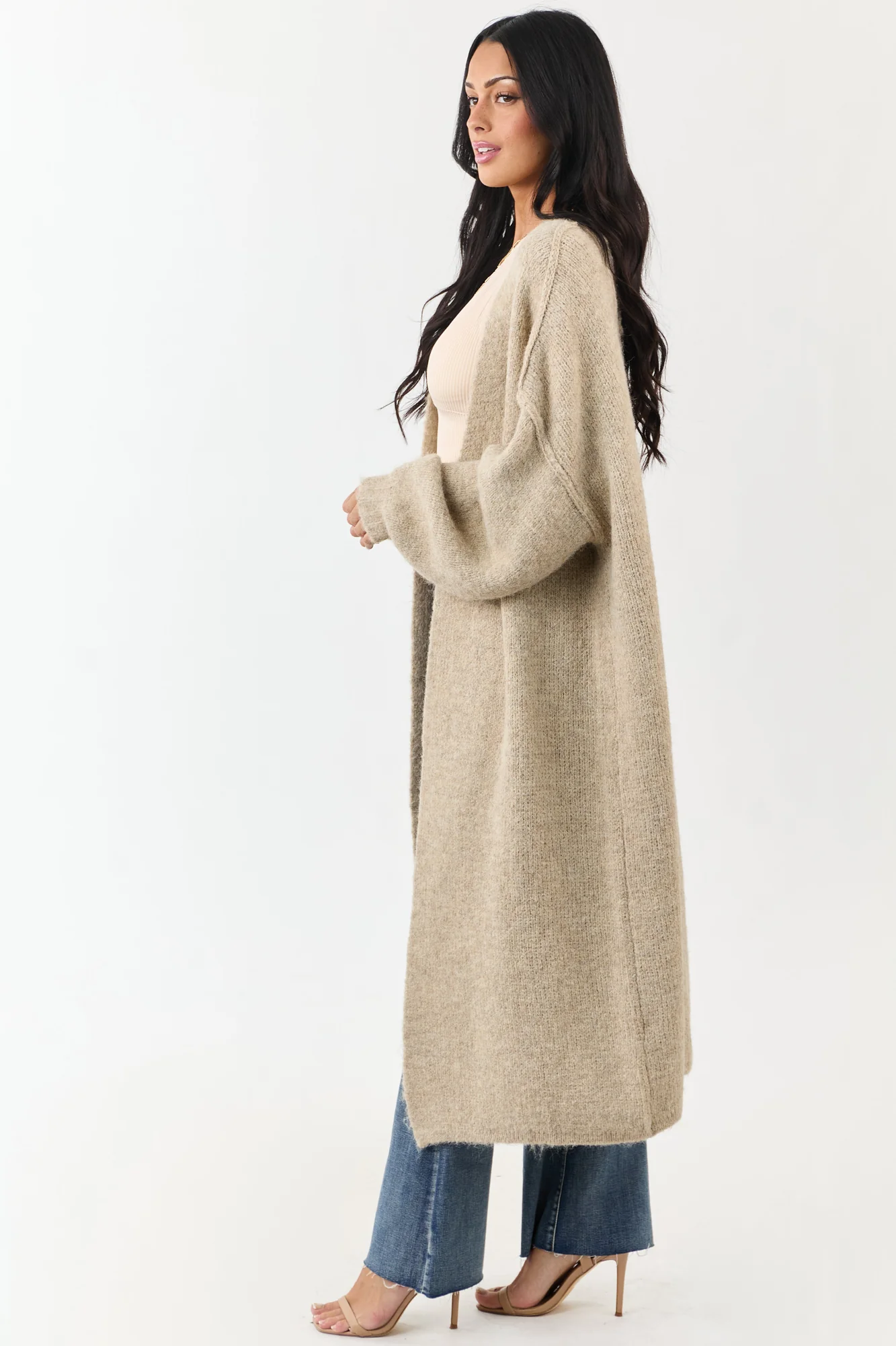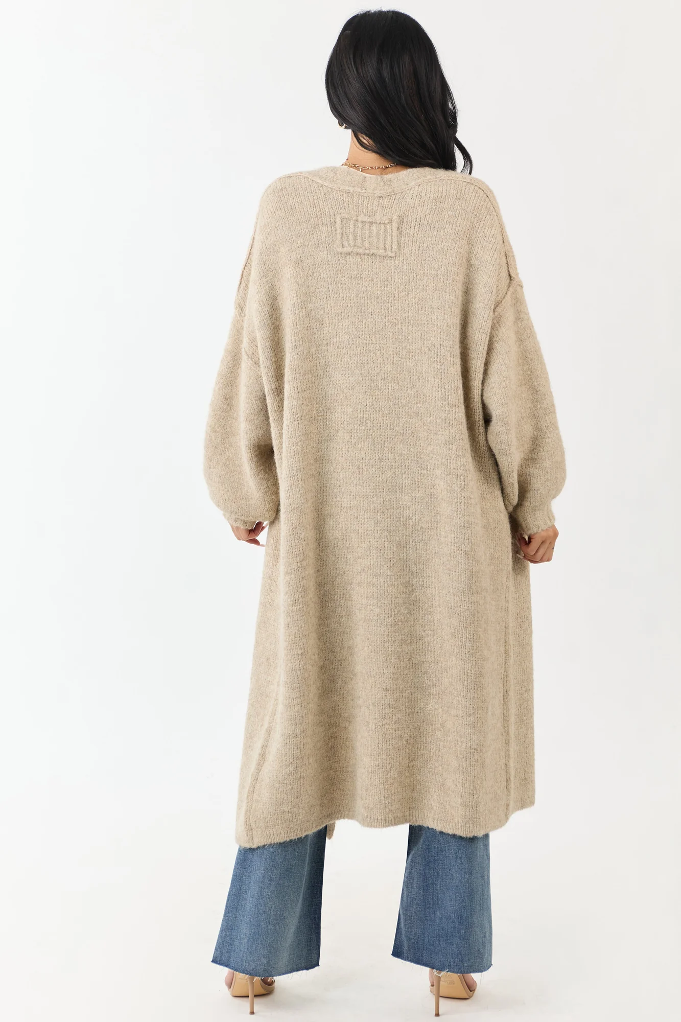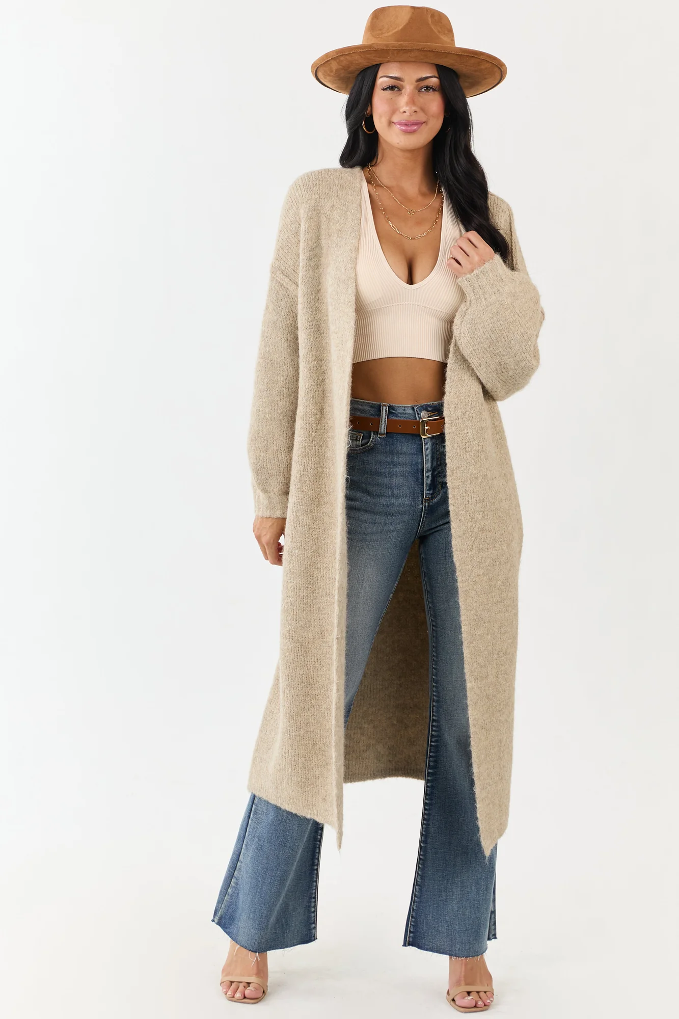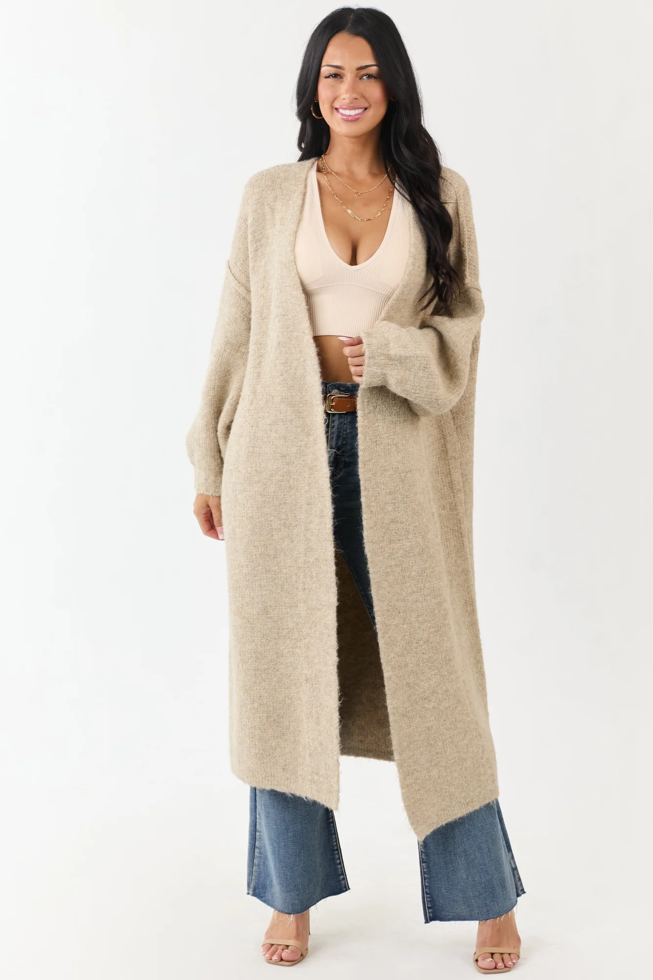 Stay cozy and stylish in this taupe knit duster cardigan. With a relaxed fit and stretchy knit fabric, this open front cardigan features ribbed trim, drop shoulders, and a neutral tone that pairs seamlessly with any Fall outfit. Made of 72% Polyester, 15% Acrylic, and 13% Nylon. Available in sizes S, M, and L. Elevate your wardrobe with this versatile and comfortable layering piece that effortlessly complements your look. Model is wearing size Small.