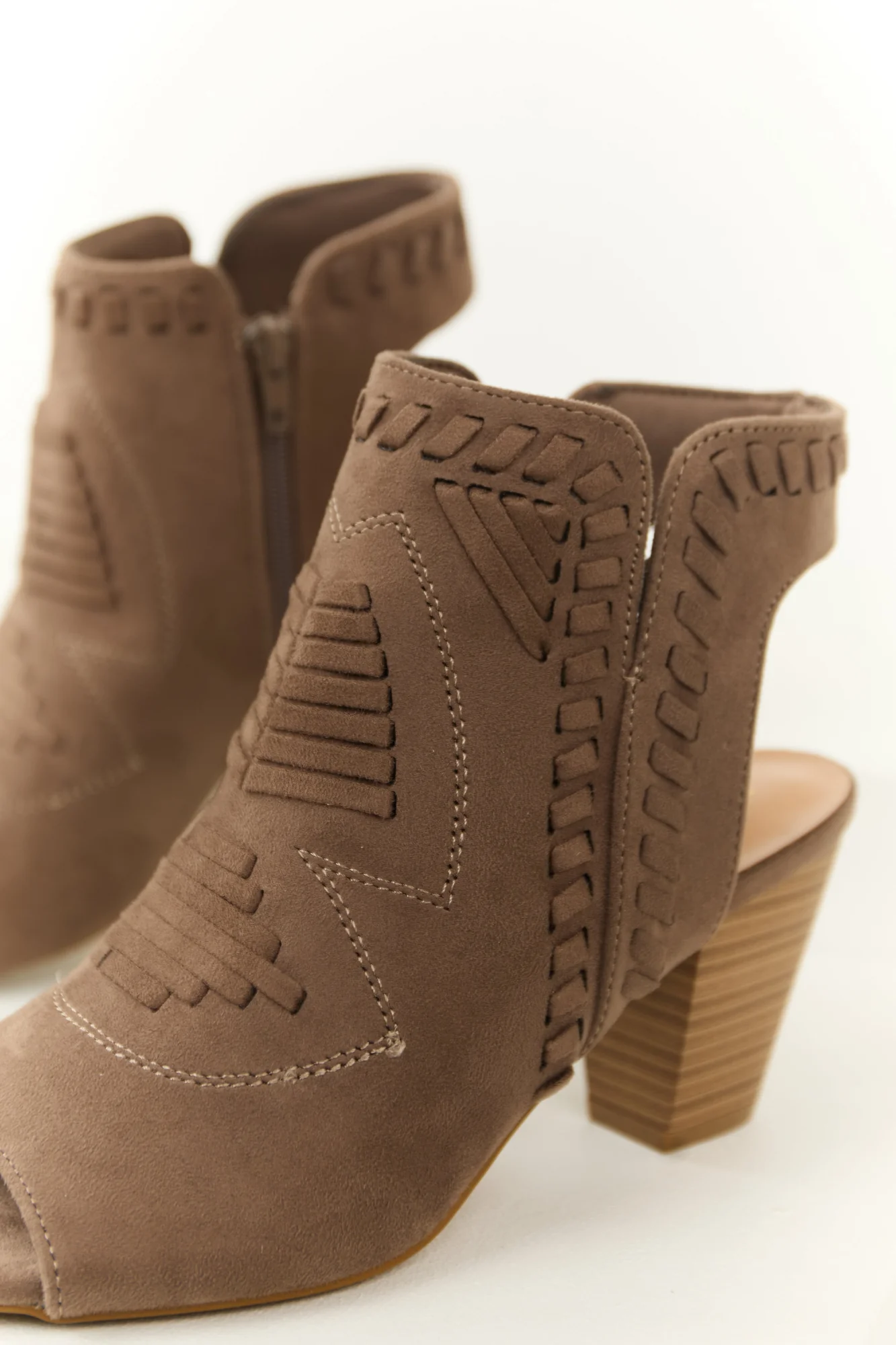 Step out in style with these Taupe Faux Suede Block Heel Ankle Boots. Featuring Western threading, side zipper closure, and a nude lightly cushioned insole for all-day comfort. Elevate your look with a 3″ block heel that combines fashion and function effortlessly. These ankle boots are perfect for date nights or daytime outings. The Shaft measures 4.5″ and the Circumference is 11″. Imported. Product measured on size 8.