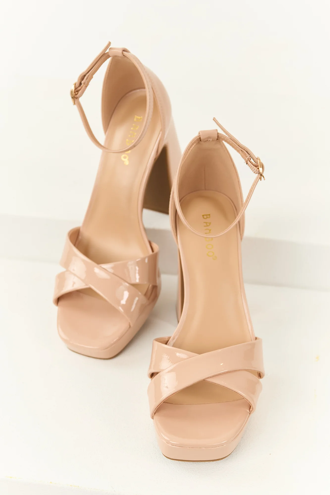 Elevate your look with these stunning taupe patent faux leather sandals. Perfect for weddings, nights out, or adding a touch of sophistication to any outfit. Features an adjustable buckle ankle strap, lightly cushioned insole, and a 4.25-inch block heel with a 1-inch platform. Imported.