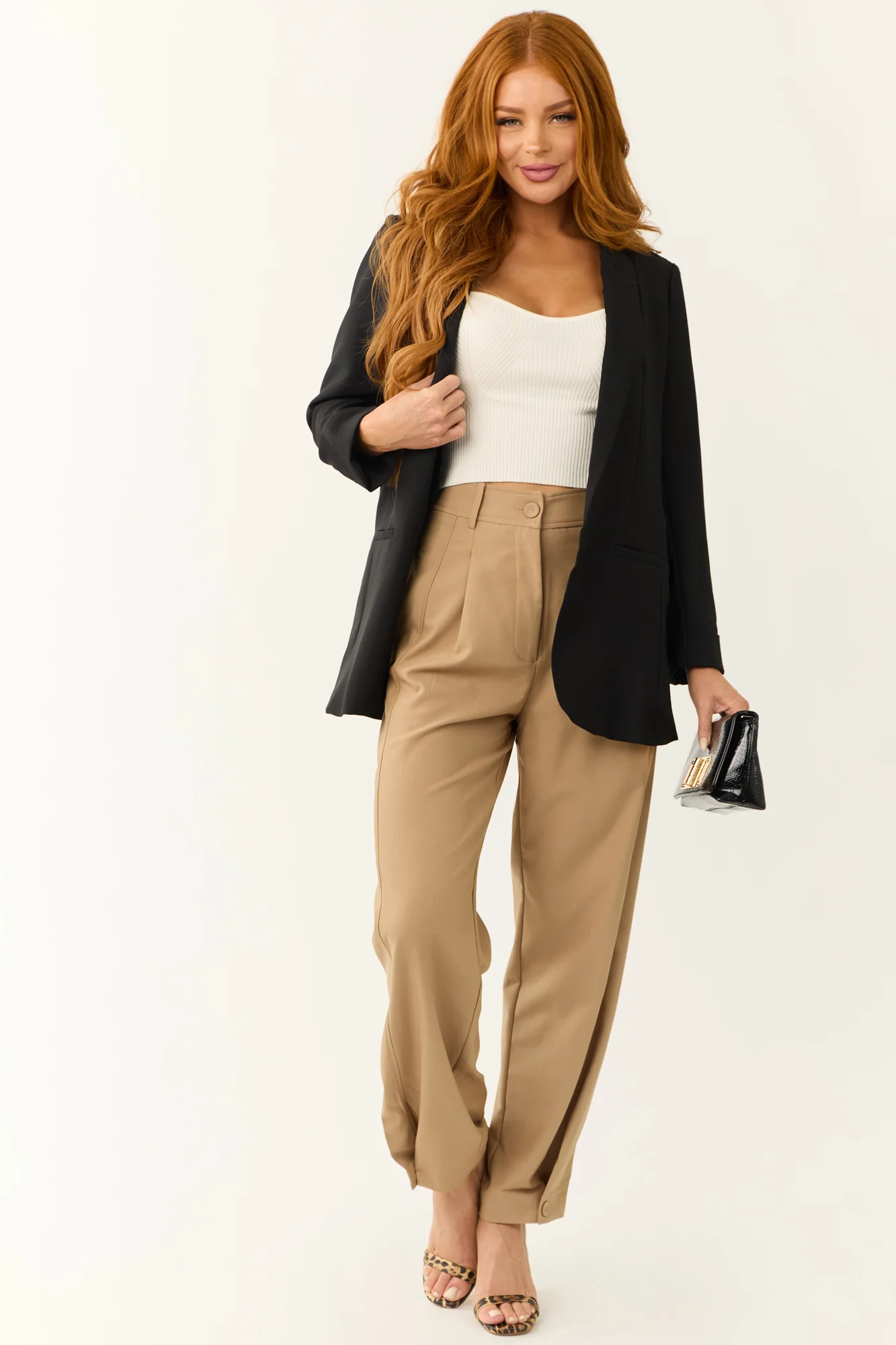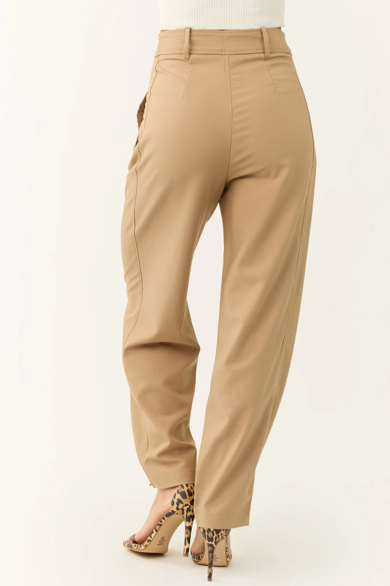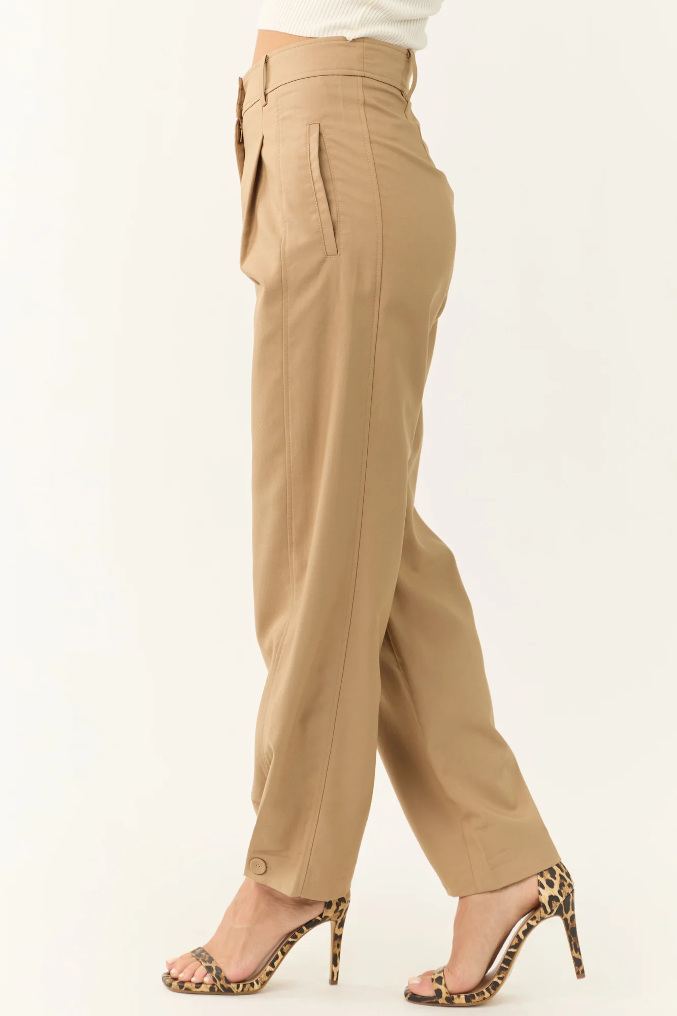 Experience comfort and style with our Taupe Pleated Cuff Womens Pants. Available in sizes S, M, and L, these non-stretchy woven pants feature a zipper fly with button closure, pleating details, side pockets, and buttoned cuffs. Complete with belt loops for a perfect fit. Crafted from 100% Polyester. Ideal for casual or daytime outings. Hand wash cold, do not bleach, line dry, iron at low heat. Model is size Small, height 55″ bust 31″, waist 24″.