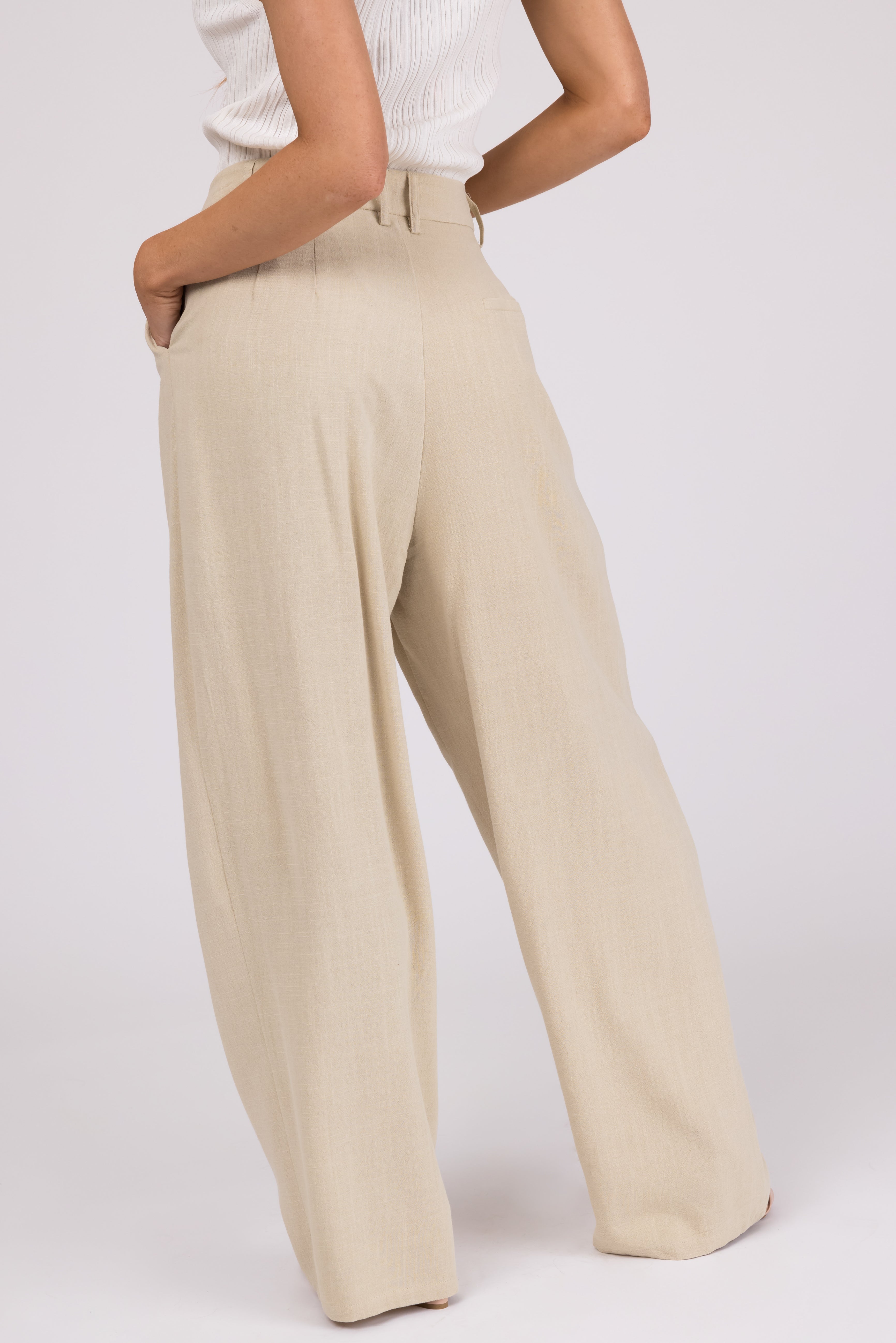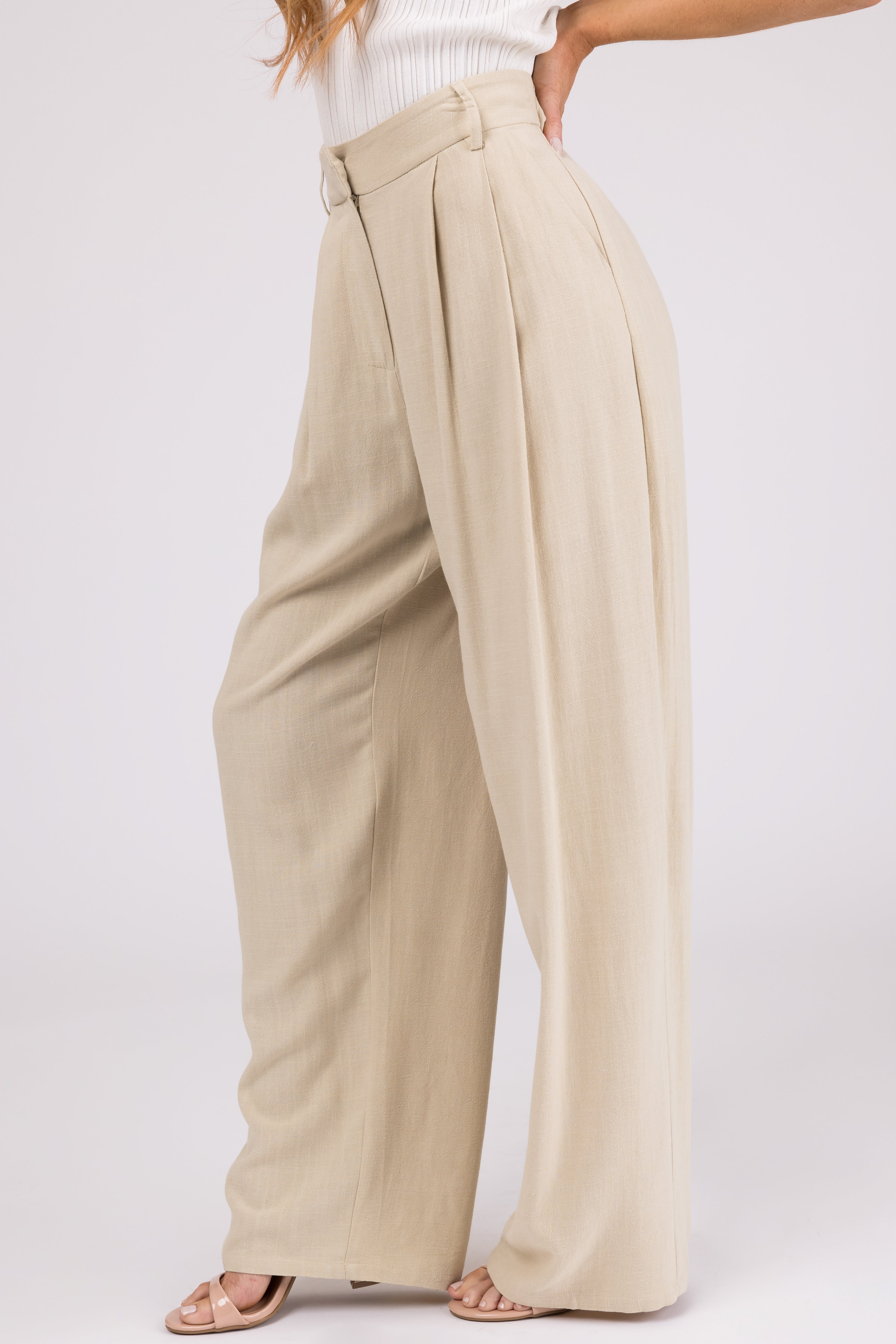 Stay cool and chic in these taupe pleated wide-leg pants made of a non-stretchy linen blend. Featuring a zipper fly with hidden hook closure, pockets, belt loops, and an unlined design. Perfect for casual daytime wear, these pants are imported and crafted from 70% Rayon and 30% Linen with a lining of 95% Polyester and 5% Spandex. Please note, hand wash cold, iron at low heat, do not bleach, and line dry. Model is wearing a Small. Model’s Profile: Size 1, Height 55″, Bust 31″, Waist 24″.