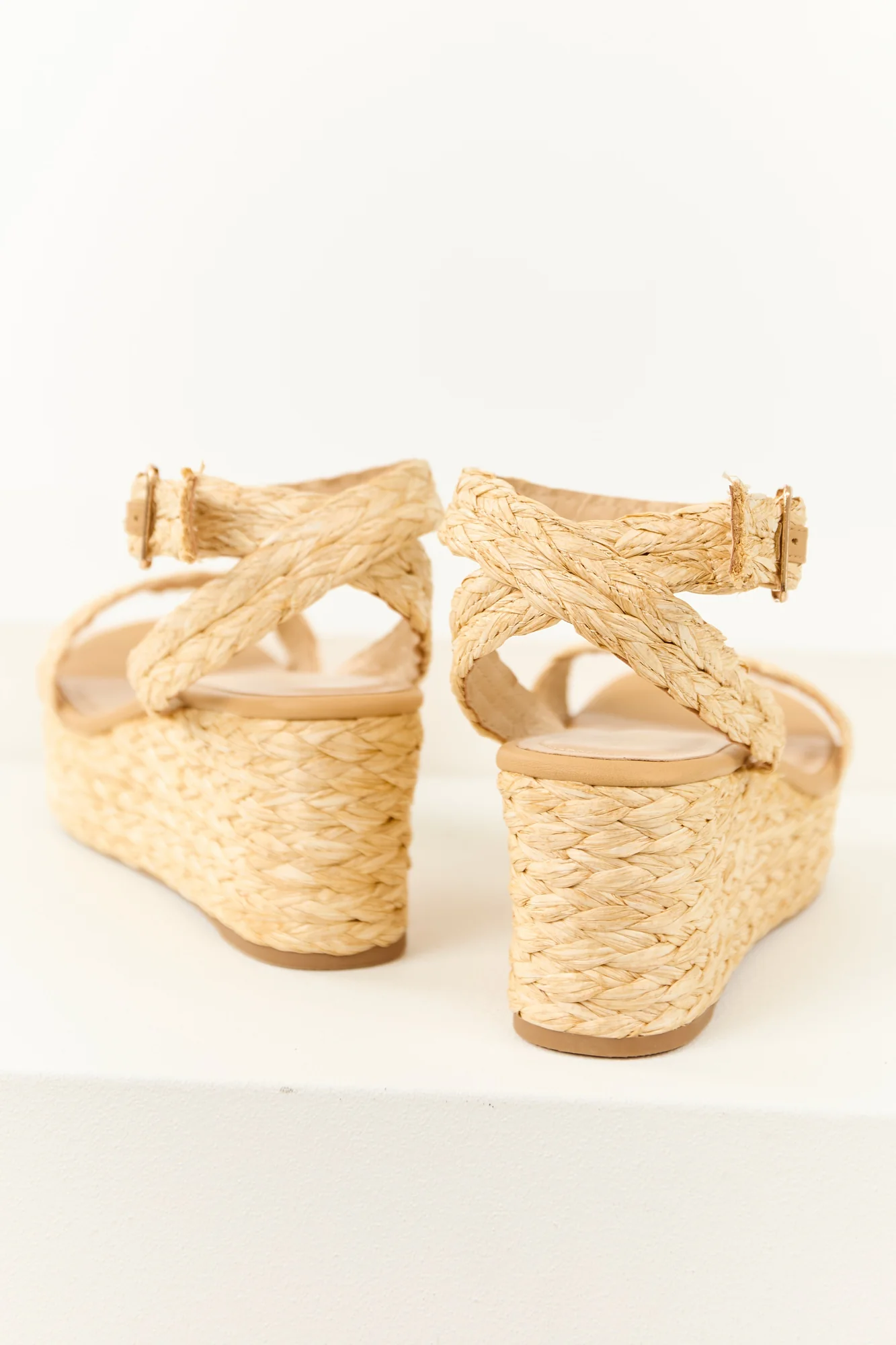 Experience both comfort and style with these taupe raffia platform wedges. The adjustable buckle ankle strap ensures a perfect fit, while the open round toe design adds a chic touch. Made of non-stretchy woven raffia, these wedges feature a slightly cushioned insole for all-day wearability. Elevate your look with a 3″ heel and 1.5″ platform. Shaft height: 6.5″ Circumference: 9.5″. Available in multiple sizes. Product measured on size 8.