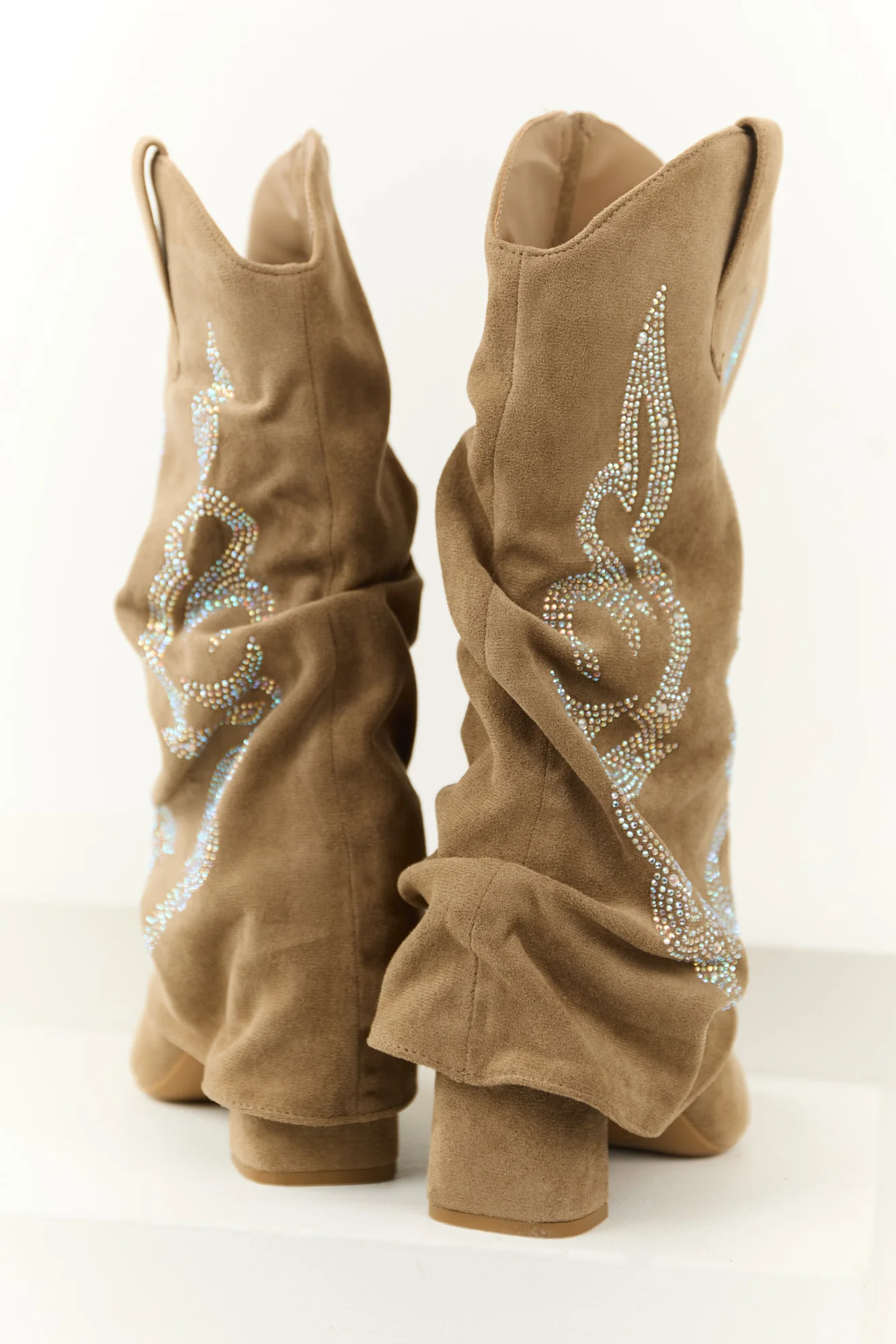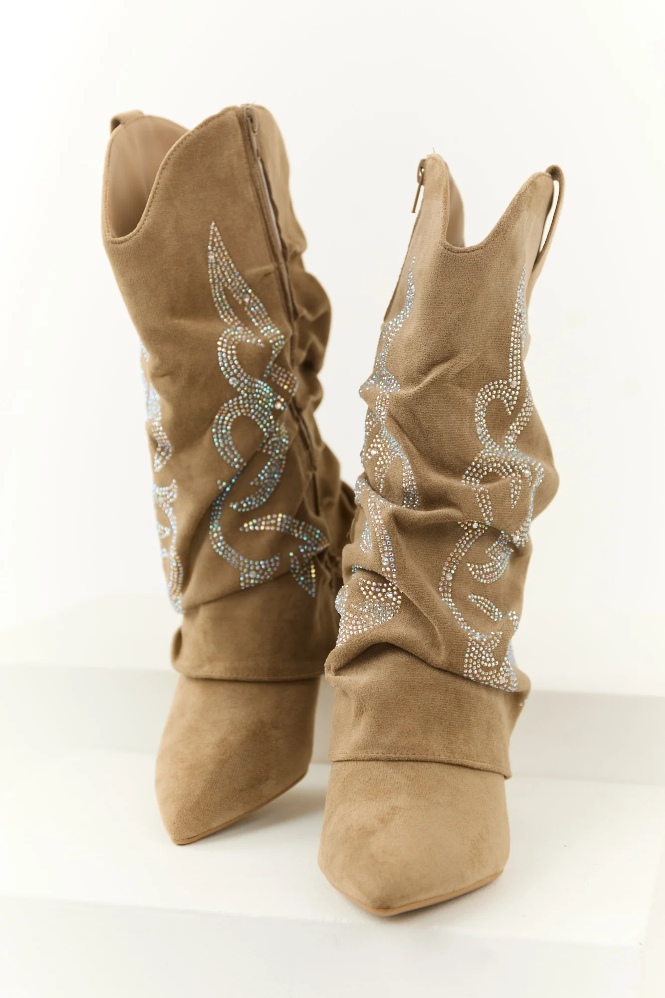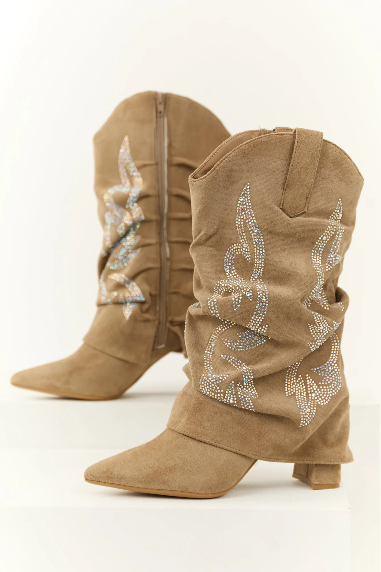 Tags: Block Heel, faux suede, Pointed Toe, rhinestone overlay, Taupe Boots