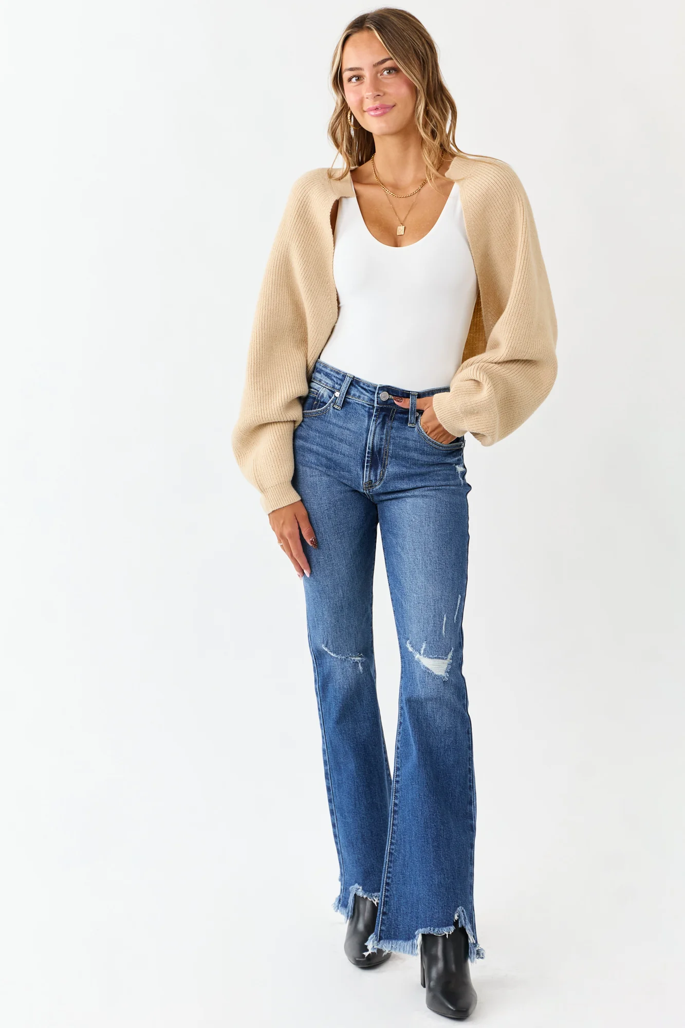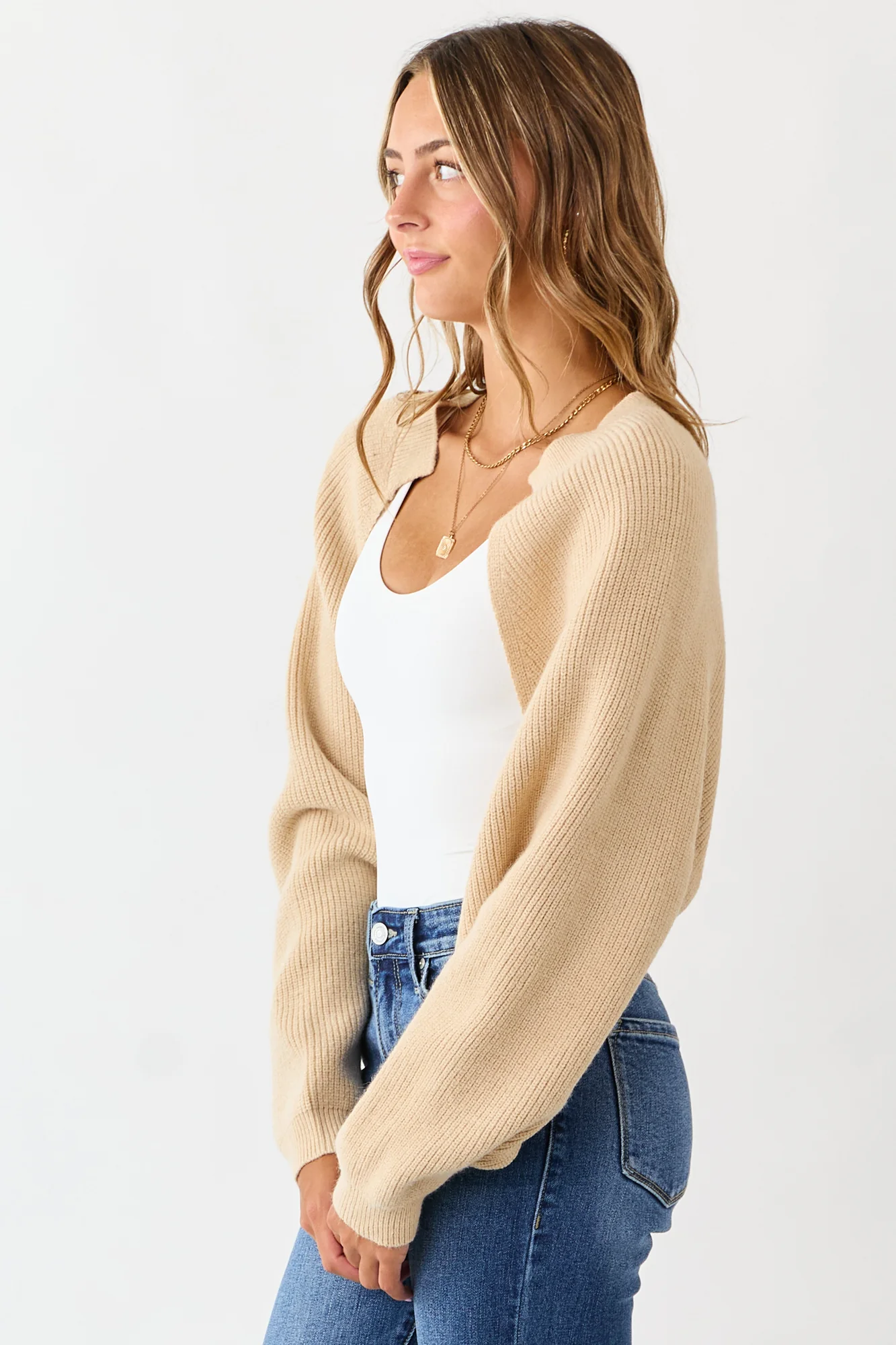 Embrace a relaxed silhouette with this stylish taupe rib knit cropped shrug cardigan featuring stretchy ribbed knit, banded trim, and chic balloon dolman sleeves. Made from 42% Acrylic, 30% Polyester, and 28% Nylon for ultimate comfort. The open front design adds a trendy touch to any outfit. Available in sizes Small, Medium, and Large. Perfect for all seasons, pair it with your favorite tops for a fashionable look. Model is wearing size Small. Model’s Measurements: Height 57″, Bust 34″, Waist 25″.