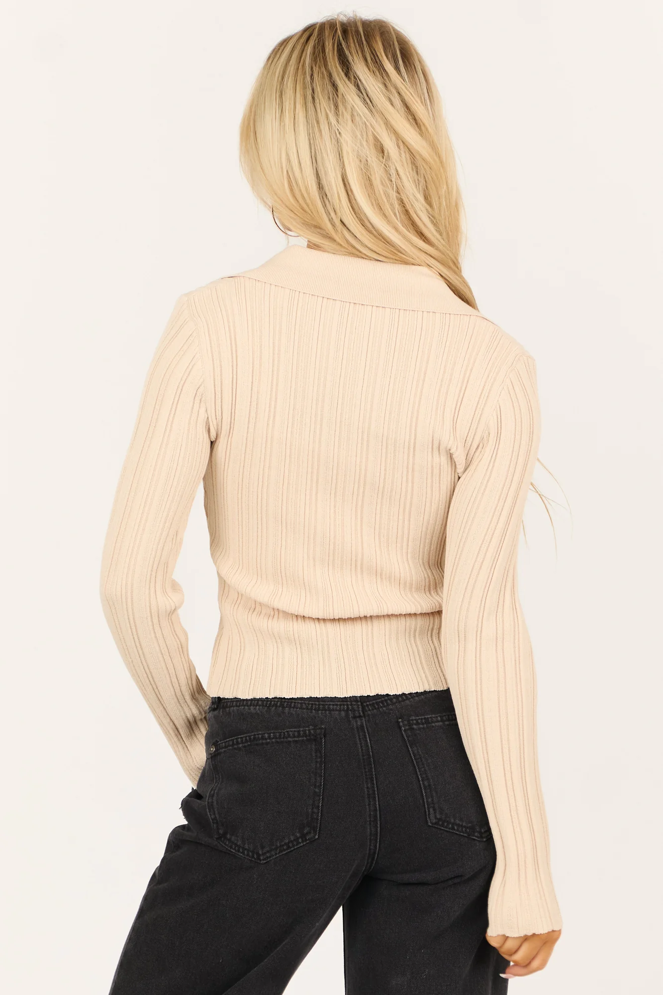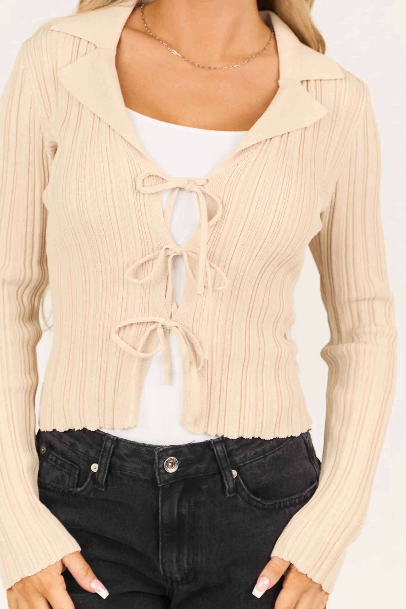 Stay effortlessly stylish in this Stretchy Ribbed Front Tie Long Sleeve Top. Made from a blend of 60% Polyester and 40% Viscose, this top features a spread collar, open front with drawstring closure, and a flattering V neckline. The versatile taupe color complements any outfit, and the stretchy ribbed knit offers a comfortable fit. Perfect for any occasion, from casual outings to evening events. Hand wash cold, lay flat to dry. Available in sizes Small, Medium, and Large.