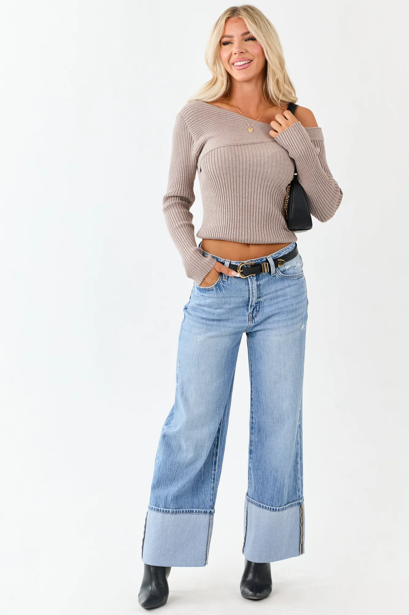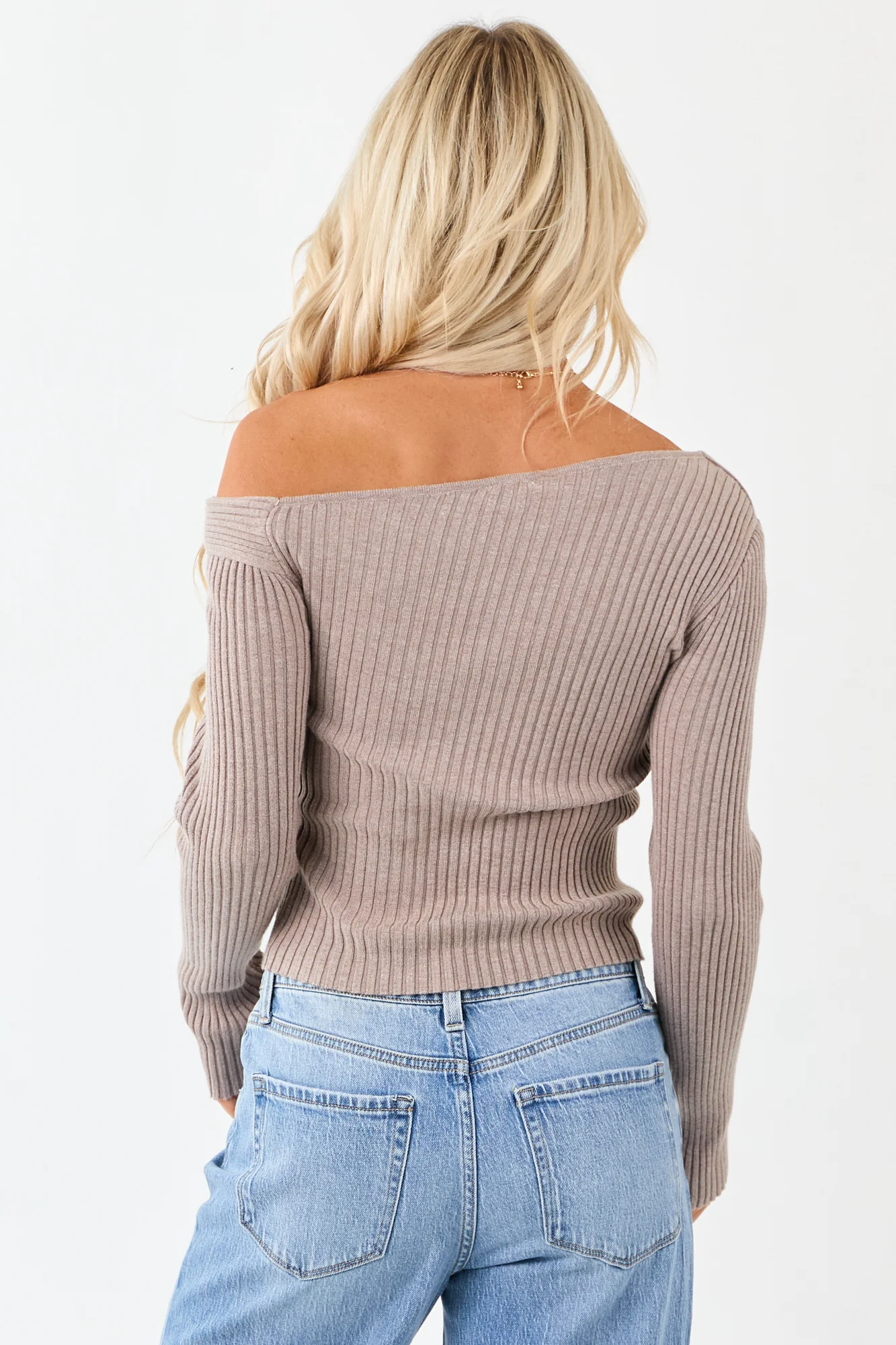 Indulge in chic comfort with our Taupe Ribbed Knit Asymmetrical Off Shoulder Sweater. This stylish piece features a sultry neckline, stretchy ribbed knit fabric, asymmetrical bust overlay, and a slightly cropped length for a modern twist. Made of 52% Rayon, 29% Polyester, and 19% Nylon, this lightweight fitted sweater is a must-have addition to your wardrobe. Elevate your style effortlessly with this versatile sweater that can be dressed up or down for any occasion. Available in sizes XS, S, M, and L.