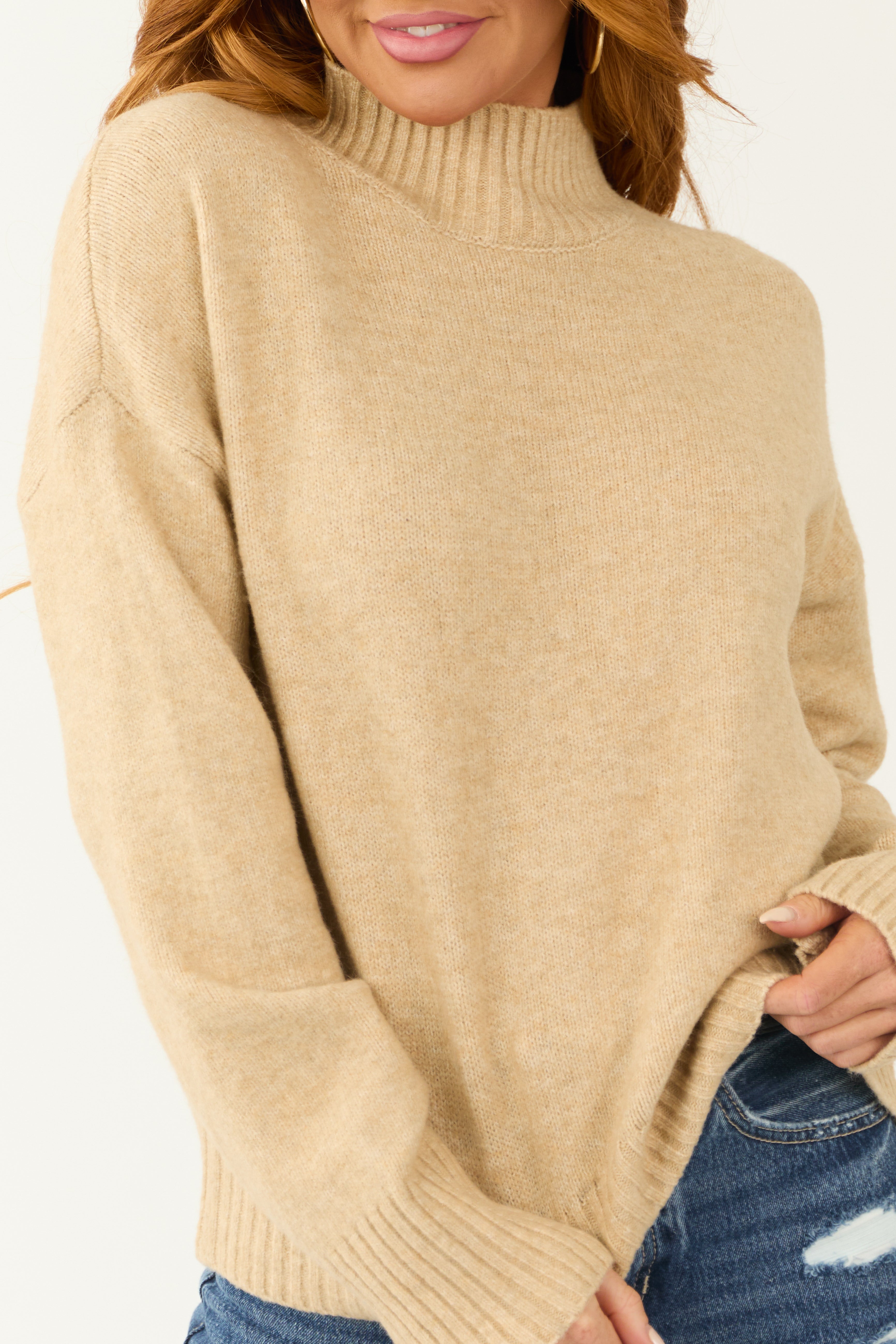 Upgrade your seasonal wardrobe with this taupe ribbed knit mock neck sweater . Available in sizes S, M, and L, this sweater boasts a loose fit for comfort and style. Crafted from a stretchy blend of 96% polyester and 4% spandex, it features long sleeves, drop shoulder design, and ribbed banded trim. Stay cozy and chic in this versatile sweater that pairs well with any bottom. Hand wash cold and lay flat to dry for easy care.