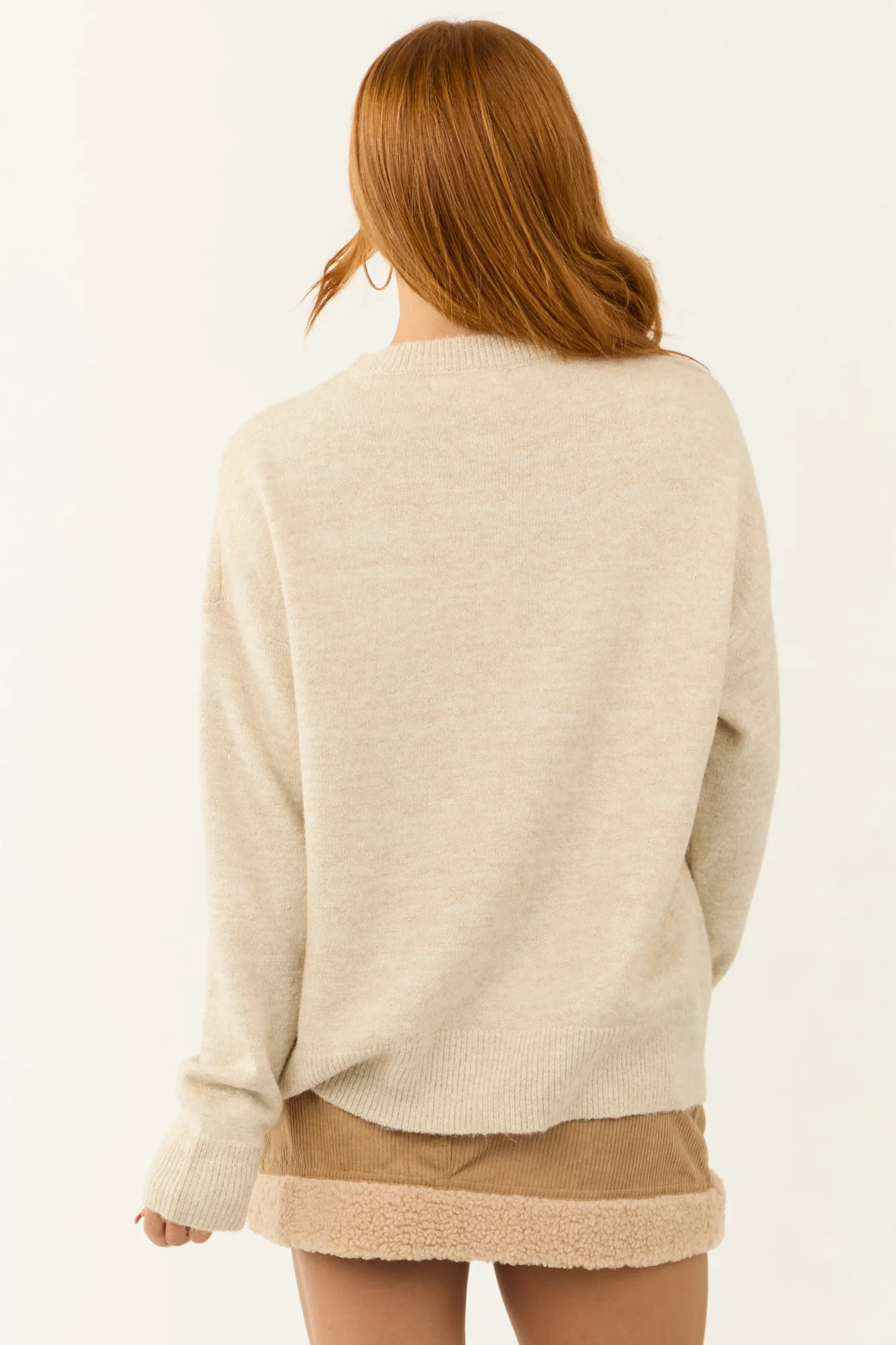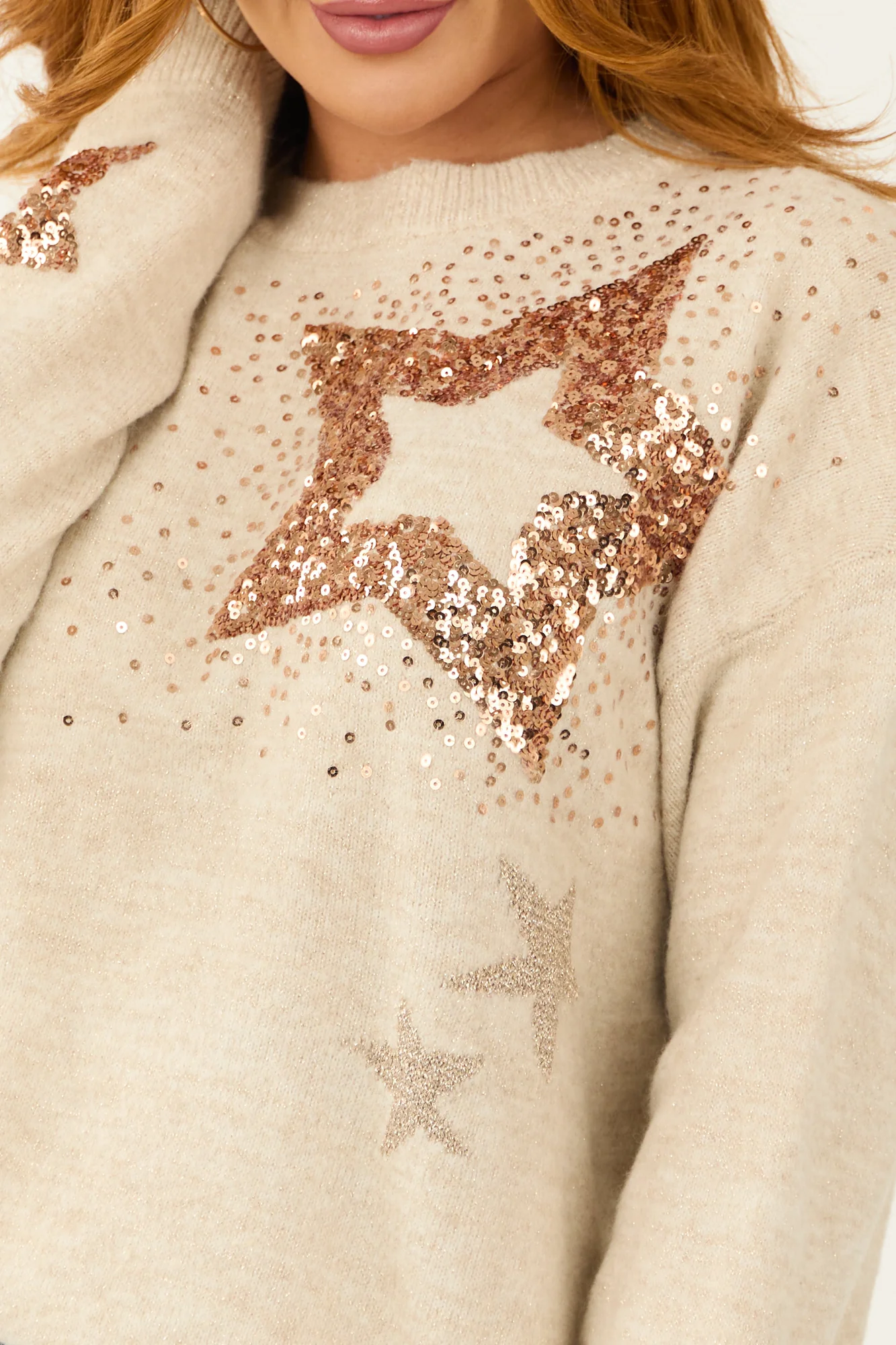 Indulge in the cozy elegance of this Taupe Sequin Star Crew Neck Sweater & Love. Available in sizes S, M, and L, this sweater features a relaxed, oversized fit with stretchy rib knit construction for ultimate comfort. Adorned with delicate sequins in Rose Gold and charming Star threading details in Almond, this sweater exudes charm. With metallic stitching and banded ribbed trim, it combines style and sophistication effortlessly. Crafted from 64% Polyester, 18% Acrylic, 15% Nylon, and 3% Spandex, this imported sweater is both luxurious and durable. This chic layering piece is perfect for the winter season. Care Instructions: Hand wash with cold water, do not bleach, lay flat to dry, no ironing. Model is wearing a size Small.Model’s Profile: Size 1, Height 55″, Bust 31″, Waist 24″