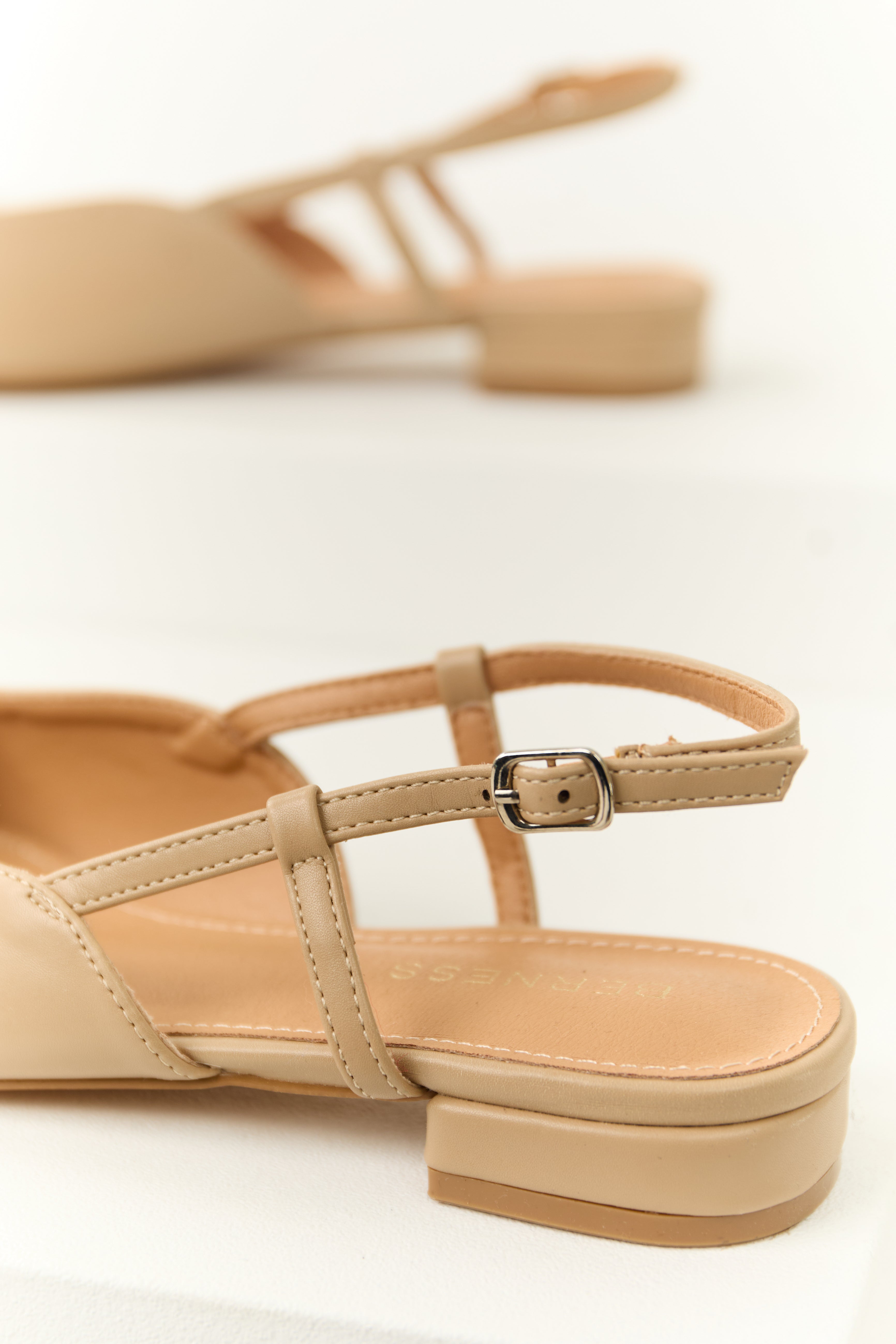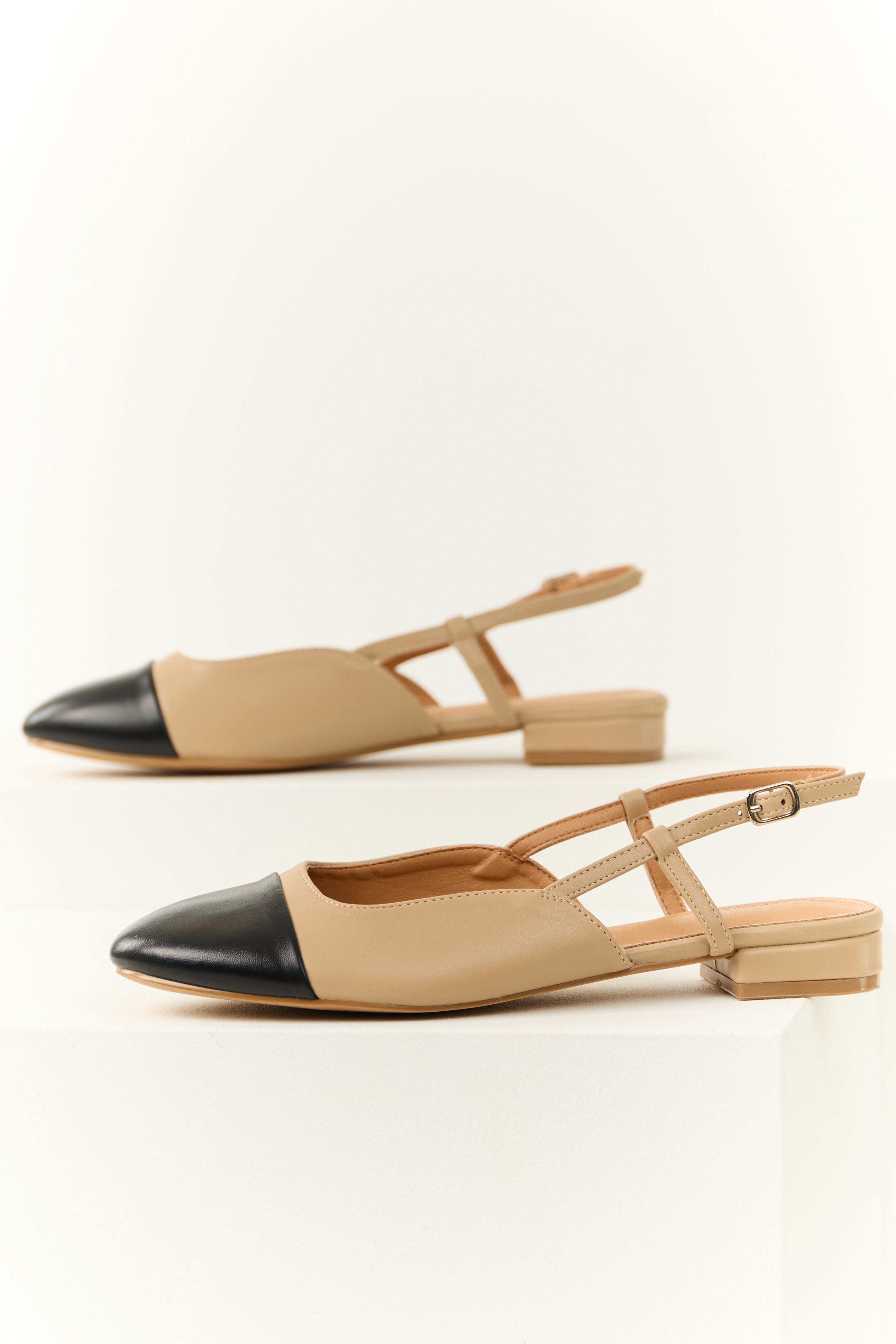 Experience style and comfort with these taupe slingback flats . Crafted from non-stretchy faux leather with a contrasting black toe. The adjustable strap offers a customized fit while the platform heel adds height without compromising on stability. These closed-toe flats feature a .25platform and a 1heel, making them perfect for daytime or work occasions. Elevate your look with these versatile and chic flats. Imported.