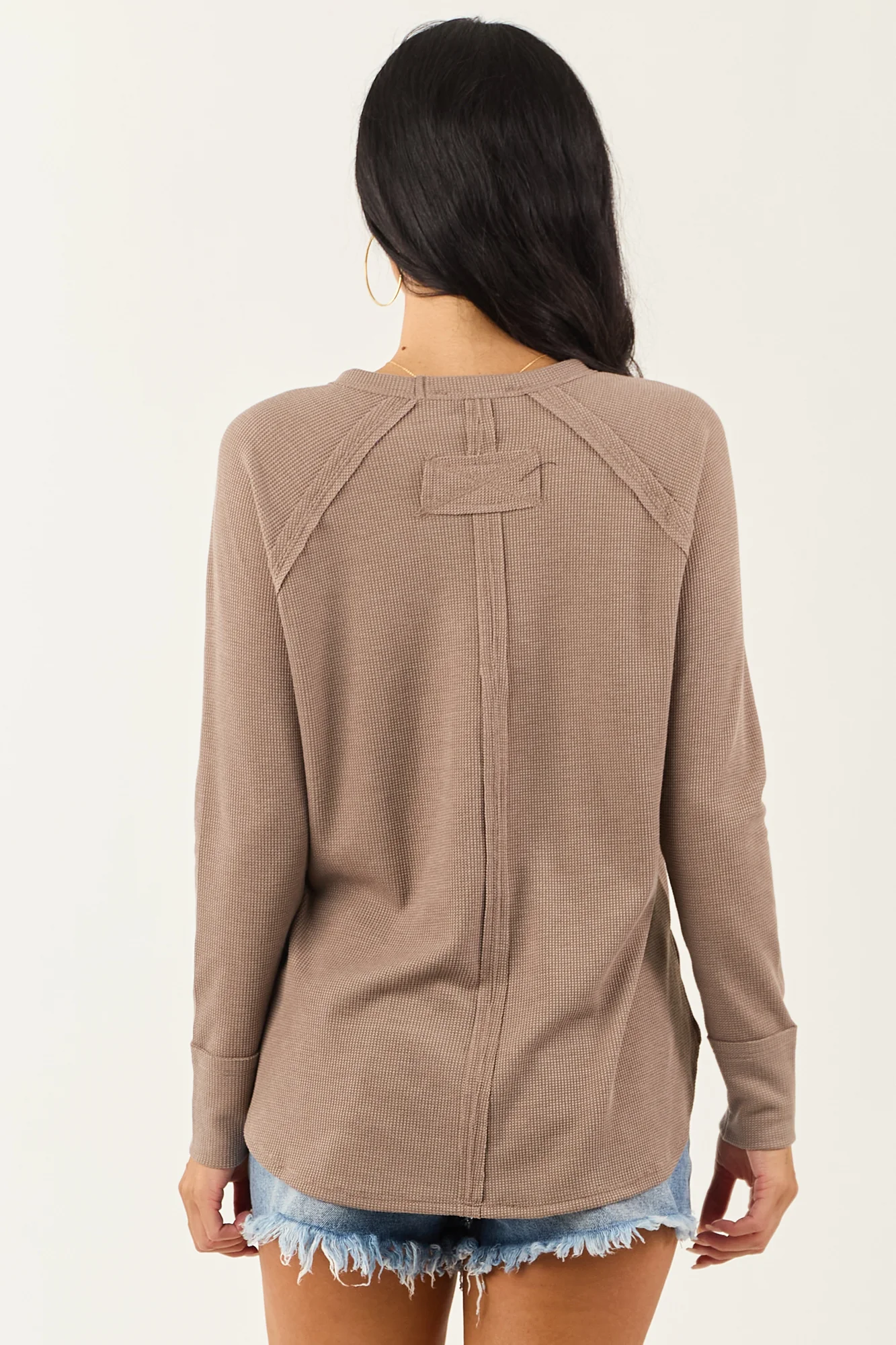 Indulge in luxurious comfort with our taupe waffle knit oversized top. Whether youre layering up or lounging at home, this top is a versatile and essential piece for your wardrobe. The stretchy fabric and relaxed fit ensure maximum coziness, while the curved hem and side slits add stylish detail. Crafted from 85% Polyester, 10% Rayon, and 5% Spandex for a soft, breathable feel. Embrace the effortlessly chic look with this must-have top.