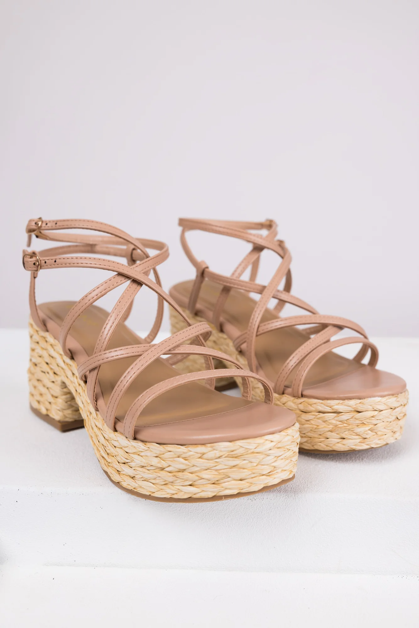 Step up your style with these taupe Strappy Woven Detail Platform Heels crafted from non-stretchy faux leather. Featuring a Straw woven platform and heel, two adjustable buckle ankle straps for a secure fit, a block heel with a 3″ heel height, an open rounded toe, and a lightly cushioned insole for all-day comfort. Shaft measures 5″ with a platform height of 1.5″ and a circumference of 10″. Imported Product measured in size 8.