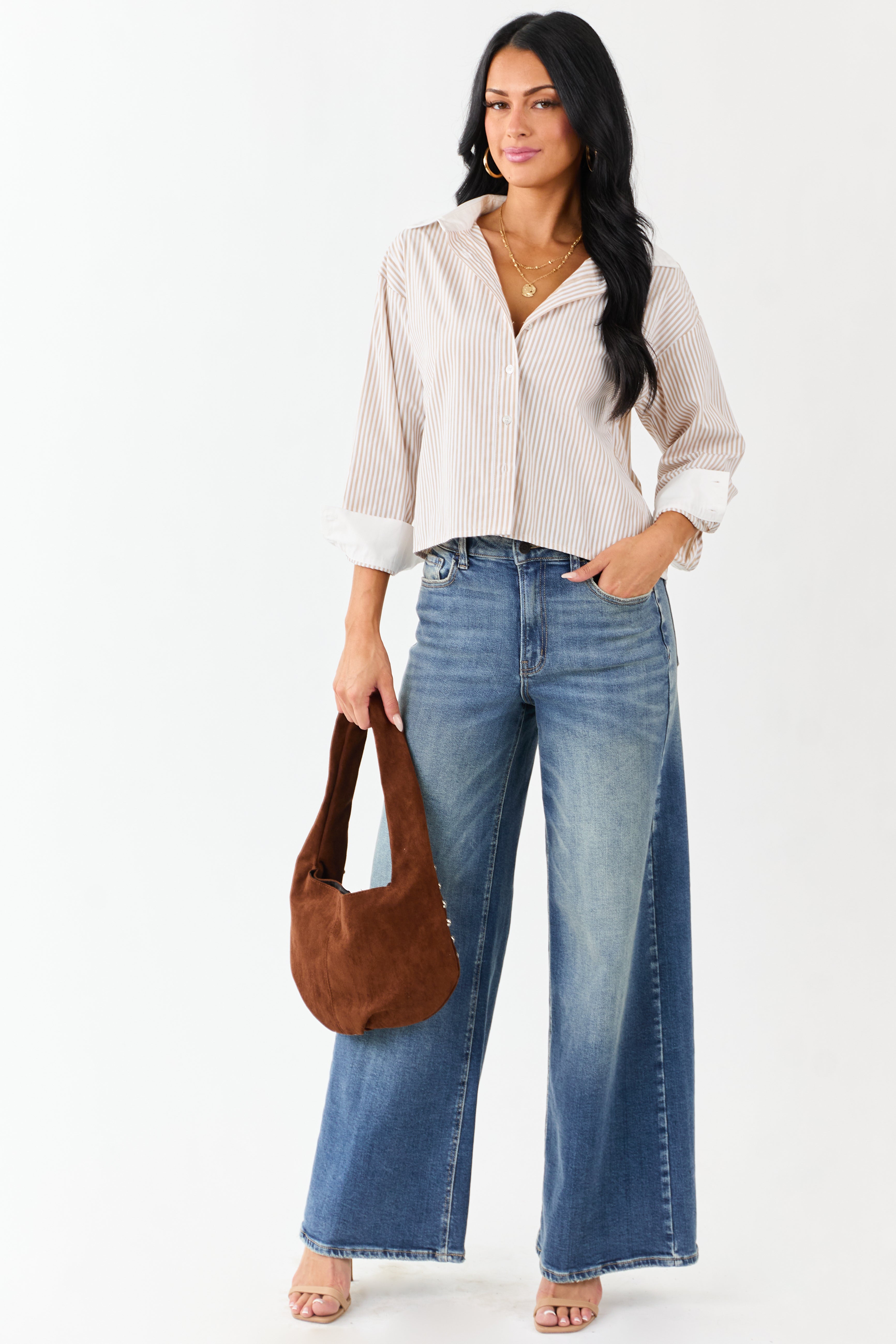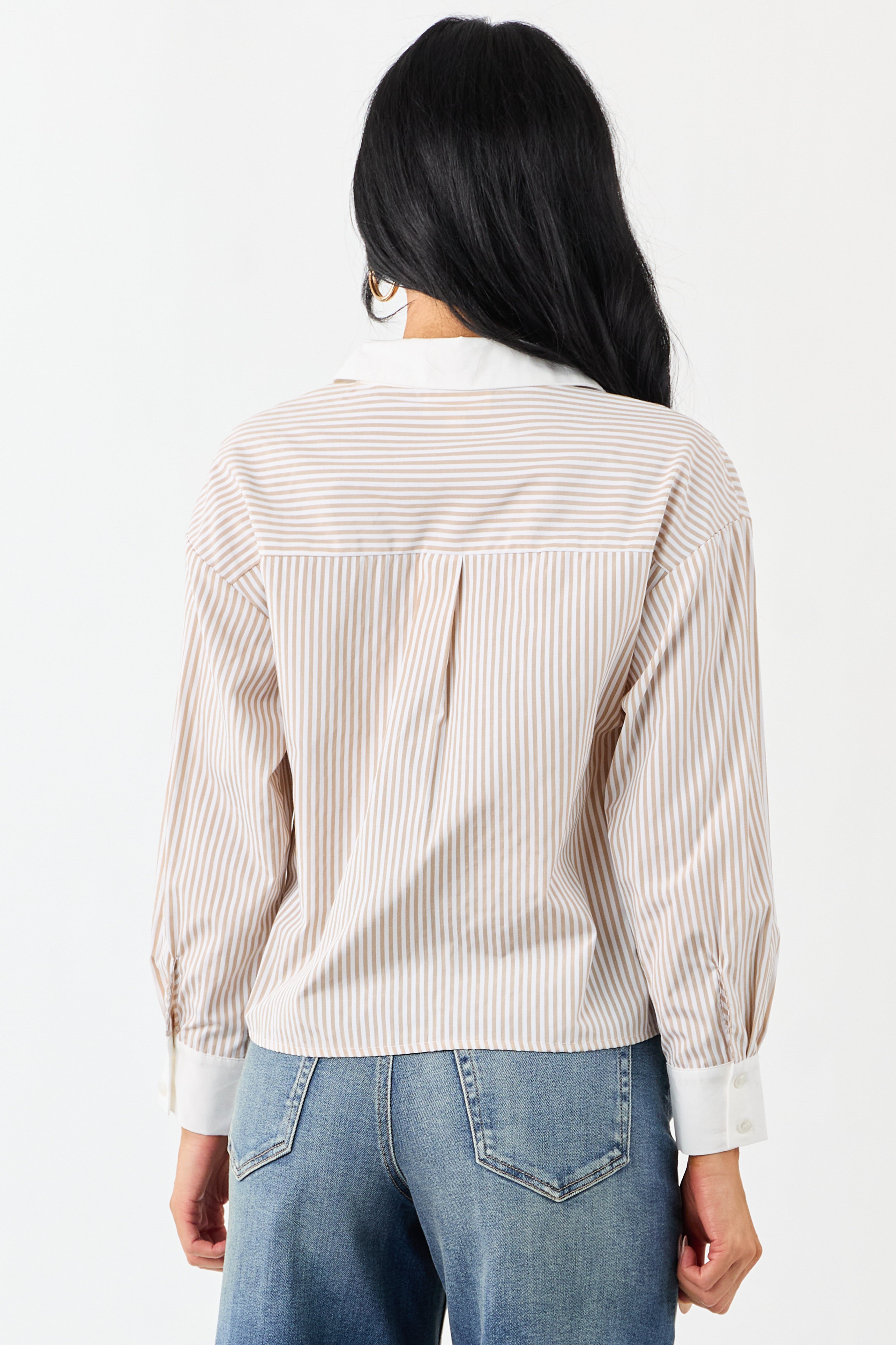 Discover comfort and style with our taupe and white striped cotton button-down top perfect for work or play. This classic piece features double button cuffs and a collared neckline for a timeless look youll love. Made from 100% cotton for a soft, breathable feel. Available in sizes S, M, and L with bust measurements of 40”, 42”, and 44”. Complete your wardrobe with this versatile shirt!
