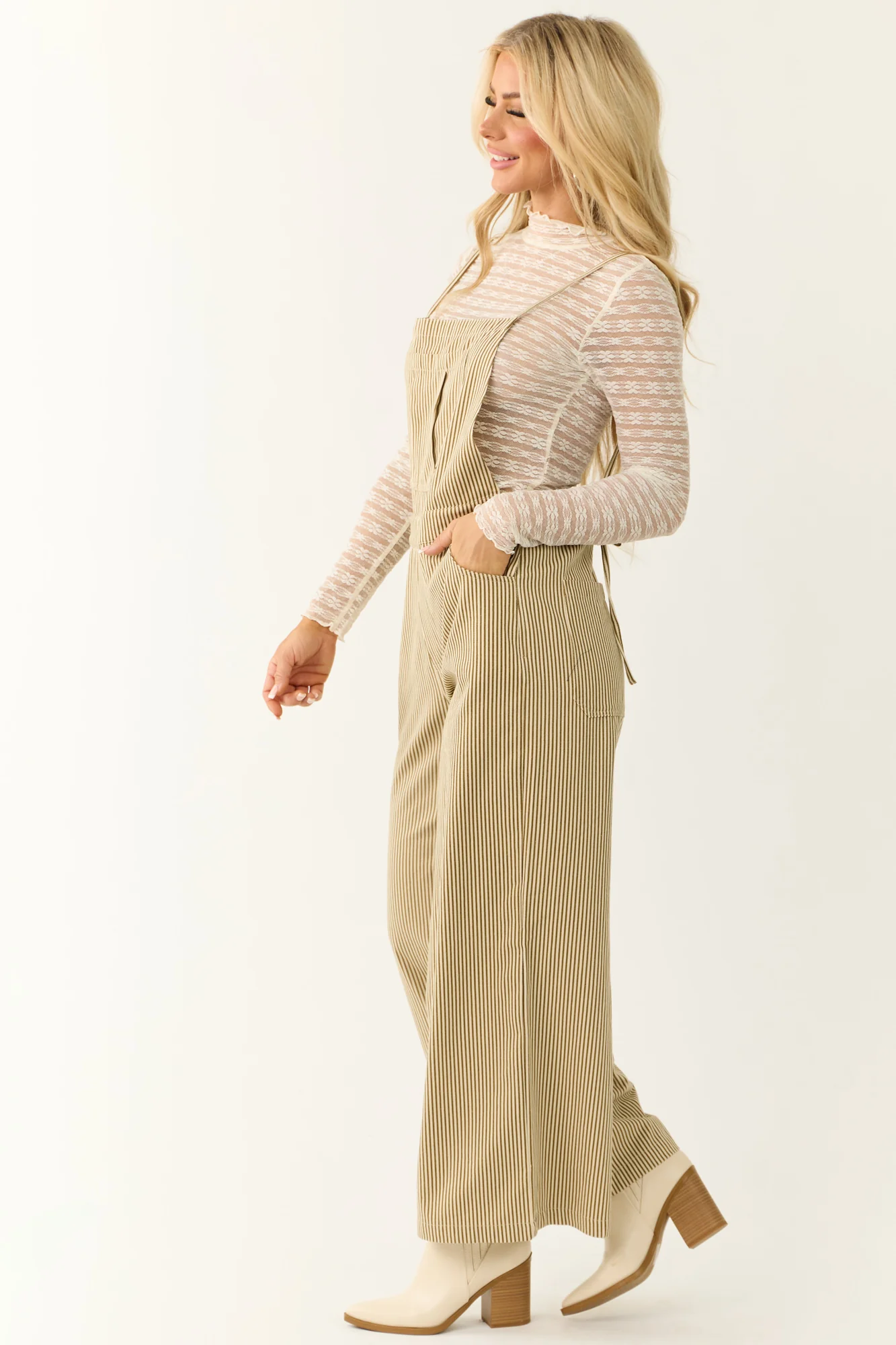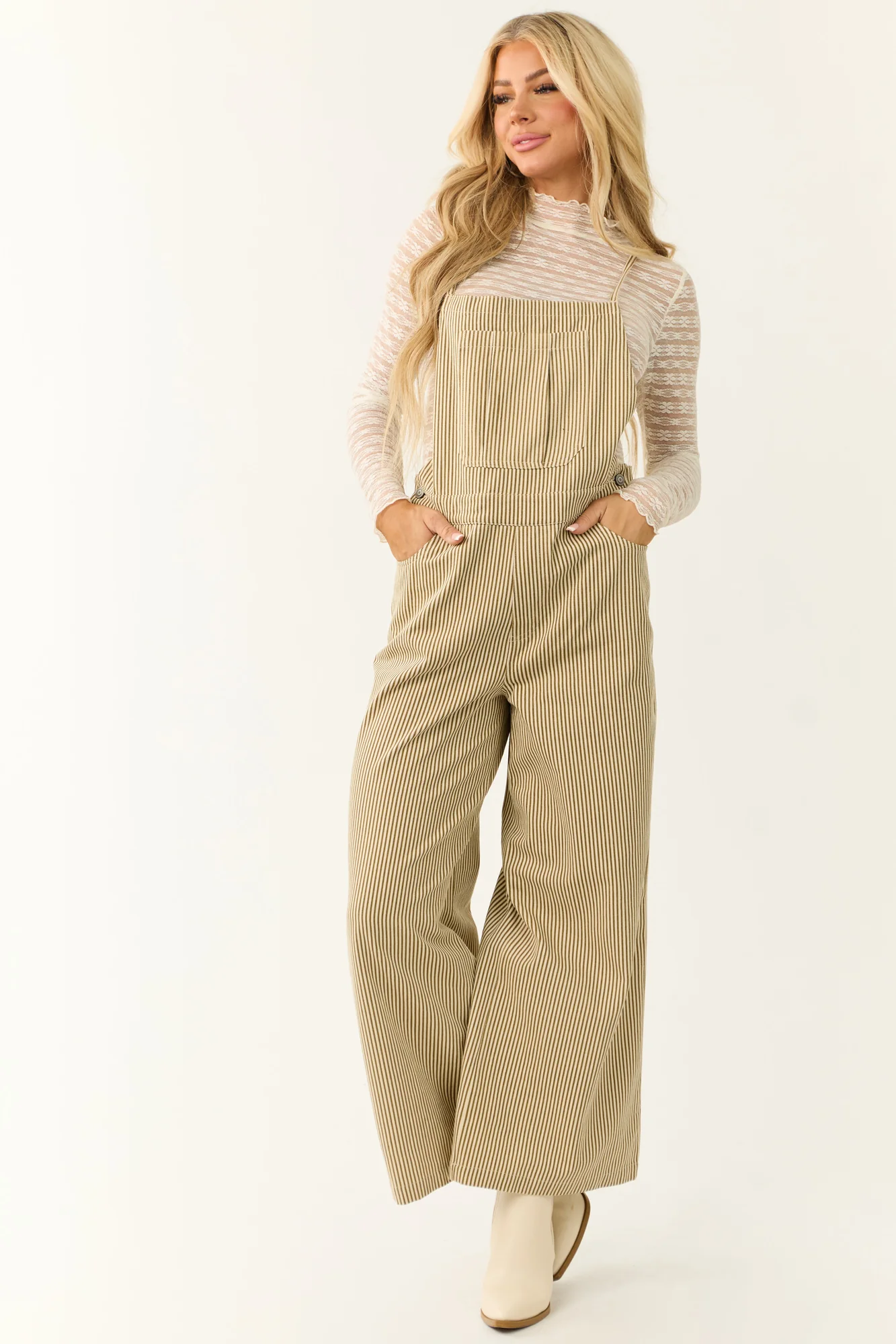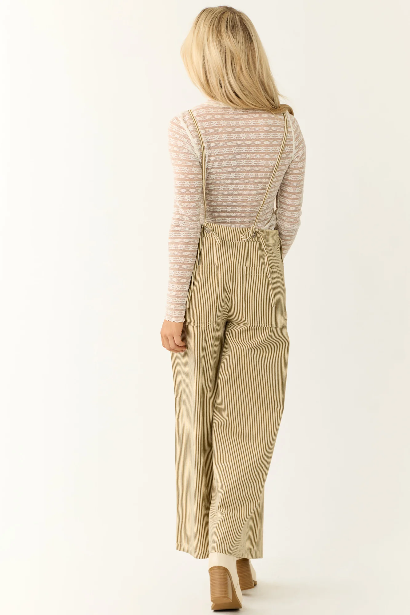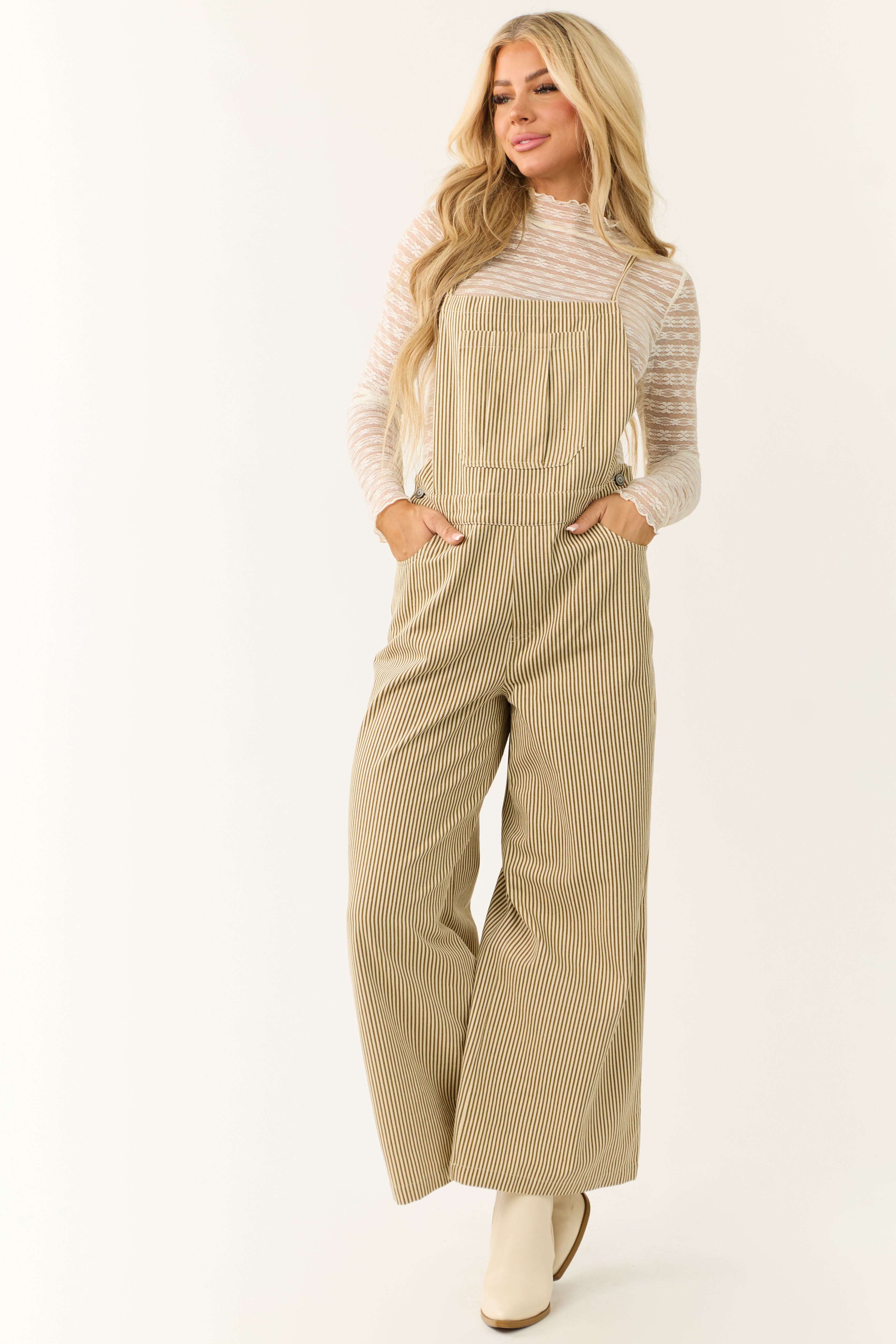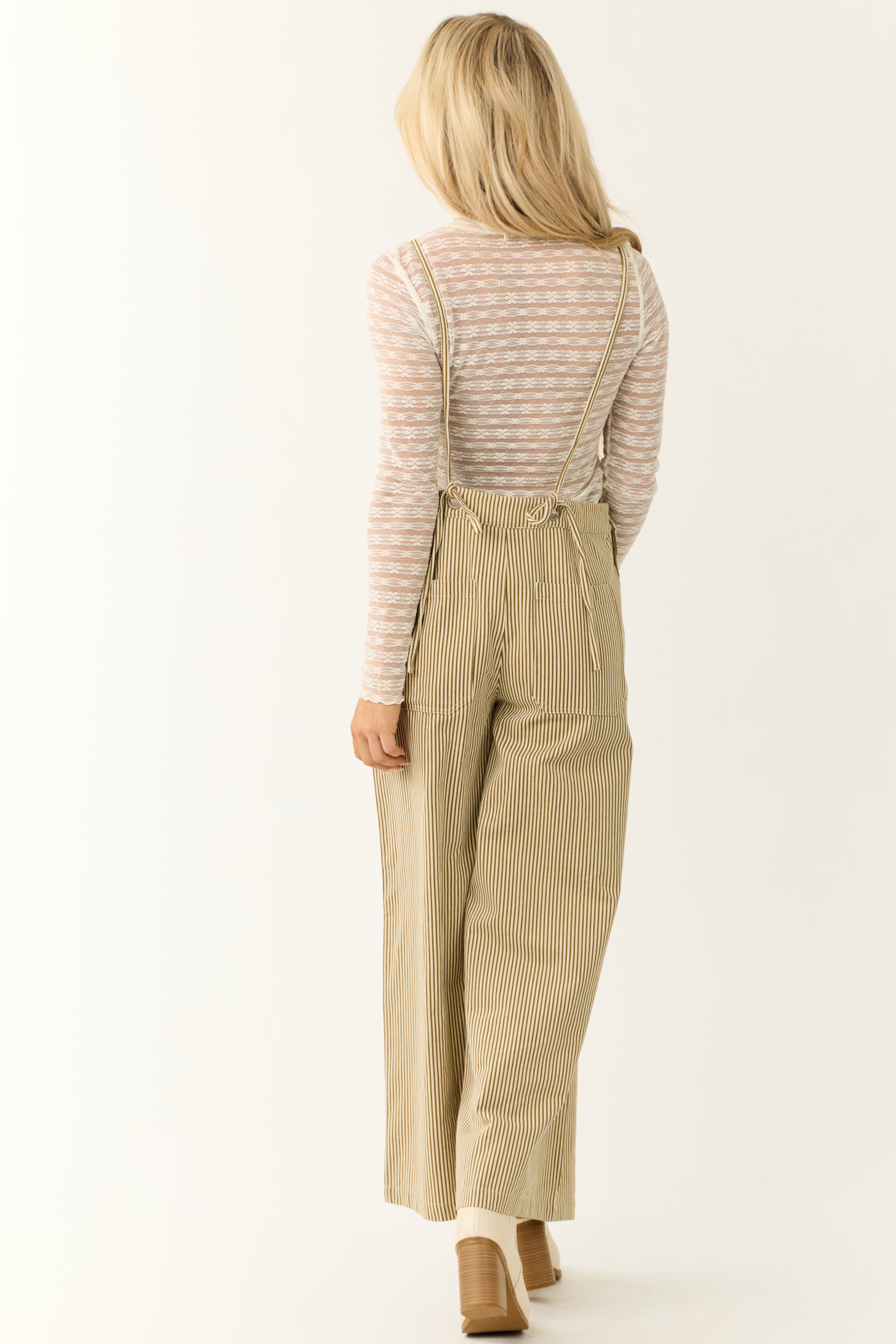 Stay effortlessly stylish in this Taupe Striped Cotton Sleeveless Overalls Jumpsuit . Made with 100% cotton for comfort, this loose fit jumpsuit features a square neckline, side, back, and chest pockets, wide legs, open back, and adjustable straps. Perfect for daytime wear during Fall and Winter. Machine wash cold and line dry for best results. Model is wearing a size Small. Available in sizes S, M, and L.