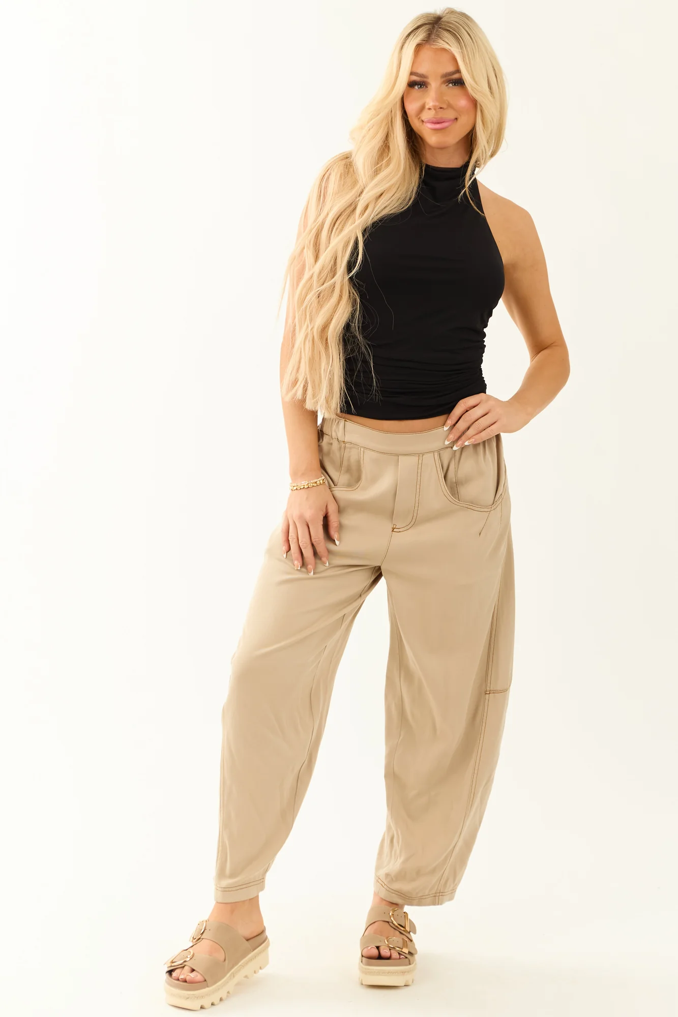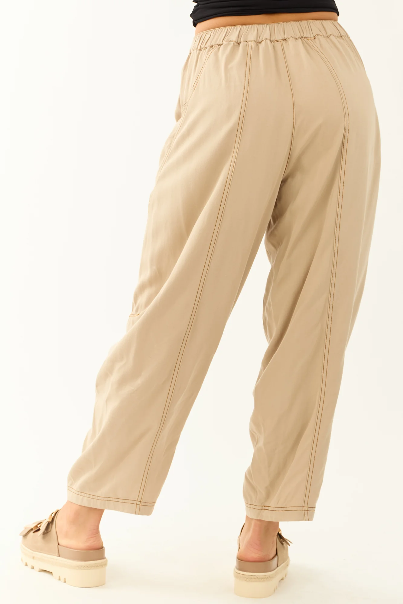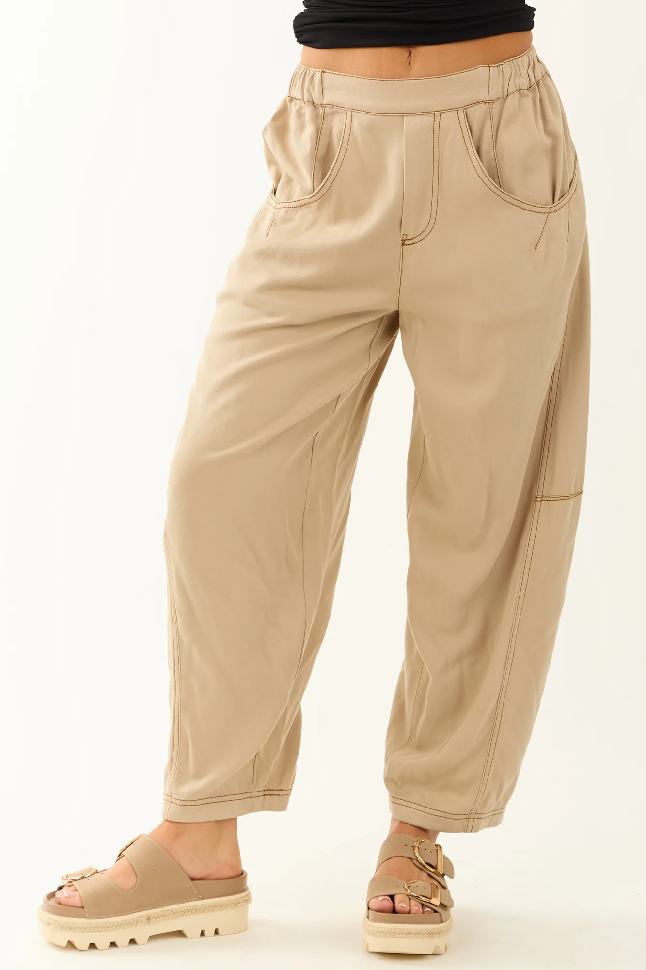 Experience ultimate comfort and style with our Taupe Vintage Soft Elastic Waist Ankle Pants. Crafted from a blend of 70% Rayon and 30% Lyocell, these pants feature a relaxed fit, trending contrast stitching, and an ankle-length design. The elastic waist ensures a comfortable fit, while the two functional front pockets add practicality. Perfect for any occasion, these pants are a must-have for your wardrobe. Care instructions: Hand wash cold, do not bleach, color separate, hang or line dry.