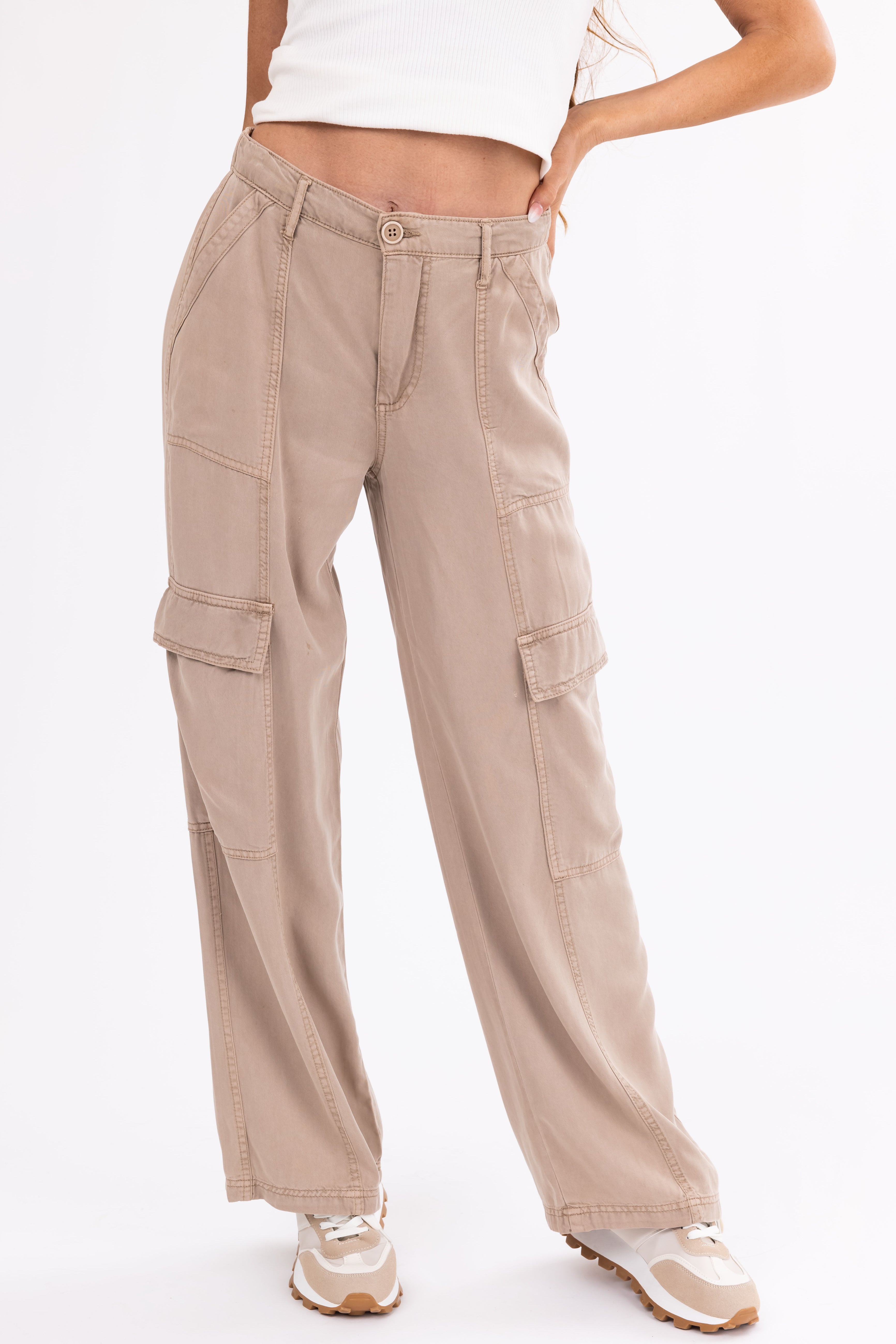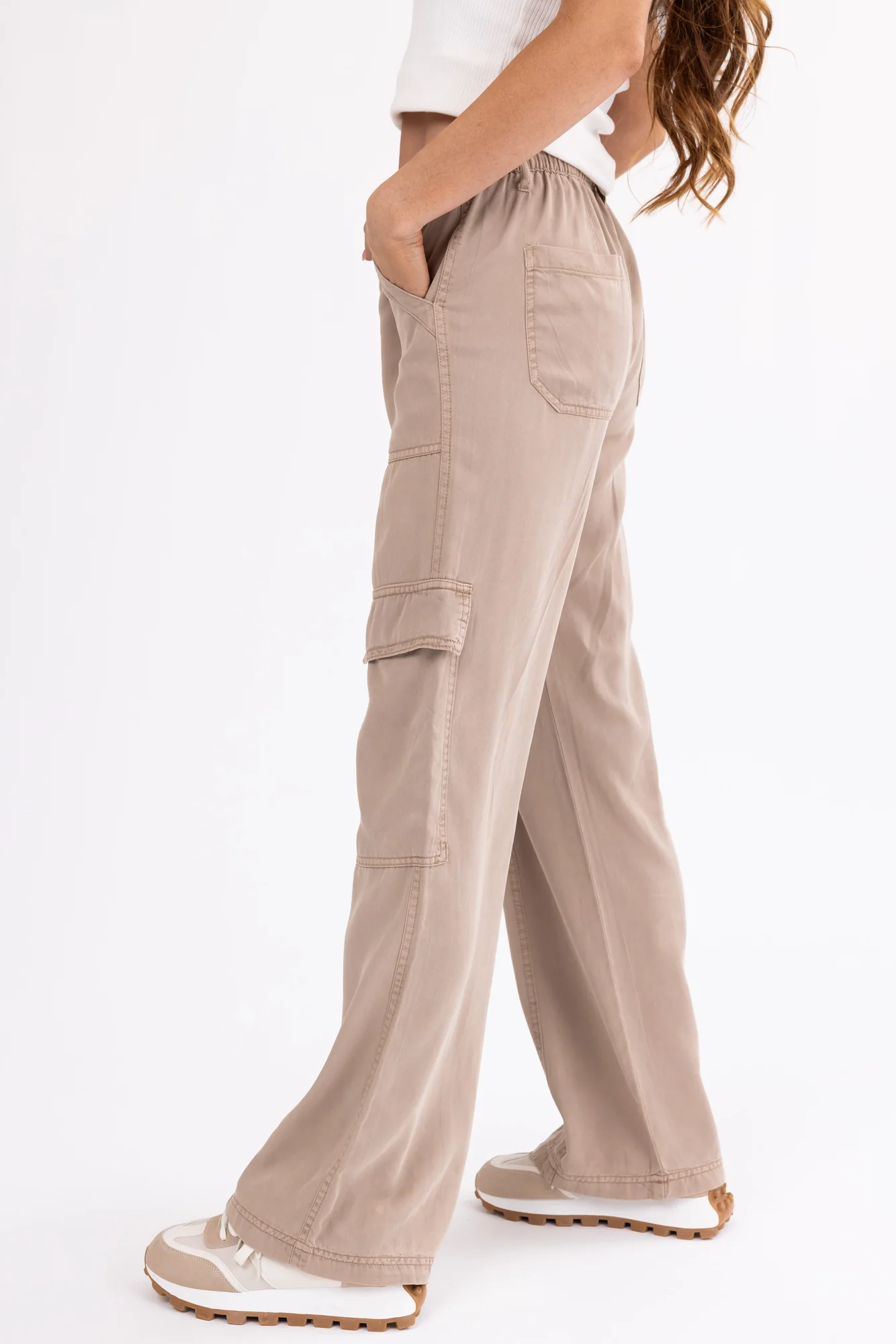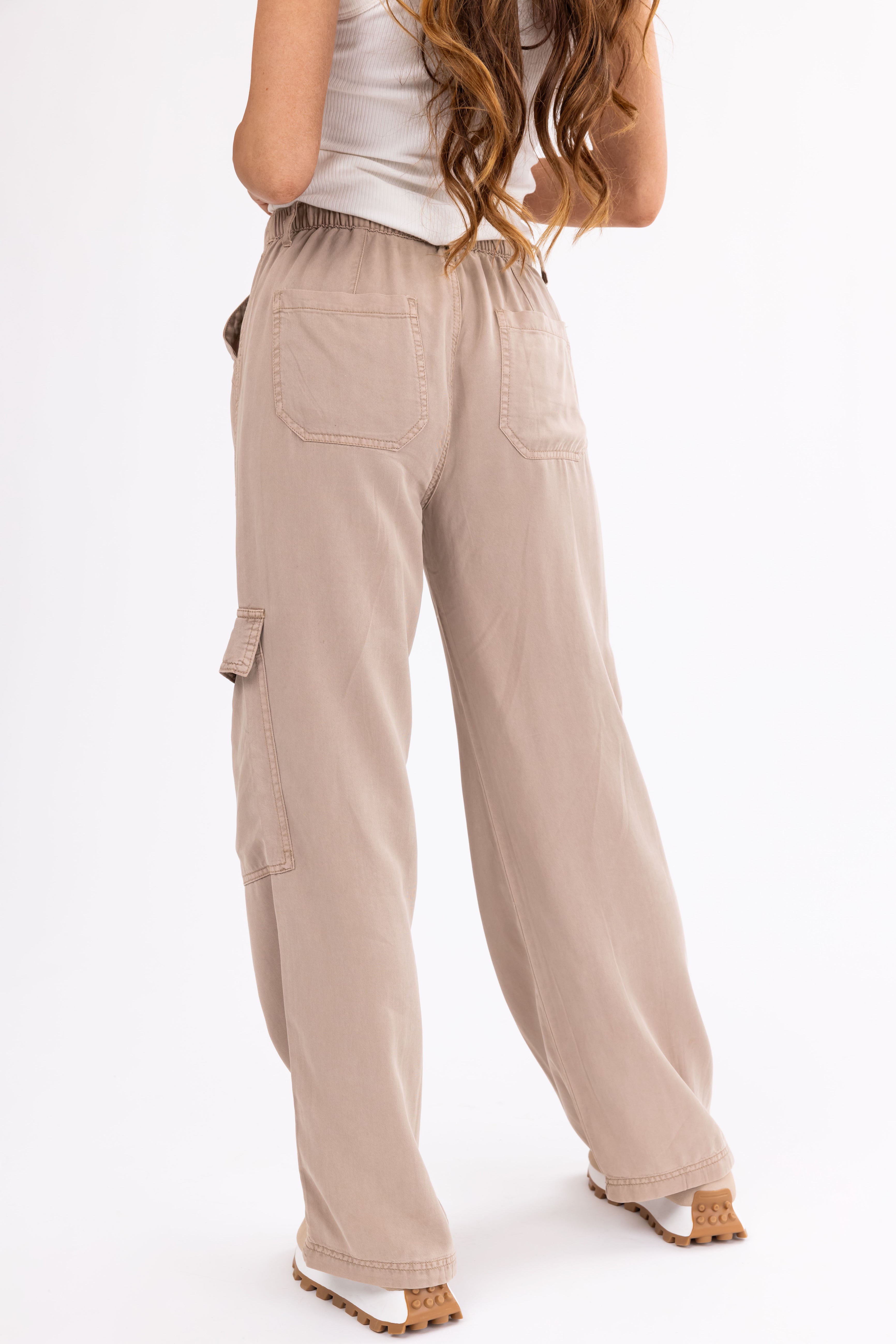 Stay comfortable and stylish with our Taupe Wide Leg Tencel Cargo Pants. Crafted from non-stretchy soft lightweight tencel faux denim, these pants feature a wide leg design, zipper fly with button closure, 4 pockets including 2 cargo pockets, belt loops, and elastic back waist. Perfect for everyday wear, these high-waisted pants have a front rise of 10.5″ and a back rise of 12″. Imported and made of 100% Tencel. Care instructions: Turn inside out, machine wash cold, tumble dry low. Model is wearing a size Small. Model’s Profile: Size 2, Height 58″, Bust 32″, Waist 25″