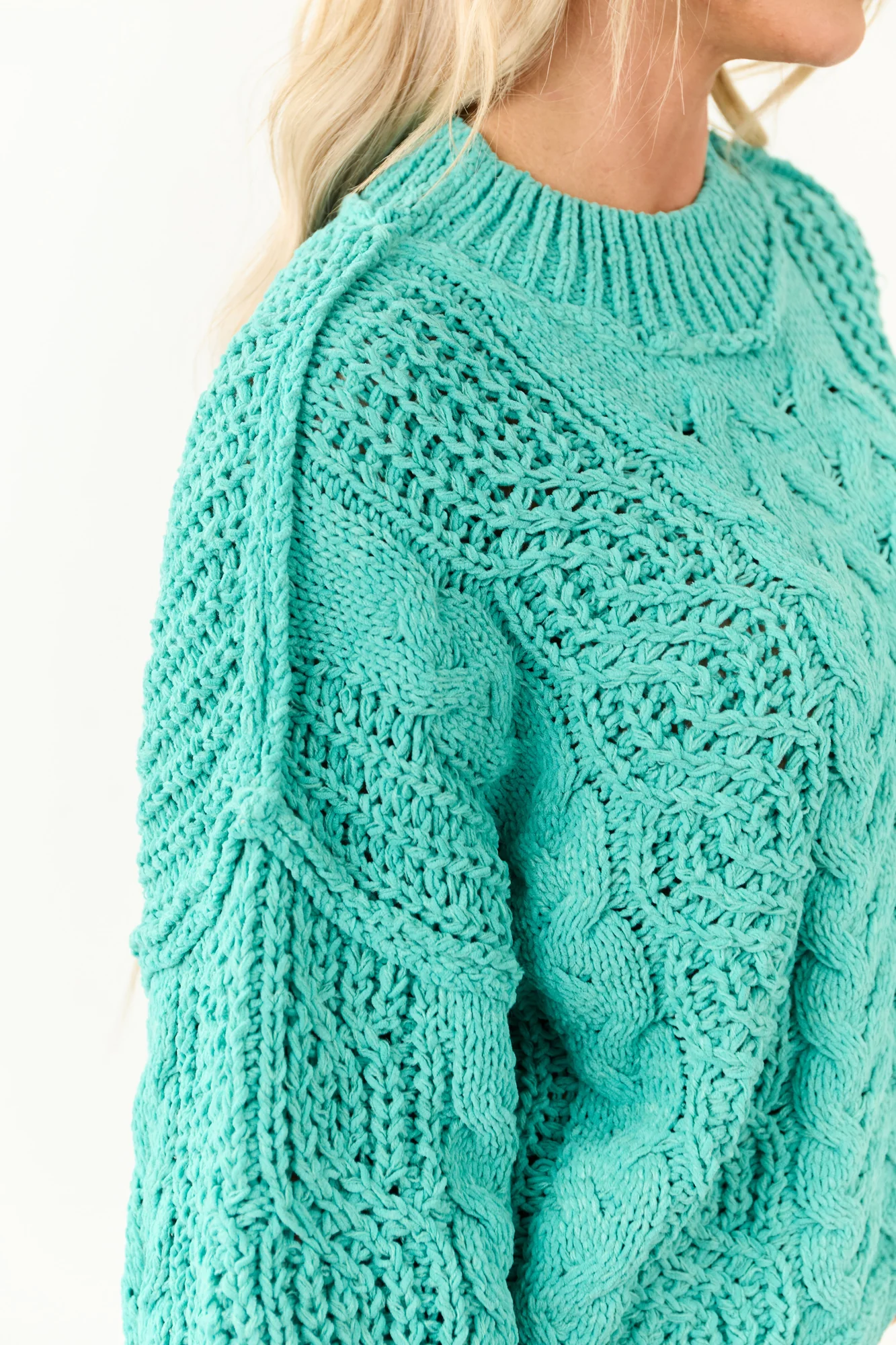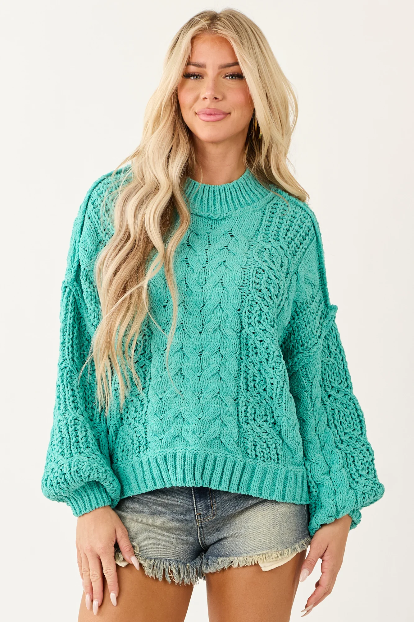 Indulge in comfort with our teal cable knit oversized sweater featuring dramatic bubble sleeves for a bold look. This cozy sweater boasts a soft ribbed banded trim, drop shoulders, and exposed seams for a trendy, chic style. Made of 100% polyester for a stretchy fit thats perfect for any occasion. Available in sizes S, M, and L. Model is wearing size Small.