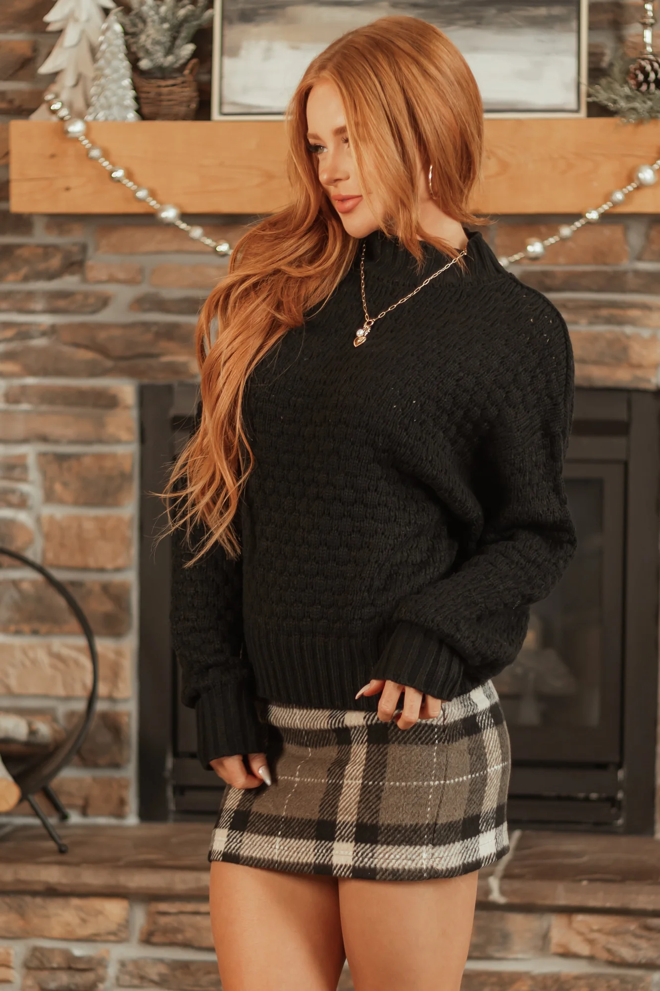 Stay cozy and stylish in this Textured Black High Neck Sweater. Crafted from stretchy ribbed knit with long sleeves and a drop shoulder design for a relaxed fit. Perfect for winter days out or just lounging. Available in sizes S, M, and L. Care instructions: Hand wash cold, dry flat. Model is wearing a size Small. Height: 55″, Bust: 31″, Waist: 24″.