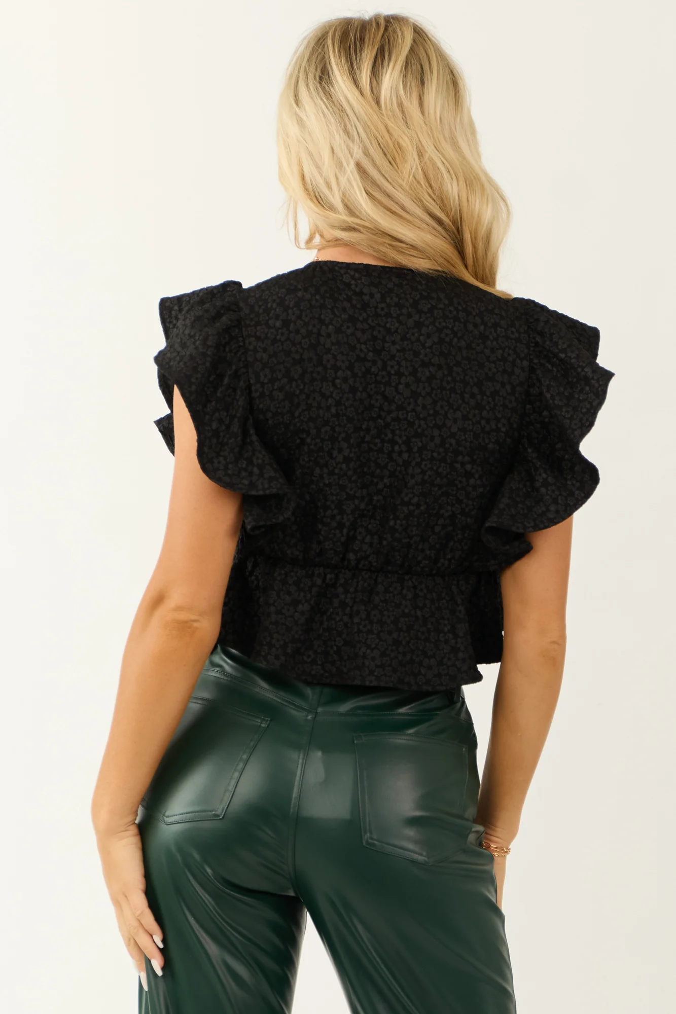 Discover elegance in every detail with our Textured Black Peplum Top featuring charming ruffle sleeves and a flattering V neckline. Made from non-stretchy woven fabric, this top boasts a floral jacquard pattern, adding a touch of sophistication to any ensemble. Stay stylish and comfortable with the lined design crafted from 100% Polyester self and 97% Polyester, 3% Spandex lining. Perfect for any occasion, this top pairs well with your favorite bottoms. Care instructions: Hand wash cold, hang to dry.