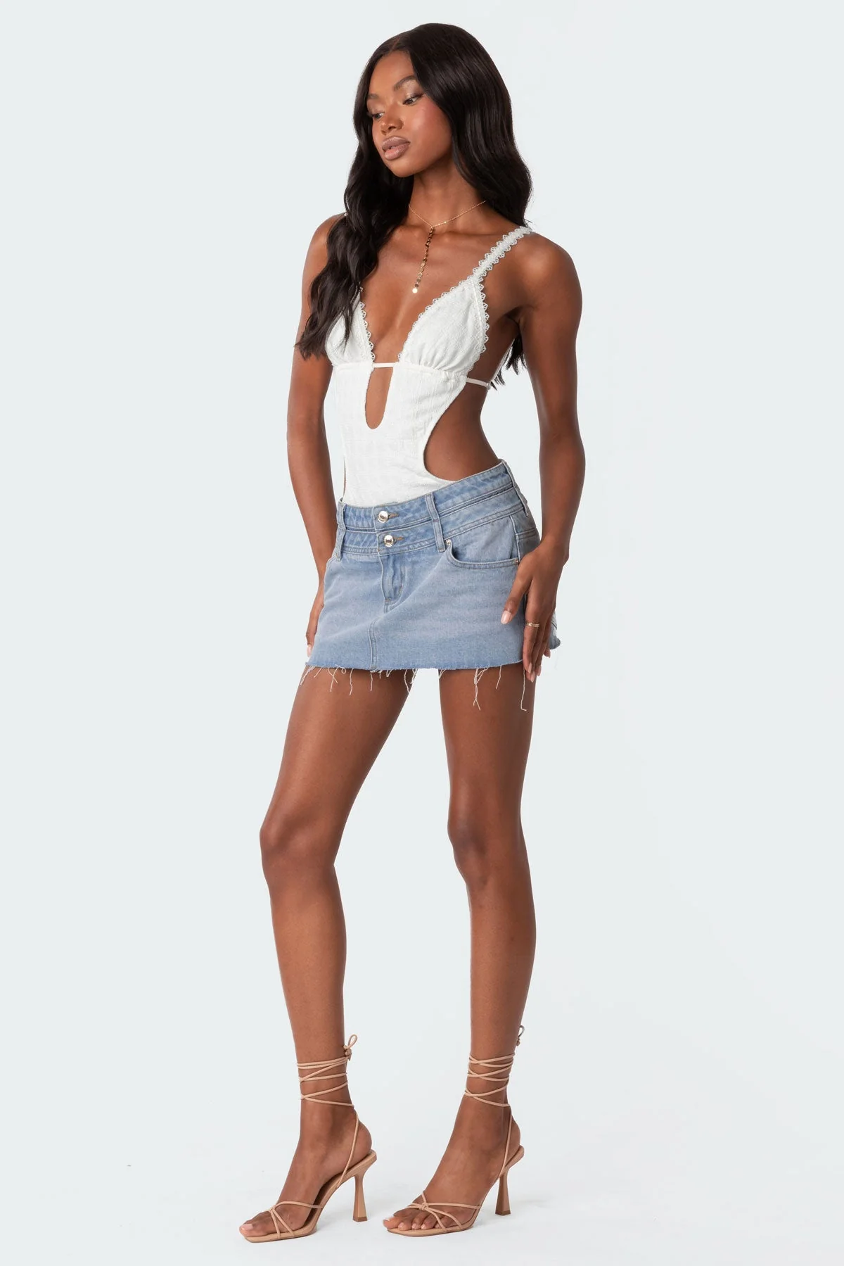 Indulge in the luxurious comfort of our white textured cotton bodysuit featuring elegant cut-out details. The open back design with adjustable straps offers a stylish fit that complements any occasion. Crafted from 100% cotton for a soft feel. This bodysuit is a versatile wardrobe essential that pairs effortlessly with different looks. Model wears size S. Elevate your style with this unique piece. Care instructions: Machine wash with similar colors.