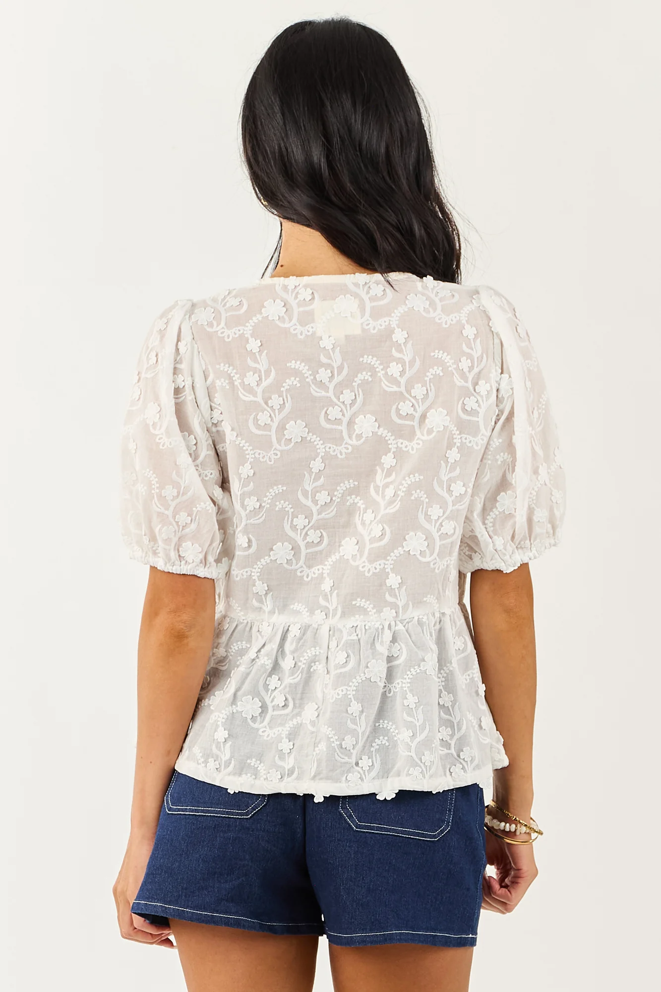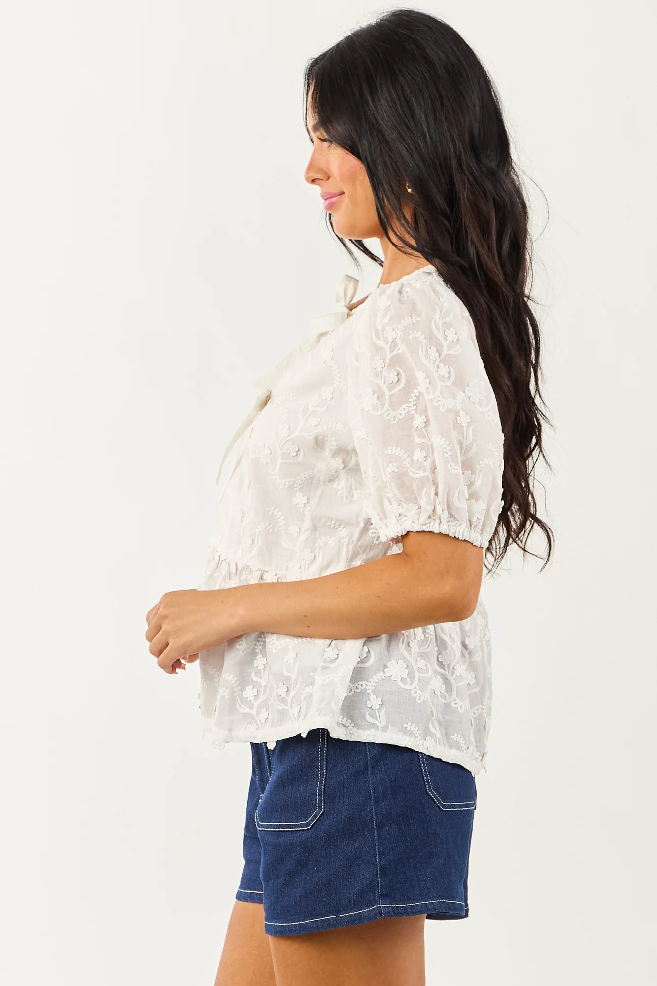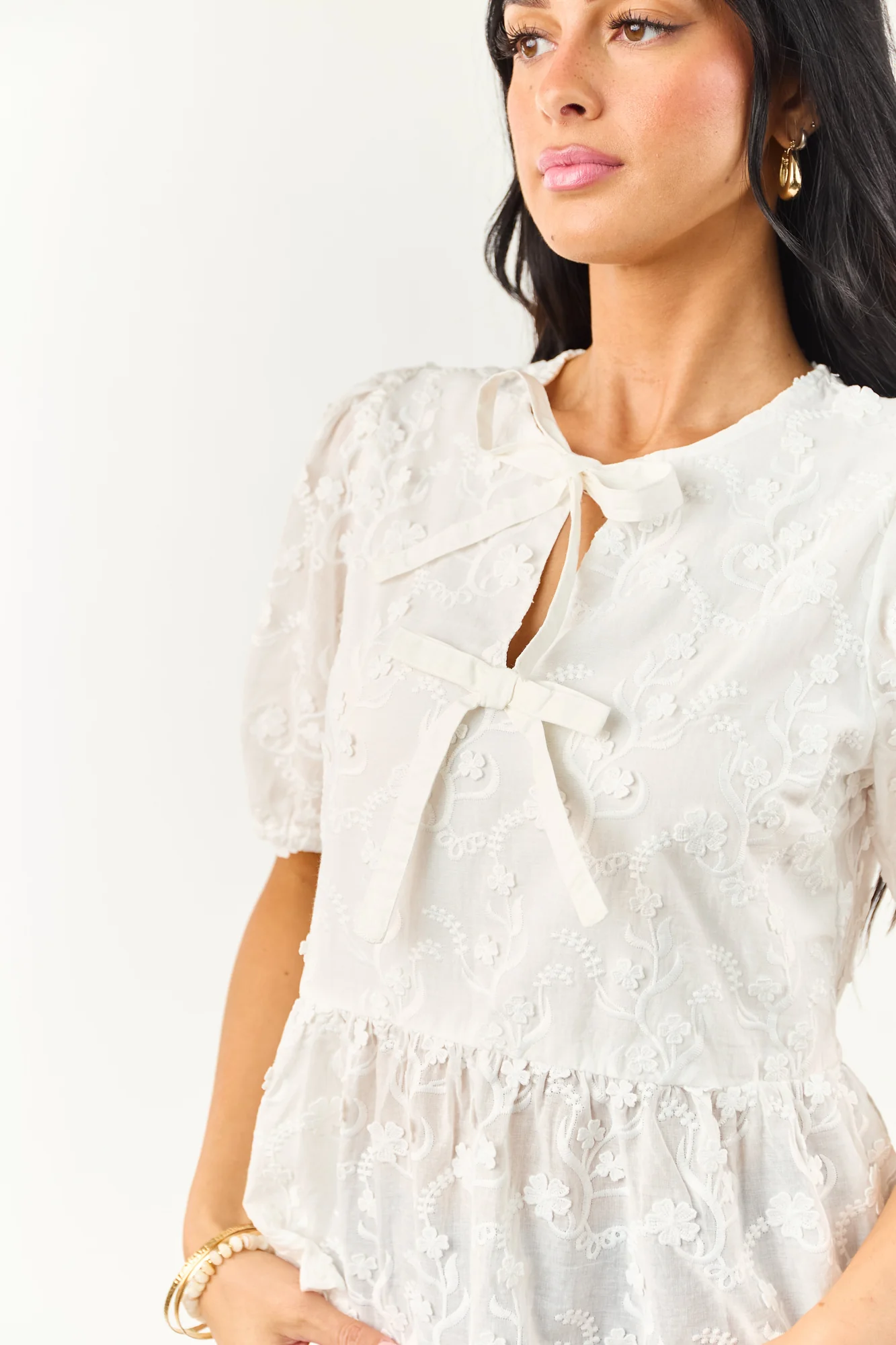 Experience effortless elegance with our Textured Floral Tie Neck Peplum Blouse. Crafted from a non-stretchy cotton blend, this sweet and breezy blouse features a functional tie neckline, decorative bust bow, and a lined front bodice. Perfect for sunny day strolls, this semi-sheer blouse is a must-have addition to your wardrobe. Available in sizes S, M, and L. Model is wearing a size Small. Model’s Profile: Size 1, Height 59″, Bust 34″, Waist 26″. Body: 60% Cotton, 40% Polyester. Contrast: 100% Cotton. Lining: 100% Polyester. Imported.